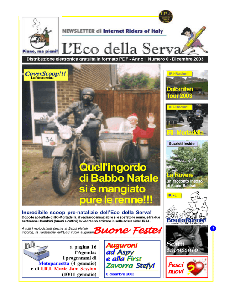 Distribuzione elettronica gratuita in formato PDF - Anno 1 Numero 0 - Dicembre 2003 CoverScoop!!! La fotocopertina IRI-Raduni Dolomiten Tour 2003 IRI-Raduni IRI - Mortadella Guzzisti inside Quell’ingordo di Babbo Natale si è mangiato pure le renne!!! La Rovere un racconto inedito di Fabio Baldrati IRI-L Incredibile scoop pre-natalizio dell’Eco della Serva! Dopo le abbuffate di IRI-Mortadella, il vegliardo insaziabile si è sbafato le renne, e fra due settimane i bambini (buoni e cattivi) lo vedranno arrivare in sella ad un side URAL. Braulio Runner! Buone Feste! 1 A tutti i motociclanti (anche ai Babbi Natale ingordi), la Redazione dell’EdS vuole augurare a pagina 16 l’Agenda: i programmi di Motopancetta (4 gennaio) e di I.R.I. Music Jam Session (10/11 gennaio) Auguroni ad Aspy e alla alla First First Zavorra Stefy Stefy!! 6 dicembre 2003 Scatti del passato Pesci nuovi ? by Aspy Presidente di IRI EDITORIALE SOMMARIO Party di Natale Cari Amici, vi presento il primo (speriamo anche non l’ultimo, ma dipende soprattutto da Voi!) numero della Newsletter IRI. Notizie, raduni, foto, messaggi che non meritano di essere dimenticati, articoli tecnici... C’è spazio per tutto e per tutti in questo che sarà la nostra “banca dati dei ricordi”, ma non solo! Su suggerimento di Gattostanco, nostro esimio Redattore Capo, sono andato a rileggermi lo storico dei messaggi del 1996... Ah, che emozione rileggere il primo messaggio ufficiale, quello che annunciava la nascita del motoclub... E le discussioni sul nome... Internet Riders of Italy: qualcuno sicuramente si ricorda, ma chi non c’era si sganascerà dal ridere nel leggere nella “storia a puntate di IRI” i nomi che furono proposti :-) Dal 1996 ad oggi tanti km sono corsi sotto le nostre ruote. Abbiamo avuto momenti belli e momenti brutti, Convenzioni I.R.I. situazioni di tensione, siamo stati addirittura sul punto di chiudere baracca e burattini e buttare la chiave (del quadro della moto) e qualcuno lo ha anche fatto. Ma il fatto di essere ancora qui, di crescere, proporre, realizzare nuove cose dimostra senza ombra di dubbio che quell’estate di sette anni fa venne realizzato qualcosa di veramente valido. E’ forse il momento di fare ancora un passo in avanti. L’inizitiva che parte con questo “Giornalino di Gianburrasca” ha come scopo quello di unire ancora di più i Soci sparsi per L’Italia (e fuori!) e tutti noi speriamo che da questa nascano altre idee e proposte, sia rivolte al Motoclub ed ai Soci, sia rivolte al mondo della Moto in generale. Non dimentichiamoci che siamo stati i primi a creare un Motoclub Virtuale. Abbiamo aperto una strada, e vogliamo ancora percorrerla. Chiudo con un ricordo pesca- Eco della Serva dicembre 2003 - nr. zero to nello storico. Siamo nel 1996. Il 14 dicembre sulla lista Motoclub, ospitata allora da Mclink, passava questo messaggio: “Party di Natale. Allora, Gente! È natale, e come d’obbligo ci ritroveremo per passare una piacevole serata in compagnia per scambiarci gli auguri e le promesse di essere più buoni l’anno prossimo (!)... L’appuntamento è fissato per VENERDI’ 20 DICEMBRE, alle ore 20:30 a casa di FRANCESCO MILONE, che ha gentilmente messo a disposizione dei soci dell’Internet Riders of Italy la sua villetta. Adesioni in area, fate in fretta! Ricordo che sono invitati d’ufficio tutti i soci e le zavorre ufficiali, nonché i partner dei soci. Per il momento... AUGURI!” Il primo PRENATAL era nato. Ci vediamo alla edizione 2003! Editoriale Tutte le Convenzioni 2 Braulio Runner 3 Dolomiten Tour 2003 5 Qualche chilometro prima del Dolomiten Tour 8 La Rovere Racconto di Fabio Baldrati 9 IRI - Mortadella 11 Rubriche Pesci nuovi? L’angolo della poesia Scatti del passato 15 Rubriche Agenda 16 PIANO, MA PIENI! L’elenco degli esercizi convenzionati Hannibal Lake Travels di Pennacchio Silvana & C. s.n.c. Agenzia di viaggi e tursmo Indirizzo: A. Baldoni 2, Passignano sul Trasimeno (PG) www.hannibaltravels.com Tel. 075-829087 Fax: 075829088 Sconto 50% sulla quota di iscrizione Produzione di borse ed accessori Via Cacciamali, 30/A 25125 Brescia - Italy www.vanessa-roadline.it Tel. 030 3544446 Fax 3547267 S O L O M O T O Via Turati, 1 - 40026 Imola www.motoactionimola.it Tel. 0542.642.330 Fax 645.363 Abbigliamento, accessori. Vendita on line. Sconti dal 20% al 30% oltre a promozioni speciali. Via Aurelia, 477 00165 ROMA Tel. (06)66000547, 6638810 Fax (06) 66016745 Sconto del 20% su tutti gli articoli di abbigliamento e sugli accessori. Moto By Casablanca di Raffaele Amoruso Largo Magna Grecia, 8 00183 ROMA Tel. (06) 77205559 Sconto del 10% su tutti gli articoli di abbigliamento e sugli accessori e condizioni estremamente vantaggiose sull'articolo del mese. ENOTECA LA CANTINOLA di Massimo Lanzi Viale Ippocrate, 17 00162 ROMA Tel. (06) 44236384 Sconto del 10% sui vini Sconto del 15% su liquori e champagne Preparazione di confezioni natalizie, consegne a domicilio. EURO GOMME L.go Rodolfo Lanciani, 29-30/A 00162 ROMA Tel. (06) 8604449 Sconto del 30% sul prezzo di listino ufficiale degli pneumatici delle seguenti marche: Pirelli, Michelin, Dunlop, Bridgestone, Metzeler. Il prezzo è comprensivo di montaggio ed equilibratura. Servizio di riparazione pneumatici gratuito per tutti i soci. Equilibratura stroboscopica omaggio per i soci che faranno visita alla Ditta. Pistola Moto Design di Sergio Venturini Via dei Laterizi, 28 00167 ROMA Tel. (06) 39732066 Prezzi inferiori del 20-25% rispetto ai listini ufficiali per riparazioni e verniciature. Ulteriori sconti ai soci alla presentazione della tessera 2 by Roberto “Gogo” Garlato Selezione da IRI-L Braulio Runner! Il primo capitolo di una saga, nella quale vengono ritratti alcuni tipi di motociclista. Ogni riferimento a fatti, difetti, vizi o virtù di qualcuno dei soci e simpatizzanti I.R.I. è puramente casuale. Era una mattina qualunque, una di quelle nelle quali il grigio della città era talmente scuro da giocare di f