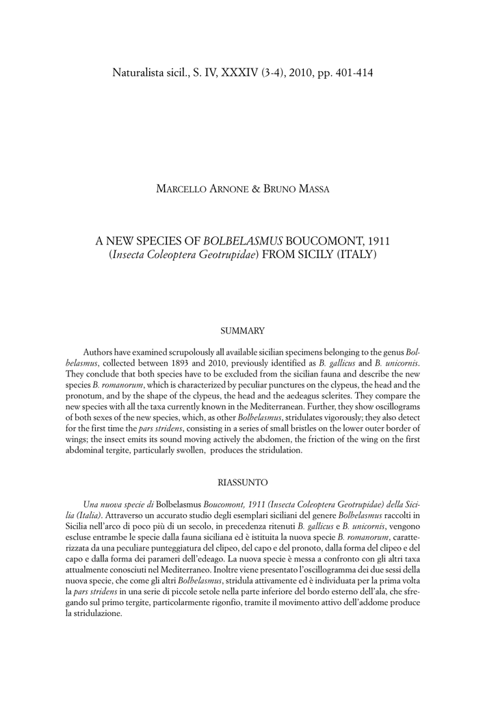Naturalista sicil., S. IV, XXXIV (3-4), 2010, pp. 401-414 MARCELLO ARNONE & BRUNO MASSA A NEW SPECIES OF BOLBELASMUS BOUCOMONT, 1911 (Insecta Coleoptera Geotrupidae) FROM SICILY (ITALY) SUMMARY Authors have examined scrupolously all available sicilian specimens belonging to the genus Bolbelasmus, collected between 1893 and 2010, previously identified as B. gallicus and B. unicornis. They conclude that both species have to be excluded from the sicilian fauna and describe the new species B. romanorum, which is characterized by peculiar punctures on the clypeus, the head and the pronotum, and by the shape of the clypeus, the head and the aedeagus sclerites. They compare the new species with all the taxa currently known in the Mediterranean. Further, they show oscillograms of both sexes of the new species, which, as other Bolbelasmus, stridulates vigorously; they also detect for the first time the pars stridens, consisting in a series of small bristles on the lower outer border of wings; the insect emits its sound moving actively the abdomen, the friction of the wing on the first abdominal tergite, particularly swollen, produces the stridulation. RIASSUNTO Una nuova specie di Bolbelasmus Boucomont, 1911 (Insecta Coleoptera Geotrupidae) della Sicilia (Italia). Attraverso un accurato studio degli esemplari siciliani del genere Bolbelasmus raccolti in Sicilia nell’arco di poco più di un secolo, in precedenza ritenuti B. gallicus e B. unicornis, vengono escluse entrambe le specie dalla fauna siciliana ed è istituita la nuova specie B. romanorum, caratterizzata da una peculiare punteggiatura del clipeo, del capo e del pronoto, dalla forma del clipeo e del capo e dalla forma dei parameri dell’edeago. La nuova specie è messa a confronto con gli altri taxa attualmente conosciuti nel Mediterraneo. Inoltre viene presentato l’oscillogramma dei due sessi della nuova specie, che come gli altri Bolbelasmus, stridula attivamente ed è individuata per la prima volta la pars stridens in una serie di piccole setole nella parte inferiore del bordo esterno dell’ala, che sfregando sul primo tergite, particolarmente rigonfio, tramite il movimento attivo dell’addome produce la stridulazione. 402 M. ARNONE & B. MASSA INTRODUCTION Even if SCHOLTZ & BROWN (1996) and KRÁL et al. (2006) have proposed for Bolboceratinae (Geotrupidae) the rank of family, not all authors agree with this taxonomical proposal (e.g., VERDÚ et al., 1998). Bolboceratinae have a worldwide distribution, and the genus Bolbelasmus Boucomont, 1911 covers Palearctic and Nearctic regions. Species of this genus have been found borrowing to different species of hypogeous fungi, are mainly crepuscular and nocturnal and are attracted to light. Further, they stridulate vigorously (FABRA, 2003). In accordance with KRIKKEN (1977), up to day five species have been recorded in Europe, W-Asia and N-Africa, namely B. bocchus (Erichson, 1841), B. gallicus (Mulsant, 1842), B. nireus (Reitter, 1895), B. tauricus Petrovitz, 1973 and B. unicornis (Schrank, 1789). We had the chance to put together a series of specimens collected in Sicily (Italy), belonging to a species which resulted different from those already known in the Mediterranean area. In the present paper we describe it as a new species. MATERIAL AND METHODS Specimens examined are listed below. Series of images of specimens with different focal planes were taken by M. Romano using a Canon Eos 450D digital camera mounting a Sigma 70 mm 1:2.8 DG macro, and were integrated using the freeware Helicon Focus (http://d-studio.com.ua/products/helicon_focus/download/index.html). Measurements on mounted specimens were taken using a digital calliper (preciseness 0.01 mm) and a stereomicroscope. Aedeagi were drawn by M.A., after re-hydration in physiological solution. Two males and two females were recorded separately in the laboratory to restrict interactions by a digital recorder (Edirol R09HR) and sampled fragments from the recordings were analysed with the Cool Edit software. Three specimens were reared in laboratory to observe their behaviour and when they were producing sounds. Abbreviations of Museums. MHNG = Museum d’Histoire Naturelle, Genève; MRSNT = Museo Regionale di Scienze Naturali, Turin; MSNG = Museo Civico di Storia Naturale ‘G.Doria’, Genoa; MZUCT = Museo di Zoologia dell’Università, Catania; MZUF = Museo di Zoologia La Specola dell’Università, Florence; MZUPA = Museo di Zoologia dell’Università ‘P.Doderlein’, Palermo. A new species of Bolbelasmus Boucomont, 1911 from Sicily 403 RESULTS AND DISCUSSION Previous records of Bolbelasmus in Sicily RAGUSA (1893) was the first entomologist who collected a species of Bolbelasmus in Sicily. He sent the specimen, a female, to E. Reitter, who tentatively identified it as Bolbelasmus gallicus, and wrote on a label that the study of the male was needed to confirm his identification (ARNONE, 2010). When Ragusa obtained the male, was convinced that it belonged to B. gallicus and without consulting again Reitter, decided to publish the record. Thus, this species was reported within the catalogues of LUIGIONI (1929), PORTA (1932) and AGOGLITTA et al. (2006), without checking the specimens preserved in the Ragusa collection. In 1974 B.M. collected on the sandy coast of Balestrate (Palermo) (by daylight, not attracted to the light, as reported by AGOGLITTA et al., 2006) another male, finding that characters of the scutellum and the head pattern did not overlap with characteristics of B. gallicus. That specimen was examined and identified by Jacques Baraud as B. unicornis (BARAUD, 1977). Since 1974 few specimens of Bolbelasmus were found (cf. ALIQUÒ, 1988, who recorded it as B. gallicus; AGOGLITTA et al., 2006, who identified two specimens as B. unicornis1). By chance, in the last years a series of specimens was collected, attracted by the light in the night or found during the day on sand soils. Thus, it was possible to dispose of so
