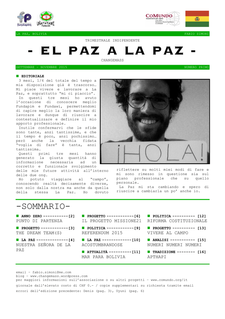 LA PAZ, BOLIVIAX FABIO SIMONI TRIMESTRALE INDIPENDENTE - EL PAZ A LA PAZ CHANGEMASS SETTEMBRE – NOVEMBRE 2015X NUMERO PRIMO n EDITORIALE 3 mesi, 1/4 del totale del tempo a mia disposizione già è trascorso… Mi piace vivere e lavorare a La Paz, e soprattutto “mi ci piaccio”. In questi tre mesi ho avuto l’occasione di conoscere meglio Fundapim e Fundawi, permettendomi di capire meglio la loro maniera di lavorare e dunque di riuscire a contestualizzare e definire il mio apporto professionale. Inutile confermarvi che le sfide sono tante, anzi tantissime, e che il tempo è poco, anzi pochissimo… però anche la vecchia fidata “voglia di fare” è tanta, anzi tantissima. Questi primi tre mesi hanno generato la giusta quantità di informazione necessaria ad un corretto e funzionale svolgimento delle mie future attività all’interno delle due ong. Ho potuto viaggiare al “campo”, conoscendo realtà decisamente diverse, non solo dalla nostra ma anche da quella della stessa La Paz. Ho dovuto riflettere su molti miei modi di fare e mi sono rimesso in questione sia sul piano professionale che su quello personale. La Paz mi sta cambiando e spero di riuscire a cambiarla un po’ anche io. -SOMMARIOn ANNO ZERO ----------- [2] n PROGETTO ------------[6] n POLITICA ---------- [12] PUNTO DI PARTENZA IL PROGETTO MISSIONE21 RIFORMA COSTITUZIONALE n PROGETTO ------------ [3] n POLITICA ------------[9] n PROGETTO ---------- [13] THE DREAM TEAM(S) REFERENDUM 2015 VIVERE AL CAMPO n LA PAZ -------------- [4] n LA PAZ -------------[10] n ANALISI ----------- [15] NUESTRA SEÑORA DE LA PAZ ACOSTUMBRANDOSE NUMERI NUMERI NUMERI n ATTUALITÀ ----------[11] n TRADIZIONE -------- [16] MAR PARA BOLIVIA APTHAPI email – [email protected] blog – www.changemass.wordpress.com per maggiori informazioni sull’associazione o su altri progetti – www.comundo.org/it giornale dall’elevato costo di CHF 0.- / copie supplementari su richiesta tramite email errori dell’edizione precedente: Denis (pag. 3), Uyuni (pag. 6) - EL PAZ A LA PAZ - SETTEMBRE – NOVEMBRE 2015 [2 ] n ANNO ZERO -PUNTO DI PARTENZAPRONTI AD ARRIVARE… È il 23 agosto 2015, ore 14 in punto, principali di La Paz. In effetti ho arrivo con i miei genitori all’aeroporto dovuto stare tranquillo, praticamente a di Milano Malpensa. Mancano 5 ore alla letto, per circa 10 giorni, tempo che partenza, troppa voglia di partire o l’antibiotico facesse effetto. calcolato male i tempi? Probabilmente un po’ di entrambi… Circa 25 ore di viaggio, scali OSPEDALE PUBBLICO “ARCO IRIS” compresi, di cui l’ultima ora Se vi dico che l’ospedale pubblico boliviano passata su di un coccodrillo di è differente da quello svizzero ci credete? lamiera che da Santa Cruz (Bolivia) Una volta ritirato il mio ticket alla mi ha portato, non mi spiego reception e pagato 60 bolivianos (~9 CHF) per tutt’ora bene come, all’aeroporto la visita medica mi sono diretto alla sala internazionale di El Alto. d’attesa. Almeno un centinaio di persone Recuperata la mia valigia (una aspettavano il proprio turno, bambini che delle prime a uscire dal magico correvano, altri che piangevano, persone buco del nastro trasportatore!!!), anziane che dormivano sulle panchine, gente ho potuto varcare, non senza un po’ che tossiva, altra che sospirava, e molta di ansia, la porta che finalmente altra ancora. Dall’altra parte 15 dottori mi introduceva ufficialmente su circa cercavano di tenere il ritmo imposto suolo boliviano. dai continui nuovi arrivi. Alla fine del tunnel, scusatemi Mi sono subito chiesto quando sarebbe l’espressione, c’era ad aspettarmi arrivato il mio turno, alla fine ho però Socrates, direttore di Fundapim. dovuto aspettare solamente un’ora prima di Non sono riuscito a capire vedere un dottore. esattamente dove mi trovavo che già eravamo in macchina, sfrecciando Malgrado la bronchite e soprattutto tra le strade tutte uguali di El Alto, a grazie al prezioso aiuto cibernetico di destinazione di La Paz. Camilla sono poi riuscito a trovare un Al momento di cominciare la discesa appartamento tutto mio nella zona nord verso La Paz, Socrates ha fatto una di Sopocachi. Un due locali spazioso con pausa, così da concedermi un momento per una bella cucina e soprattutto una osservare dall’alto la città nella quale doccia calda, purtroppo senza avrei vissuto per un anno. Vi assicuro riscaldamento, ma qui è normale. Sono a che pochi momenti nella mia vita mi circa 20 minuti a piedi dal centro e a hanno “coupé le souffle” come la vista 20min di minibus da Piazza Murillo (sede di La Paz nel suo intero. Più vallate del governo). Unico difetto la congiunte tra loro ricoperte morfologia del suolo, per tornare a casa completamente da costruzioni e strade, mia bisogna arrampicarsi per circa 1km dalla cima delle loro scoscese pareti per una strada molto ripida… sino al fondovalle, assurdo!!! Prima di Se volete farvi un giro su Google Maps partire avevo visto numerose foto per vedere dove si trova dovrete cercare sull’estensione della città, ma nessuna “Rosendo Gutierrez 1063, La Paz, aveva saputo prepararmi allo spettacolo Bolivia”, la casa si trova all’angolo al quale ho avuto la fortuna di tra la Rosendo Gutierrez e la Jaimes assistere. Freyre, è un piccolo complesso di I primi giorni li ho passati a casa di appartamenti che si chiama “Caserita Laura, una cooperante svizzera che Apart Hotel”. lavora a sostegno dei diritti delle Due settimane dopo il mio arrivo a La donne. Lei e il suo compagno boliviano Paz ero finalmente guarito dalla Riack hanno cominciato a presentarmi la bronchite, possedevo un numero di vita di La Paz. I loro racconti mi hanno cellulare boliviano, avevo un subito motivato e invogliato a esplorare appartamento tutto mio, cartina della questa nuova città. città in tasca, gambe pronte e polmoni Purtroppo, come piccolo ricordo dalla coscienti della sfida. Svizzera, mi sono portato una bella Ero finalmente arrivato a L