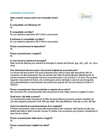 DOMANDE FREQUENTI Halo scanner mouse arriva con il manuale d’uso? Sì. È compatibile con Windows 8? Sì. È compatibile con Mac? Sì, con sistema operativo OS X 10.6 e successivi. Il software è compatibile con Mac? Sì, con sistema operativo OS X 10.6 e successivi. Posso scannerizzare le diapositive? Sì. Posso scannerizzare i negativi? Sì. In che formati si salvano le immagini? Halo Scanner Mouse può salvare le immagini in questi sei formati: .jpg, .doc, .pdf, .txt, .xls e .png. Che dimensioni devono avere i documenti originali da scannerizzare? La misura dei documenti che puoi scannerizzare varia in base alle specifiche del tuo computer ed alla risoluzione che hai settato per Halo Scanner Mouse. Mediamente, la misura massima di fotografia che puoi scannerizzare è circa 21.6cm x 27.9cm. Per quanto riguarda i documenti di testo, che contengono meno dettagli e colori di una fotografia, puoi generalmente scannerizzare documenti più grandi, fino ad una misura di 21.6cm x 35.6cm. Posso scannerizzare foto incorniciate e coperte da un vetro? No, non puoi. Per scannerizzarle, devi rimuovere le foto dalla cornice e togliere il vetro. Quali sono i dpi dello scanner? Le impostazioni della risoluzione di Halo Scanner Mouse possono essere regolate ad uno dei seguenti parametri: Full: 400 dpi, High: 320 dpi, Medium: 200 dpi, e Low: 100 dpi Qual è la velocità di scannerizzazione di un originale? Il tempo necessario varia in base alle impostazioni del computer dell’utente ed alla sua abilità nell’utilizzo dello scanner mouse. In media, una scansione può essere completata in due minuti o meno. Posso scannerizzare delle lastre a raggi X? Sì. Posso scannerizzare I biglietti da visita? Sì. Posso scannerizzare delle ricevute? Sì. Posso scannerizzare buste per la collezione di francobolli? Sì. Posso scannerizzare fotografie professionali? Sì. È possibile aggiornare il firmware? Se sì, come posso aggiornarlo? Sì, il firmware può essere aggiornato. Se necessario, Halo effettuerà l’aggiornamento attraverso l’applicazione del tuo Scanner Mouse. Halo Scanner Mouse funziona anche con i sistemi a 64-bit? Sì, funziona con entrambi i sistemi, sia a 32-bit che a 64-bit. Una volta che ho scannerizzato una foto, posso ingrandirla? Sì, puoi ingrandirla ma tieni presente che la risoluzione potrebbe variare. Posso connettere un mouse wireless al computer contemporaneamente allo scanner mouse? Sì, puoi utilizzare Halo Scanner Mouse e un mouse wireless connessi allo stesso tempo.
