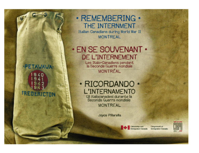 Author, Historian, Researcher Auteure, historienne, chercheuse Joyce Pillarella page I N T H 01 letter from the CIBPA 02 questions 04 road map of the book 06 essentials 07 spectacle 08 “knock knock” 09 listening 10 politics of internment 11 territorial claims 12 clubs 17 behind bars 18 Petawawa and Fredericton 22 open and shut case D E X 24 high command 25 public attitudes E M E S 26 discrimination 27 betrayal 28 shattered dreams 29 disillusionment 30 here’s the rub 31 who knew? 32 problem solving 33 defying convention 34 ethnicity and identity 36 the women’s war 37 abandonment 38 life in the slow lane 39 divide and conquer 40 fear factor 41 building blocks 42 remembering 44 sources Translation to French and Italian Traduction vers le français et l'italien Fabrizio Marullo English Proofreading Correction d'épreuve en anglais Matthew Cope Art Direction and Book Design Direction artistique et conception du livre Joyce Pillarella All Rights Reserved. Copyright © 2012, Writer, Translator, Graphic Design Copyright of images belongs to the family collections or archival sources. The use of any part of this publication, reproduced by any means without the prior consent of the author is an infringement of the copyright law. Tous droits réservés. Droit d’auteur © 2012, Texte, Traduction, Infographie - Design Les droits d’auteur des images appartiennent à des collections de famille ou à des sources d’archive. La reproducton, par quelque procédé que ce soit, même partielles, sont interdites sans l’autorisation de l’auteur. ISBN 978-0-9917671-0-6 Printed in Canada, Imprimé au Canada This project is funded by the Minister of Citizenship and Immigration Canada Community Historical Recognition Program — CHRP Ce projet est subventionné par le ministre de la Citoyenneté et de l'Immigration Programme de reconnaissance historique pour les communautés (PRHC) Cover photo: CWM 20020203-001 © Canadian War Museum The Canadian Italian Business and Professional Association of Montreal (CIBPA) would like to thank the Honourable Jason Kenney, Canadian Minister of Citizenship, Immigration and Multiculturalism, and the Community Historical Recognition Programme (CHRP) for their support of this project. The grant has funded the construction of a monument to mark the internment of Italian Canadians and its installation in the Casa d’Italia; 20 smaller replicas which will be awarded to the recipients of the CIBPA Personality of the Year for the next 20 years and for the creation of this book. We want to recognize Antonio Capobianco, Michel D’Ambrosio, Phil D’Abate, Raffaele Esposito, Alfredo Gagliardi, Dante Panni, Don Safolio and William Remiggi who founded the CIBPA on June 10th, 1949. This date was chosen to commemorate the arrests that occurred on June 10th, 1940. CIBPA was created as a response to the injustices of the internment experience. It is a tribute to the individuals who believed that people must advance positively out of hardship and forge their rightful place in Canada. The CIBPA Board of Directors and members join the families, children and friends of the internees in keeping their memories alive and celebrating the contributions the Italian Canadian pioneers made to Canada. Robert Rinaldi, CIBPA President Giovanni Chieffallo, CIBPA EX-Officio and Project Director La Canadian Italian Business and Professional Association de Montréal (CIBPA) tient à remercier l’honorable Jason Kenney, ministre canadien de la Citoyenneté et le Programme de reconnaissance historique pour les communautés (PRHC) pour leur soutien à ce projet. La subvention a servi à financer la construction d’un monument qui commémore l’internement des Italo-Canadiens ainsi que sa mise en place auprès de La Maison d’Italie; 20 reproductions à échelle réduite seront attribuées aux lauréats de la Personnalité de l’année de la CIBPA au cours des prochaines vingt années. Il a également financé la création de ce livre. Nous souhaitons reconnaître Antonio Capobianco, Michel D’Ambrosio, Phil D’Abate, Raffaele Esposito, Alfredo Gagliardi, Dante Panni, Don Safolio e William Remiggi qui ont fondé la CIBPA le 10 juin 1949. La date fut choisie pour commémorer les arrestations du 10 juin 1940. La CIBPA a été créée en réponse aux injustices vécues lors des internements. C’est un hommage aux personnes qui ont su surmonter les dures épreuves de manière positive pour forger leur position légitime au Canada. Le Conseil d’administration de la CIBPA et ses membres s’unissent aux familles, aux enfants et aux amis des internés pour maintenir en vie leur mémoire et pour célébrer la contribution des pionniers italiens à la construction du Canada. Robert Rinaldi, président CIBPA Giovanni Chieffallo, CIBPA, membre de droit et directeur du Projet L’Associazione gente d’affari e professionisti ItaloCanadesi di Montreal (CIBPA), ringrazia l’onorevole Jason Kenney, Ministro Canadese della Cittadinanza, Immigrazione e Multiculturalismo e il Community Historical Recognition Programme (CHRP), per il sostegno a questo progetto. La sovvenzione ha finanziato la costruzione di un monumento per commemorare l’internamento degli italocanadesi e la sua installazione presso la Casa d’Italia; nonché 20 riproduzioni miniatura che saranno conferite alla Personalità dell’anno della CIBPA per i prossimi 20 anni e la creazione di questo libro. Vogliamo riconoscere Antonio Capobianco, Michel D’Ambrosio, Phil D’Abate, Raffaele Esposito, Alfredo Gagliardi, Dante Panni, Don Safolio e William Remiggi che fondarono la CIBPA il 10 giugno 1949. La data fu scelta per ricordare gli avvenimenti del 10 giugno 1940. La CIBPA è stata creata in risposta alle ingiustizie dell’esperienza degli internamenti. È un tributo a quelle persone che erano convinte di dover superare le traversie in modo positivo per forgiare la loro legittima posizione in Canada. Il Consiglio di Amministrazione d