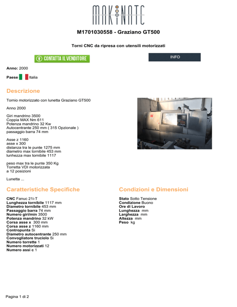 M1701030558 - Graziano GT500 Torni CNC da ripresa con utensili motorizzati Anno: 2000 Paese Italia Descrizione Tornio motorizzato con lunetta Graziano GT500 Anno 2000 Giri mandrino 3500 Coppia MAX Nm 611 Potenza mandrino 32 Kw Autocentrante 250 mm ( 315 Opzionale ) passaggio barra 74 mm Asse z 1160 asse x 300 distanza tra le punte 1275 mm diametro max tornibile 453 mm lunhezza max tornibile 1117 peso max tra le punte 350 Kg Torretta VDI motorizzata a 12 posizioni Lunetta ... Caratteristiche Specifiche Condizioni e Dimensioni CNC Fanuc 21i-T Lunghezza tornibile 1117 mm Diametro tornibile 453 mm Passaggio barra 74 mm Numero giri/min 3500 Potenza mandrino 32 kW Corsa asse x 300 mm Corsa asse z 1160 mm Contropunta Si Diametro autocentrante 250 mm Convogliatore truciolo Si Numero torrette 1 Numero motorizzati 12 Numero assi c 1 Stato Sotto Tensione Condizione Buono Ore di Lavoro Lunghezza mm Larghezza mm Altezza mm Peso kg Pagina 1 di 2 Pagina 2 di 2