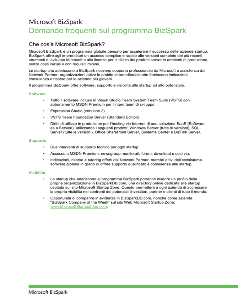 Domande frequenti sul programma BizSpark Che cos’è Microsoft BizSpark? Microsoft BizSpark è un programma globale pensato per accelerare il successo delle aziende startup. BizSpark offre agli imprenditori un accesso semplice e rapido alle versioni complete dei più recenti strumenti di sviluppo Microsoft e alle licenze per l’utilizzo dei prodotti server in ambienti di produzione, senza costi iniziali e con requisiti minimi. Le startup che aderiscono a BizSpark ricevono supporto professionale da Microsoft e assistenza dai Network Partner, organizzazioni attive in ambito imprenditoriale che forniscono indicazioni, consulenza e risorse per le aziende più giovani. Il programma BizSpark offre software, supporto e visibilità alle startup ad alto potenziale. Software • Tutto il software incluso in Visual Studio Team System Team Suite (VSTS) con abbonamento MSDN Premium per l’intero team di sviluppo • Expression Studio (versione 2) • VSTS Team Foundation Server (Standard Edition) • Diritti di utilizzo in produzione per l’hosting via Internet di una soluzione SaaS (Software as a Service), utilizzando i seguenti prodotti: Windows Server (tutte le versioni), SQL Server (tutte le versioni), Office SharePoint Server, Systems Center e BizTalk Server. Supporto • Due interventi di supporto tecnico per ogni startup. • Accesso a MSDN Premium: newsgroup monitorati, forum, download e così via. • Indicazioni, risorse e tutoring offerti dai Network Partner, membri attivi dell’ecosistema software globale in grado di offrire supporto qualificato e consulenza alle startup. Visibilità • Le startup che aderiscono al programma BizSpark potranno inserire un profilo della propria organizzazione in BizSparkDB.com, una directory online dedicata alle startup ospitata sul sito Microsoft Startup Zone. Questo permetterà a ogni azienda di accrescere la propria visibilità nei confronti dei potenziali investitori, partner e clienti di tutto il mondo. • Opportunità di comparire in evidenza in BizSparkDB.com, nonché come azienda “BizSpark Company of the Week” sul sito Web Microsoft Startup Zone: www.MicrosoftStartupZone.com. D O MA N D E F R E Q U E N TI S U L P R O G R A M MA B i z S p a r k – P A G I N A 2 Quali aziende possono partecipare al programma Microsoft BizSpark? Le startup che intendono aderire al programma devono: • Essere attivamente impegnate nello sviluppo di un prodotto o servizio software che 1 costituirà il core business delle attività attuali o previste • Essere aziende non quotate • Essere in attività da meno di 3 anni • Avere un fatturato annuo inferiore a 1 milione di dollari 2 3 Per poter utilizzare il software in ambienti di produzione e per il deployment di soluzioni in hosting, le startup devono avere avviato lo sviluppo di una nuova soluzione SaaS (su qualunque piattaforma) da distribuire via Internet. Microsoft BizSpark è disponibile per le startup che utilizzano anche tecnologie Open Source? Sì, BizSpark è disponibile per tutte le startup che soddisfano i requisiti di idoneità al programma. Aderire a Microsoft BizSpark è gratuito? La registrazione al programma è gratuita. Tuttavia, al momento dell’uscita dal programma ogni startup sarà tenuta a versare una quota di 100 dollari. Perché Microsoft offre questo programma? Il programma BizSpark poggia sulla convinzione di Microsoft secondo cui aiutare le startup a raggiungere il successo significa incoraggiare la creazione di relazioni a lungo termine, per arrivare a realizzare insieme una più vivace economia globale nel campo del software. Microsoft BizSpark aiuterà le startup permettendo loro di accedere al software Microsoft nel momento di maggiore necessità e minore possibilità economica, oltre che supportando la rete di organizzazioni (incubator, investitori, consulenti, enti governativi), che sono ugualmente coinvolte e hanno scelto di investire nell’innovazione e nell’imprenditorialità nel campo del software. L’obiettivo di Microsoft è collaborare con queste organizzazioni nell’ambito della rete Microsoft BizSpark Network, al fine di supportare il maggior numero possibile di startup in modo da accrescere il valore già offerto dalle organizzazioni di questa rete. Come si viene ammessi a Microsoft BizSpark? Le startup possono aderire al programma tramite una sponsorizzazione da parte dei Network Partner BizSpark. La registrazione al programma può essere effettuata tramite: • 1 Il sito Web per la registrazione delle startup a Microsoft BizSpark http://www.microsoft.com/bizspark/. Non sono ammesse le startup che forniscono servizi a terze parti quali hosting, Web agency, integrazione di sistemi o sviluppo in outsourcing. 2 Sono ammesse al programma BizSpark anche le startup già attive nello sviluppo di soluzioni software, ma che non hanno ancora provveduto a tutte le formalità associate alla creazione di un'azienda. 3 Questo requisito è stato adattato in base a varianti locali commisurate alle condizioni economiche dell'area geografica in cui operano le startup, come indicato di seguito. Per le aree geografiche non citate nell'elenco, il limite di fatturato è di 1 milione di dollari. • 750.000 dollari: Cina • 500.000 dollari: Corea, Grecia, Malaysia, Polonia, Russia, Spagna, Ucraina • 250.000 dollari: Egitto, Pakistan, Thailandia, Turchia, Vietnam D O MA N D E F R E Q U E N TI S U L P R O G R A M MA B i z S p a r k – P A G I N A 3 Nota: se nell’area geografica di un’azienda non è disponibile alcun Network Partner, è possibile contattare un rappresentante Microsoft per richiedere assistenza direttamente dal sito Web per la registrazione delle startup. http://www.microsoft.com/bizspark/findnetworkpartner.aspx Al termine della semplice procedura di registrazione, i partecipanti riceveranno un e-mail di benvenuto contenente un ID univoco da utilizzare per l’attivazione dei vantaggi per il download di software tramite MSDN. Microsoft BizSpark è attualmen