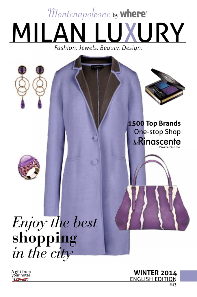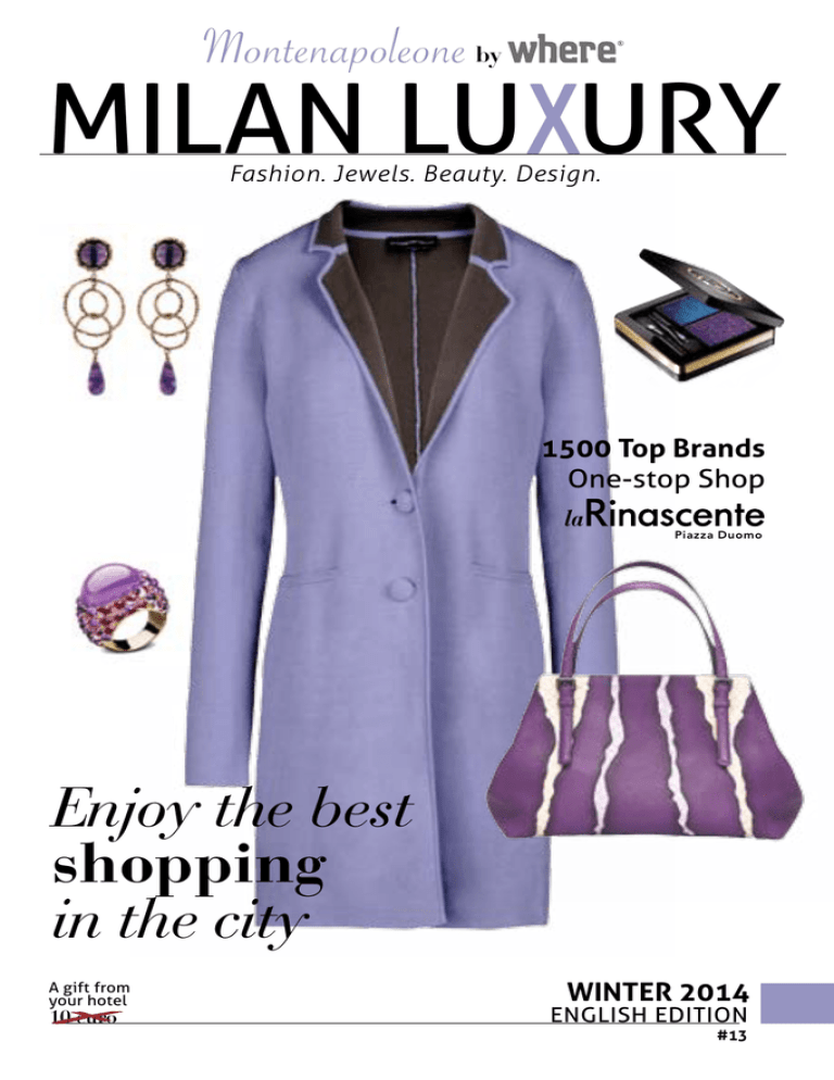 Montenapoleone by milan LU URY Fashion. Jewels. Beauty. Design. 1500 Top Brands One-stop Shop Piazza Duomo Enjoy the best shopping in the city A gift from your hotel 10 euro WINTER 2014 English Edition #13 Introduction PERPETUAL CALENDAR Welcome to the coldest season Even winter has its plus points including loads of ideas for fashion addicts thanks to a slew of new winter trends just waiting to be discovered! In fact, winter is a great time to flaunt coats, quilted jackets and furs in an array of disparate versions but also scarves and hats which, in addition to keeping us warm also add a touch of personality for a feel good look! This means that you can opt for even the brightest colours because who says that winter infers back to black? Light lilac, for example, is the perfect shade for all occasions. Refined and elegant it adds a touch of pizzazz to any outfit. There are so many ways to pamper yourself in winter and they don’t necessarily involve going to a spa. When it's cold and miserable outside, it's lovely to while away several hours indulging yourself. ADV VACHERON So here are some delightful ways to pamper yourself with makeup, creams and treatments that will make you feel more beautiful… and, if this doesn’t work, treat yourself to a pleasant moment of relaxation at one of Milan’s best pasticcerie or its more exclusive gastronomic destinations (either historical or trendy) which make this city a real temple of taste! IN THIS ISSUE | CONTRIBUTORS ALISA AUNS ELENA BINDA STEFANIA VIDA BIO: A fashion journalist, BIO: Elena is an Italian BIO: A Milanese journalist blogger (blog.smartmilan.it) and journalist who came to Milan as a with a passion for her job, for a consultant for Latitude45.it, student – planning to stay for only years Stefania has covered the Alisa introduces us to an exclusive a short time, life intervened and latest fashion and style trends in shopping experience in Milan she has lived here for many years, the city. After contributing to a by offering us a slew of insider first as a student, then as a career number of high-end publications secrets and new trends but also girl and now also as a married in the sector, she now works as useful information to navigate the woman. Though seeing Milan as a the Lifestyle and Fashion Editor of countless opportunities offered multi-faceted city she still retains Where Milan. by the city. the eye of a tourist experiencing it for the first time. WINTER_1 Contents News New Openings 4 Towards Expo 12 The best of Discovering Milan 6 Italian High Fashion Top Brands 34 Jewels and Watches Top Brands 38 Focus on Damiani 14 Manzoni 24 16 Tips Authentic experiences in the Quadrilatero 19 Montenapoleone Card, shopping without stopping 32 Tasting Experience 56 Getting around Milan 64 Insider’s View FURS | The style you’re looking fur 20 BEAUTY | It’s time to beauty by Stefania Vida 24 UNIQUE TASTING | Delights are never enough by Stefania Vida 28 Check the logos on the following pages for merchants accepting : Shop in Style DAY-TIME Diarise a day-time date | For Her 42 Diarise a day-time date | For Him 44 EVENING Evening starlet, shine! 46 Highlights Jaeger-LeCoultre 48 Manzoni 24 48 Damiani 49 Rocca 1794 49 Giòsa Milano 50 Miki House 50 Pisa Orologeria – Rolex Boutique 51 Pisa Orologeria and Patek Philippe Boutique 51 Dodo 52 Salmoiraghi & Viganò 52 Angela Caputi Giuggiù 53 Macrì 53 SophiePetit 54 Martino & Mazzolini 54 Around Milan Outlets and factory stores 55 The Guide Via Montenapoleone & Around the cornerboutiques directory 58 Montenapoleone by milan LU URY Fashion. Jewels. Beauty. Design. #13 WINTER 2014 English Edition THE WHERE PROJECT IS ENDORSED BY MONTENAPOLEONE BY WHERE MILAN LUXURY http://montenapoleone.wheremilan.com published by: Where Italia srl Via Ezio Biondi, 1 - 20154 Milano. T: 02 349951 - Fax 02 33107015 [email protected] www.wheremilan.com publisher and editor-in-chief Andrea Jarach ([email protected]) editorial (PROEDI COMUNICAZIONE srl) MANAGING DIRECTOR proedi comunicazione Daniele Misrachi REPORTERS Alisa Auns, Elena Binda, Stefania Vida EDITORial coordination Alessandra Finzi DESIGNER Elisabetta Giudici CONTRIBUTORS & consultants Carey Bernitz, Adriano Caramenti (photographer), Floriana di Maio, Joy Lacanlale, Fabio Lancini, AGF Creative (Iconography) WEB EDITOR Anna Aiello Although the publisher has made every effort to include copyright credits, in the event of there being any errors, oversights or omissions, we would like to apologize to the copyright holders in question whose names will be published in the next issue. MARKETING & ADVERTISING Isa Faleschini, Marta Mailhac, Rachele Renna ADMINISTRATION Katia Greto PRODUCTION & CIRCULATION, SALES SUPPORT COORDINATOR Paola Grilli Your Premier Refund+ Вы Премьер Воз 退税 Возврат нало га 退税 退税 Your Premier Refund+ Возврат нало га 事後免税 事後免税 by PREMIER Возврат нало га © Your Premier Refund+ 退税 Your Premier Refund+ Возврат нало га 事後免税 退税 HOTEL pr SERVICES Maria Granata ([email protected]) 事後免税 Your Premier Refund+ 事後免税 Your Premier Refund+ CUSTOMER SERVICES Cristina Garbini, Maria Grazia Rubino Your Premier Refund+ REG. trib. milano no. 60, 3 FEBRUARY 2012 where italia srl, iscritto al roc no. 20182 del 14 settembre 2010 1234 1234 1234 1234 Texte xxxxxxxxxxxxxxxxxxxxxxxxxxxxxxxxxxxxxxxxxxxxxxxxxxxx xxxxxxxxxxxxxxxxxxxxxxxxxxxxxxxxxxxxxxx by Light your winter Montenapoleone by Montenapoleone by MILAN LU URY Fashion. Jewels. Beauty. Design. MILAN LUXURY 1500 Top Brands One-stop Shop Piazza Duomo #13 | WINTER 2014 ENGLISH EDITION Enjoy the best shopping in the city A gift from your hotel 10 euro PREMIER © To brighten up the darkest season of the year, choose a vibrant colour like light lilac to put you in a good mood! Add a touch of dazzle to your outfit with, for example, this beautiful, versatile viscose singlebreasted 