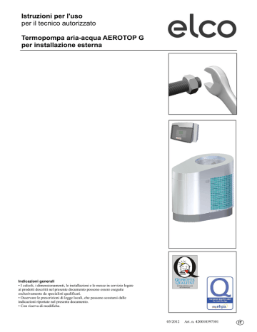 Istruzioni per l'uso per il tecnico autorizzato Termopompa aria-acqua AEROTOP G per installazione esterna Indicazioni generali • I calcoli, i dimensionamenti, le installazioni e le messe in servizio legate ai prodotti descritti nel presente documento possono essere eseguite esclusivamente da specialisti qualificati. • Osservare le prescrizioni di legge locali, che possono scostarsi dalle indicazioni riportate nel presente documento. • Con riserva di modifiche. 05/2012 Art. n. 420010397301 Sommario Sommario …………………………………………………............................................. 2 Visione d'insieme prodotti ......................................................................................................................... 3 Dati tecnici AEROTOP G07,G10,G12, G07-14M………………….................................. AEROTOP G07X, G10X……..………..…..................................................... Diagramma di rendimento AEROTOP G07(X)……….................................. Diagramma di rendimento AEROTOP G10(X)……….................................. Diagramma di rendimento AEROTOP G12…………………...……………. Diagramma di rendimento AEROTOP G07-14M a 90 a rps………………... Diagramma di rendimento AEROTOP G07-14M a 45 a rps………………... Diagramma di rendimento AEROTOP G07-14M a 20 a rps………………... Dati di rendimento AEROTOP G07(X)-12 (secondo EN 14511)………....... Dati di rendimento AEROTOP G07-14M (secondo EN 14511)..................... Limiti di esercizi.............................................................................................. Dimensioni AEROTOP G07(X), G10(X), G12, G07-14M............................. Pressione di spinta pompa di circolazione ALPHA 2...................................... Pressione di spinta pompa di circolazione UPM 2........................................... 4 5 6 7 8 9 10 11 12 13 14 15 16 17 Fondamenti Avvertenze di sicurezza................................................................................... Prescrizioni di legge, condizioni di garanzia Controllo in entrata.......................................................................................... 18 19 Descrizione del prodotto AEROTOP G................................................................................................... Dotazione......................................................................................................... 20 22 Trasporto e collocazione In generale........................................................................................................ Fondazione o piano di basamento.................................................................... Corretto posizionamento di una termopompa aria-acqua................................. Trasporto in loco............................................................................................... Raccordi idraulici.............................................................................................. Raccordi idraulici / Istruzioni di montaggio..................................................... 23 24 25 26 28 29 Allacciamento elettrico In generale......................................................................................................... Indicazioni per il montaggio unità di comando………………………............. Struttura apparecchio, assegnazione morsetti AEROTOP G07(X)-G12........... Struttura apparecchio, assegnazione morsetti AEROTOP G07-14M……........ Scatola elettrica AEROTOP G………............................................................... Scatola elettrica AEROTOP G..X……….......................................................... Scatola elettrica AEROTOP G..M…......……................................................... 31 32 34 35 36 37 38 Messa in servizio Premesse / Parametrizzazione / Regolazione e avvisi di errore.................................................................................................... Lavaggio e riempimento / Qualità dell'acqua di riscaldamento…………………...................................................................... Lista di controllo................................................................................................. Impostazione regime ventilatore / Valvola di espansione elettronica......................................................................................... Dati caratteristici sonde……………….............................................................. 39 40 41 43 44 Manutenzione In generale / Pulitura........................................................................................... 46 Eliminazione guasti............................................................................................. 47 Dichiarazione di conformità ............................................................................................................................. 50 Annotazioni .............................................................................................................................. 51 2 Visione d'insieme prodotti AEROTOP G Le termopompe aria-acqua AEROTOP G sono disponibili nelle seguenti esecuzioni: • trifase (400 V): AEROTOP G07, G10, G12 • monofase (230 V): AEROTOP G07X-G10X • trifase (400 V): AEROTOP G07-14M 3 Dati tecnici AEROTOP G07, G10, G12, G07-14M Termopompa AEROTOP G Regime riscaldamento 1) G07 G10 G12 Con A2/W35 G07-14M Con A2/W35 - 54 rps Potenza termica Qh kW 6.36 9.22 11.80 Potenza assorbita 2) Pel kW 1.72 2.50 3.24 2.61 COP - 3.69 3.69 3.64 3.84 Potenza termica Qh kW 8.64 12.52 14.10 Potenza assorbita 2) Pel kW 1.85 2.69 3.33 2.20 COP - 4.65 4.65 4.23 4.98 Corrente massima assorbita A 5.2 8.2 10.1 21 Corrente allo spunto con avviatore progressivo A 13.0 20.5 25.3 - LRA 32.0 51.5 64.0 - Coefficiente di rendimento Regime riscaldamento 1) Coefficiente di rendimento Con A7/W35 Intensità di corrente con ro