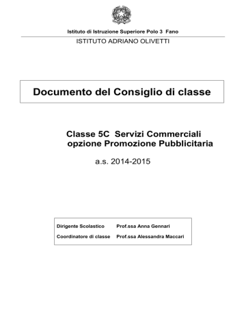 Istituto di Istruzione Superiore Polo 3 Fano ISTITUTO ADRIANO OLIVETTI Documento del Consiglio di classe Classe 5C Servizi Commerciali opzione Promozione Pubblicitaria a.s. 2014-2015 Dirigente Scolastico Prof.ssa Anna Gennari Coordinatore di classe Prof.ssa Alessandra Maccari Istituto di Istruzione Superiore Polo 3 Fano ISTITUTO ADRIANO OLIVETTI INDICE Indice ………………………………………………………………………………… 2 Consiglio di classe …………………………………………………………………… 3 Profilo sintetico della classe …………………………………………………………. 4 Presentazione della classe ……………………………………………………………. 4 Profilo professionale di indirizzo ……………………………………………………. 6 Obiettivi ……………………………………………………………………………… 7 Contenuti ……………………………………………………………………………. 8 Metodi ………………………………………………………………………………. 8 Mezzi ………………………………………………………………………………… 9 Attività di supporto …………………………………………………………………. 9 Attività di orientamento ……………………………………………………………… 10 Attività extracurricolari ……………………………………………………………… 11 Alternanza scuola-lavoro (stage aziendale)…………………………………………… 13 Criteri di attribuzione del credito scolastico e del credito formativo ………………... 14 Tabella credito scolastico ……………………………………………………………. 15 Simulazioni …………………………………………………………………………... 16 Allegati ………………………………………………………………………………... 17 Elaborato ed approvato dal C.d.C. della 5C Servizi Commerciali opzione Promozione Pubblicitaria il 15/05/2015 ai sensi e per gli effetti del DPR 23-07-98 n°323. Istituto di Istruzione Superiore Polo 3 Fano ISTITUTO ADRIANO OLIVETTI IL CONSIGLIO DI CLASSE Firma Dirigente scolastico Gennari Anna Italiano – Storia Furlani Mariangela Inglese Mazzacchera Isabella Matematica Maccari Alessandra Tecniche professionali servizi commerciali (Aziendale) Tecniche professionali servizi commerciali (Grafica) Tecniche professionali servizi commerciali (Grafica) Seconda Lingua straniera Francese Seconda Lingua straniera Spagnolo Peroni Mara Spendolini Nicoletta La Torre Pasquale Virgulti Donatella Chirico Antonella Storia dell’ Arte Rossi Giovanni Tecniche di comunicazione Isacchi Mauro Scienze motorie e sportive Sansoni Ottavio Religione Ucci Anna Maria Sostegno Sostegno Bartoli Elisa De Marchi Paola supplente Piccardoni Agnese Classe 5^ C Servizi Commerciali opzione Promozione Pubblicitaria Documento del Consiglio di classe – a.s. 2014-2015 Pag. 3 Istituto di Istruzione Superiore Polo 3 Fano ISTITUTO ADRIANO OLIVETTI PROFILO SINTETICO DELLA CLASSE La continuità didattica, nel biennio quarta e quinta, si è conservata soltanto per le discipline Italiano, Storia, Tecniche professionali dei servizi commerciali (Grafica), Francese, Spagnolo. Nella classe sono inseriti tre alunni con disabilità: due di essi seguono una programmazione per obiettivi minimi mentre un terzo allievo segue una programmazione per obiettivi minimi per le sole discipline Inglese e Tecniche professionali dei servizi commerciali (Aziendale). Nella classe sono inoltre inseriti tre alunni con DSA di diversa origine e importanza per i quali vengono attuati accorgimenti didattici specifici. In linea generale sono state confermate le caratteristiche della classe già emerse negli anni scolastici precedenti. L’atteggiamento degli alunni durante le lezioni è risultato poco disposto all’ascolto e scarsamente collaborativo, a volte ai limiti dell’indisciplina; pertanto l’attività didattica ha avuto sempre uno svolgimento difficoltoso e un carattere quasi impositivo risultando nel complesso piuttosto dispersiva. Particolare apprensione ha anche destato la situazione delle assenze, numerose e diffuse, che ha richiesto un monitoraggio continuo con conseguenti interventi di richiamo e che ha contribuito a rallentare e frammentare lo svolgimento dei programmi. Per quanto riguarda le capacità di analisi e di rielaborazione, nonostante la presenza di alcuni alunni con discrete potenzialità, il livello medio della classe si è rivelato modesto: da questo è derivata una generale mancanza di autonomia che ha reso il processo di apprendimento lento ed eccessivamente guidato. Oltre alle difficoltà interpretative sono emersi limiti considerevoli nell’impegno e nell’organizzazione dello studio autonomo, pertanto il lavoro di preparazione ha richiesto interventi didattici ripetitivi, con tempi prolungati di esposizione degli argomenti e di preparazione delle verifiche. Nel complesso la qualità generale dell’apprendimento appare poco organica e consapevole. Risultati migliori sono stati invece ottenuti nelle discipline dell’area professionalizzante in cui molti alunni hanno mostrato una maggior motivazione e capacità di lavoro sia nello sviluppo di progetti individuali o di classe che nella partecipazione a vari concorsi. PRESENTAZIONE DELLA CLASSE La composizione della classe è più volte cambiata nel corso dei cinque anni determinando talora difficoltà e tensioni nel rapporto interpersonale tra gli alunni. Il gruppo classe è composto da 28 alunni: 26 sono provenienti dalla classe quarta del precedente anno scolastico; un alunno ha interrotto due anni fa la frequenza della classe quinta e si è di nuovo iscritto nel corrente anno scolastico; un altro alunno proviene da un diverso Istituto
