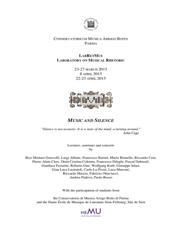 CONSERVATORIO DI MUSICA ARRIGO BOITO PARMA LABRETMUS LABORATORY ON MUSICAL RHETORIC 23-27 MARCH 2015 8 APRIL 2015 22-23 APRIL 2015 MUSIC AND SILENCE "Silence is not acoustic. It is a state of the mind, a turning around." John Cage Lectures, seminars and concerts by Bice Mortara Garavelli, Luigi Abbate, Francesco Baroni, Mario Brunello, Riccardo Ceni, Pierre-Alain Clerc, Deda Cristina Colonna, Francesco Dilaghi, Pascal Dubreuil, Gianluca Ferrarini, Roberto Gini, Wolfgang Korb, Giuseppe Ielasi, Gian Luca Lastraioli, Carlo Lo Presti, Luca Marconi, Riccardo Mascia, Fabrizio Ottaviucci, Andrea Padova, Paolo Russo With the participation of students from the Conservatorio di Musica Arrigo Boito di Parma and the Haute École de Musique de Lausanne-Sion-Fribourg, Site de Sion INTRODUCTION What is MUSICAL RHETORIC? Once the obstacles of technique have been surpassed and the structure and form of a musical piece understood, the performer has to search for and reestablish its sense, its expressive meaning, elements that together constitute interpretation. Musical rhetoric can be the medium that ties together the author, the performer, and the listener allowing them to share a language and thus fostering the emotional and conceptual understanding of the work. The fact that musical rhetoric is not confined to the historical period between the Renaissance and Classicism (it rather transcends epochs, repertoires, and styles), is not just a fascinating hypothesis: a rhetorical analysis of a Toccata by Claudio Merulo, of a song by the Beatles, a string quartet, or of a poetic or theatrical text, is thus possible, necessary, as well as exciting. “Theory comes from practice”: a WORKSHOP rather than a conference To bring down the mental barrier that separates what is considered “theory” from musical practice is a fundamental step for the performer. It is for this reason that every day the workshop will conclude with a concert. The workshop articulates through the lessons and seminars - which we would not want to define as either theoretical nor practical - the search for validity which for any musician represents the essence of interpretation, as well as the acquisition of a language that enables one to communicate with those listening. The subject of 2015: MUSIC AND SILENCE After the first edition in 2014 (a sort of “trial or test”), this year we aim at investigating the relation between music and silence, through different genres and styles, in a temporal frame that extends from the Renaissance to the contemporary. We would like to thank all the participants, lecturers, and performers involved in the four productions; a special thanks goes to Bice Mortara Garavelli for her precious contributions on rhetoric and literature; likewise we are happy to spotlight the concert on march 25th, when Pierre-Alain Clerc will inaugurate Claudio Merulo’s organ which, after years of silence, has recently been fully restored to its former voice. PARTICIPATION Participation in the Laboratory on 23, 24, 25 and 26 March is open to all, and allows students to gain formative credits, even in the case of attending a singular presentation. Participation (requiring enrollment) to the three seminars of in-depth practice on 27 March and to the seminar with concert Paraphrases of silence on 22-23 April coordinated by Luigi Abbate, allows students to gain formative credits. For further information and enrollment please write to: - Andrea Padova [email protected] for both seminars on Pascal Dubreuil and for his own; - Roberto Gini [email protected] for Deda Cristina Colonna’s seminar; - Luigi Abbate [email protected] for Paraphrases of silence. The presentation of Mario Brunello’s book on 8 April is open to all. 2 PROGRAM Monday, March 23, 2015, Auditorium del Carmine h 10.30 The Director’s greeting h 10.45-12.15 Bice Mortara Garavelli, The Rethoric of Silence: linguistic and literary aspects of communicating without words h 12.30-13.15 Luca Marconi, Silence and rests in music h 15.00-17.00 Pierre-Alain Clerc, Francesco Baroni and Roberto Gini, Sonata for viola da gamba and harpsichord BWV 1027 by Johann Sebastian Bach h 18.00 “The space between the notes: silences and resonances in Western and Eastern keyboard music from Bach to Hosokawa” Listerner’s Guide by Andrea Padova Tuesday, March 24, 2015, Auditorium del Carmine h 10.30-12.00 Bice Mortara Garavelli, Figures of silence: ellipsis, apophasis, aposiopesis h 12.15-13.00 Pierre-Alain Clerc, Instruction in French declamation h 15.00-16.30 Roberto Gini and Deda Cristina Colonna, “All the world’s a stage” – Director’s notes on “Recitar Cantando” (Monteverdi’s Musical Theatre I) h 16.45-18.15 Roberto Gini and Deda Cristina Colonna, “All the world’s a stage” – Director’s notes on “Recitar Cantando” (Monteverdi’s Musical Theatre II) h 20.30 "Monteverdi’s Theatre: Lamento d’Arianna and Combattimento di Tancredi e Clorinda" Concert performed by Roberto Gini with the students of the Early Music Department of the Conservatorio di Musica Arrigo Boito and the participation of Gianluca Ferrarini and Gian Luca Lastraioli Wednesday, March 25, 2015, Auditorium del Carmine h 11.00-12.15 Pierre-Alain Clerc, Some aspects of silence in music before the XIX century (with the participation of Roberto Gini) h 12.15-13.00 Paolo Russo, The sound of silence in opera h 15.00-15.45 Francesco Dilaghi, “Das redende Prinzip” from C.P.E. Bach to Beethoven h 15.45-16.30 Carlo Lo Presti, Silence and Irony in Maurice Ravel (Kyoko Hattori, soprano – Leonardo Spadaro, piano) h 16.45-17.30 Pierre-Alain Clerc, From Merulo to Frescobaldi h 18.00 "From Merulo to Frescobaldi" Concert for the inauguration of the newly restored Claudio Merulo’s organ performed by PierreAlain Clerc Music by Claudio Merulo, Claudin de Sermisy, Andrea Gabrieli, Giovanni Gabrieli, Giovanni Maria Trabaci, Tarquinio Merula, Heinrich Scheidemann, Antonio Carreira, Christian Erbach