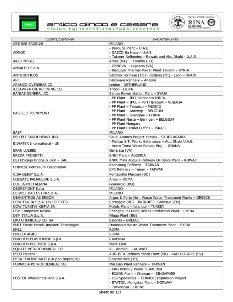 MIXING EQUIPMENT-AERATORS-REACTORS CLIENTE/CUSTOMER ABB SAE SADELMI ADNOC AKZO NOBEL ANSALDO S.p.A. ANTIBIOTICOS API ARAMCO OVERSEAS CO. AZZAWIYA OIL REFINING CO. BANIAS GENERAL CO. BASELL / TECNIMONT BASF BELLELI SAUDI HEAVY IND. BIWATER International - UK BRAN LUEBBE BREDA PROGETTI CBI Chicago Bridge & Iron – UAE CHINESE Petroleum Corporation CIBA GEIGY S.p.A. COLGATE PALMOLIVE S.p.A. CULLIGAN ITALIANA DEGREMONT Italia DESMET BALLESTRA S.p.A. DIAKENTROS AE ERGON DOW ITALIA S.p.A. (ex LEPETIT) DOW TURKIYE KIMYA SA DSM Composite Resins DSM ITALIA S.p.A. EKO CHEMICALS CO. SA EMIT Ercole Marelli Impianti Tecnologici ENEL ENI (EX AGIP) ENICHEM ELASTOMERI S.p.A. ENICHEM POLIMERI S.p.A. EQUATE PETROCHEMICAL CO. ESSO Italiana FISIA ITALIMPIANTI (Gruppo Impregilo) FORMOSA PETROCHEMICAL CO. FOSTER Wheeler Italiana S.p.A. IMPIANTI/PLANTS MILANO - Borouge Plant – U.A.E. - GASCO Bu Hasa – U.A.E. - Takreer Refineries – Ruwais and Abu Dhabi - U.A.E. Arese (VA) - Fombio (LO) - GENOVA - Legnano (VA) - Bisoutun Thermal Power Plant Tavanir – SYRIA Settimo Torinese (TO) - Rodano (MI) - Leon – SPAIN Falconara Refinery – Ancona Leiden - NETHERLAND Tripoli - LIBYA Banias Power station Plant – SYRIA - PP Plant – IPCL Vadodara INDIA - PP Plant – IPCL – Port Harcourt – NIGERIA - PP Plant – Tampico – MEXICO - PP Plant – Antwerp – BELGIUM - PP Plant – Shanghai – CHINA - PP Plant Neste – Beringen – BELGIUM - PP Plant Hungary - PP Plant Carmel Olefins – ISRAEL MILANO Saudi Aramco Project Yambu – SAUDI ARABIA - Mafraq S.T. Works Extensions – Abu Dhabi U.A.E. - Accra Tema Water Rehab. Proj. – GHANA Gallarate (VA) SNIC Plant – ALGERIA KNPC Mina Abdulla Refinery Oil Stock Plant – KUWAIT Kaohsiung Refinery – TAIWAN CPC Refinery – Taipei - TAIWAN Pontecchio Marconi (BO) Anzio – ROMA Granarolo (BO) MILANO MILANO Argos & Porto Heli Waste Water Treatment Plants – GREECE Correggio (RE) – BRINDISI - Garessio (CN) Poliols Plant – Istanbul – TURKEY Shanghai Pu Dong Resins Production Plant – CHINA Filago Plant (BG) Saloniki – GREECE Damascus Waste Water Treatment Plant – SYRIA ROMA ROMA RAVENNA MANTOVA Al - Ahmadi – KUWAIT AUGUSTA Refinery Stock Plant (SR) - VADO LIGURE (SV) Cascine Vica (TO) Mai Liao Plant Refinery – TAIWAN - ERG Petroli / Priolo SIRACUSA - EXXON Plant – Chawan – SINGAPORE - OSI Specialties – TERMOLI Expansion Project - STATOIL Mongstad Plant – NORWAY - Torviscosa – UDINE Sheet no 1/3 MIXING EQUIPMENT-AERATORS-REACTORS CLIENTE/CUSTOMER FOX PETROLI S.p.A. PESARO GE IONICS INC. USA Sea Water Desalination Plant Hamma – ALGERIA GE WATER & PROCESS TECHNOLOGY (Ex Ionics Italba) WWTP – LYBIA and other various plants GREAT LAKES CHEMICAL CORP. HABIB Ali Awachi / TUBLI Municipality HELLENIC PETROLEUM SA RAVENNA Tubli Extension Secondary Plant – Manama – BAHRAIN Saloniki – GREECE MILANO Mexico Plant Bashrah Waste Water Treatment Plant – IRAQ ROMA Milano – Genova - Taranto Polypropylene Plant – PP2 Altamira – MEXICO - Polypropylene Plant – (INDORAMA) – INDIA - PP Plant Port Harcourt – NIGERIA ROMA Priolo Gargallo Plant (SR) Finacril Plant – MEXICO Amman – JORDAN Khorramshahr STPP – IRAN Kermanshah IRAN - Tail Gas Treating Unit – Shuaiba Refinery – KUWAIT - Mina Al – Ahmadi Refinery – KUWAIT - MAFP Project – KUWAIT Cairo – EGYPT - Shuaiba Refinery – KUWAIT - Umm Al Nar Refinery – KUWAIT - South Est Kuwait Fields – KUWAIT Al Shuaiba – KUWAIT Styrene Plant – Feluy – BELGIUM Corinth – GREECE Skikda Refinery – ALGERIE TAKREER – Umm Al Nar Refinery – Abu Dhabi – U.A.E. ARAK Petrochemical Co. – Tehran – IRAN Bandar Abbas Refinery Tehran – IRAN Isfahan Oil Refining Co. – Isfahan (Rey Station) Kala Naft – Tehran – IRAN Tabriz Oil Refining Co. – Tabriz Teheran Oil Refining Co. – Tehran Tanta W.W.T.P. + Faskour + Al Marwa W. W. T. Plants – EGYPT Oil Stock Plant – Tula – MEXICO AGIP KCO – KAZAKISTAN Lisbona – PORTUGAL Genova Stock Plant Yarica – Koacaeli Plant – TURKEY Capua (CE) MILANO Milano Figline Valdarno (FI) Brindisi Shop - Mantova Shop Pomezia Plant - Gattatico Plant Jakarta – INDONESIA MTPA Palembang – INDONESIA Tehran Province Waste Water Co. – IRAN HENKEL S.p.A. Hindustan DORR-OLIVER HOLST ITALIA S.p.A. ILVA S.p.A. INDELPRO SA INDIAN PETROCHEMICAL CO. ISTITUTO POLIGRAFICO E ZECCA DELLO STATO ISAB Energy ERG Italiana Progetti JORDAN PETROLEUM REFINERY CO. KAROON Phosphate Complex Co. KERMANSHAH Municipality KNPC KHALDA PETROLEUM CO. KOC (K.S.C.) KUWAIT OLEFINS MONTEFINA (FINAMONT) MOTOR OIL HELLAS REFINERIES NAFTEC N.P.C.C. National Petroleum Const. Co. N.I.O.C. NOPWASD PEMEX Petroleos Mexicanos PETROFAC UAE PETROGAL PETROLIG PETKIM Petrokimya San. PIERREL PIANIMPIANTI S.p.A. PIRELLI POLIMERI Europa PROCTER & GAMBLE PT ROHM & HAAS CO. PT SRI MELAMIN REJEKI QOM WASTE WATER IMPIANTI/PLANTS Sheet no 2/3 MIXING EQUIPMENT-AERATORS-REACTORS CLIENTE/CUSTOMER RAFFINERIE SARAS RAS LANUF OIL & GAS PROCESSING CO. SAMIR Societé Anonyme Marocaine SAIPEM (ENI GROUP) SALACO Saudi Arabian Lube Addit. Co. SAMSUNG SHIRAZ MUNICIPALITY DAMANHOUR Municipality SINOPEC China Petroleum & Chemical Corp. SNAMPROGETTI – MILANO SNAMPROGETTI – FANO SNAMPROGETTI SUD SOLVAY Chimica Italia SOLVAY POLYOLEFINS EUROPE SOLVAY Solexis (ex Ausimont) STATE OIL REFINING ENT. TECHINT TECHNIP – Italy TECHNIP Singapore TECNIMONT TEKFEN Insaat Ve Tesisat A.S. Constr. Co. TERMOKIMIK CORPORATION S.p.A. TERMOMECCANICA S.p.A. THESSALONIKI REFINING CO. THAI Petrochemical Industry Co. TUPRAS Turkiye Petroleri Rafineleri UHDENORA S.p.A. UNILEVER BEST FOOD UNILEVER ITALIA S.p.A. WARRY REFINERY IMPIANTI/PLANTS Cagliari Plant STP Plant for Azzawiya Oil Refinery – LIBYA Mohammedia Refinery – MOROCCO - Muds Plants – ALGERIA - Zhaikmunay Plant – KAZAKISTAN Yanbu Plant – SAUDI ARABIA PHU MI Fertilizer Plant – VIETNAM Shiraz IRAN Damanhour WWTP – EGYPT ZHENHAI Refining & Chemica