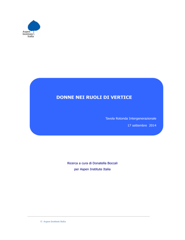 DONNE NEI RUOLI DI VERTICE Tavola Rotonda Intergenerazionale 17 settembre 2014 Ricerca a cura di Donatella Boccali per Aspen Institute Italia © Aspen Institute Italia Premessa La presente Ricerca analizza la presenza delle donne dirigenti non solo nell’area dell’imprenditoria, ma anche nei ruoli di vertice nella Pubblica Amministrazione, negli enti locali (Comuni) e nelle Camere di Commercio. Obiettivo è definire un quadro complessivo e rapportato a diverse esperienze manageriali, con un riferimento all’esperienza europea, sia nel settore pubblico che privato. La Ricerca si è concentrata principalmente sull’analisi di dati nazionali della presenza femminile nei ruoli di vertice non concernenti le posizioni ricoperte nei Consigli di Amministrazione e nei Collegi sindacali. L’analisi ha considerato anche il gender pay gap confermando il divario salariale tra donne e uomini che si riflette sulle disuguaglianze nel mercato del lavoro che colpiscono soprattutto le donne. Nonostante la società e il mondo del lavoro si stiano evolvendo verso un maggior equilibrio di ruoli, il quadro che emerge dai dati, nazionali ed europei, conferma la bassa presenza di donne nei ruoli di vertice sia nel settore privato che pubblico, anche se le donne hanno un livello di istruzione più elevato rispetto agli uomini, fenomeno peraltro globale. La disparità è ancora forte in Italia e lo è ancor più a livello generale nei confronti con l’estero. © Aspen Institute Italia | DONNE NEI RUOLI DI VERTICE 2 Executive Summary La Ricerca, riferita sia ai dati nazionali che internazionali, evidenzia i seguenti principali risultati: a) Risoluzioni dei rapporti di lavoro nel tempo della crisi Negli ultimi cinque anni i dirigenti attivi nell’Unione Europea sono diminuiti di un terzo. L’Italia è agli ultimi posti nel rapporto manager-occupati. Dai dati relativi al periodo 20102012, i manager italiani si sono dimezzati. Tuttavia la crisi, che pur tocca le donne che lavorano e quelle ai vertici, le vede comunque in progresso nonostante il calo di occupazione. b) Gender pay gap Il divario salariale tra uomini e donne sul mercato del lavoro colpisce ancora e soprattutto le donne, variando in tutta Europa. L’analisi dei differenziali retributivi di genere rileva che in quasi tutti gli stati membri della UE, il divario retributivo di genere nelle attività finanziarie e assicurative è in misura sostanziale superiore a quello degli altri settori e dell’economia nel suo complesso. Secondo i dati OCSE aggiornati al 2011 lo stipendio medio dei manager senior nella Pubblica Amministrazione in Italia è il più alto rispetto a tutti gli altri paesi, distanziando il secondo paese in classifica di oltre 250 mila dollari. c) Donne al vertice Il quadro che emerge conferma la bassa presenza di donne nei ruoli di vertice nelle imprese italiane e nella Pubblica Amministrazione. Nel settore privato la presenza femminile si concentra principalmente nei campi della comunicazione e delle risorse umane. Nel settore pubblico solo nella Presidenza del Consiglio dei Ministri si raggiunge una soglia del 40% di donne nei ruoli apicali e una soglia del 50% nel Ministero dell’Economia e delle Finanze. d) Istruzione In Italia, come nel resto del mondo, le donne hanno un tasso di formazione universitaria maggiore degli uomini. A livello europeo l’Italia si posiziona all’ultimo posto per tasso di formazione universitaria tra gli uomini e al terzultimo tra le donne. e) Situazione europea La Gran Bretagna risulta il “regno” europeo dei manager e dove risiede quasi un quarto dei manager attivi in Europa. La Lettonia offre più spazio alle donne dirigenti e raggiunge quasi la parità (46%). © Aspen Institute Italia | DONNE NEI RUOLI DI VERTICE 3 Indice 1. Donne ai vertici e la crisi dirigenziale nel panorama italiano ed europeo 1.a Risoluzione dei rapporti di lavoro nel tempo della crisi ...…... p. 5 1.b Donne ai vertici e la crisi ……………………………………. p. 7 2. Gender pay gap 2.a Divario salariale tra uomini e donne ………………………… p. 8 2.b Divario salariale dei manager italiani ………... …………….. p. 11 3. Donne al vertice 3.a Donne al vertice dell’impresa: top manager e dirigenti ……… p. 12 3.b Formazione delle donne ……………………………………… p. 16 3.c Donne dirigenti nella P.A. ……………………………………. p. 17 3.d Donne ai vertici nelle amministrazioni comunali italiane ……. p. 25 3.e Donne ai vertici nelle camere di commercio italiane …………. p. 27 4. Un confronto con l’Europa 4.a Istituzioni ………………………………………………………. p. 28 4.b Politica ……………………………………………………….... p. 30 4.c Giustizia ……………………………………………………….. p. 31 4.d Finanza, Impresa, Central Bank………………………………… p. 31 Link utili ……………………………………………………………. p. 33 © Aspen Institute Italia | DONNE NEI RUOLI DI VERTICE 4 1. Donne ai vertici e la crisi dirigenziale nel panorama italiano ed europeo 1.a Risoluzione dei rapporti di lavoro nel tempo della crisi In relazione ai dati europei la Gran Bretagna è il “regno” europeo dei manager, dove risiede quasi un quarto (24%) dei manager attivi in Europa, molto più numerosi che in Francia (15%) e Germania (16%). La Lettonia è il paese che offre più spazio alle donne dirigenti. L’Italia è solo quarta per numero assoluto di manager (7%) dietro la Polonia (8%) 1. Mediamente nella UE solo un terzo dei manager (33%) è donna. Sopra la media quasi tutti gli Stati dell’Est Europeo. Su tutti spicca la Lettonia, dove si è prossimi alla parità (46%). Subito dietro troviamo Francia, Slovenia, Lituania, e Ungheria, tutti al 39%. L’Italia ha poco più di un quarto delle donne manager (26%) collocandosi al quintultimo posto. Nell’ultimo