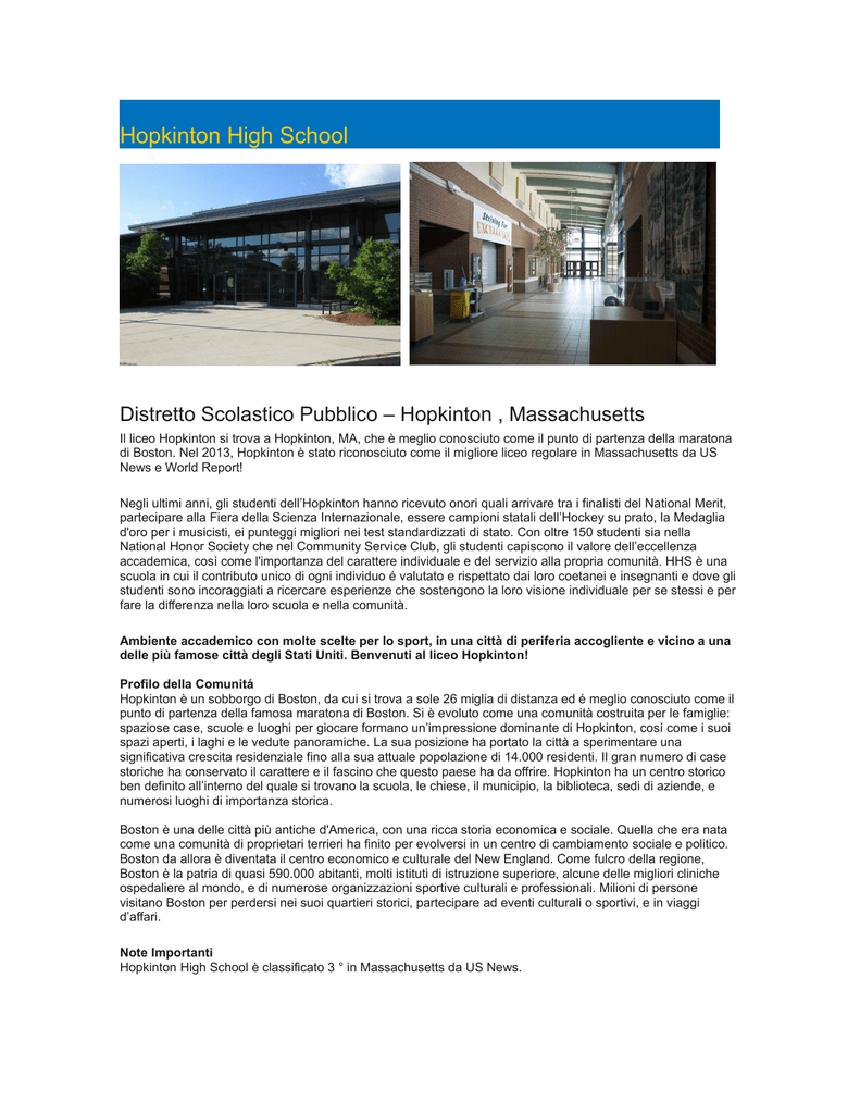 Hopkinton High School Distretto Scolastico Pubblico – Hopkinton , Massachusetts Il liceo Hopkinton si trova a Hopkinton, MA, che è meglio conosciuto come il punto di partenza della maratona di Boston. Nel 2013, Hopkinton è stato riconosciuto come il migliore liceo regolare in Massachusetts da US News e World Report! Negli ultimi anni, gli studenti dell’Hopkinton hanno ricevuto onori quali arrivare tra i finalisti del National Merit, partecipare alla Fiera della Scienza Internazionale, essere campioni statali dell’Hockey su prato, la Medaglia d'oro per i musicisti, ei punteggi migliori nei test standardizzati di stato. Con oltre 150 studenti sia nella National Honor Society che nel Community Service Club, gli studenti capiscono il valore dell’eccellenza accademica, così come l'importanza del carattere individuale e del servizio alla propria comunità. HHS è una scuola in cui il contributo unico di ogni individuo é valutato e rispettato dai loro coetanei e insegnanti e dove gli studenti sono incoraggiati a ricercare esperienze che sostengono la loro visione individuale per se stessi e per fare la differenza nella loro scuola e nella comunità. Ambiente accademico con molte scelte per lo sport, in una città di periferia accogliente e vicino a una delle più famose città degli Stati Uniti. Benvenuti al liceo Hopkinton! Profilo della Comunitá Hopkinton è un sobborgo di Boston, da cui si trova a sole 26 miglia di distanza ed é meglio conosciuto come il punto di partenza della famosa maratona di Boston. Si è evoluto come una comunità costruita per le famiglie: spaziose case, scuole e luoghi per giocare formano un’impressione dominante di Hopkinton, così come i suoi spazi aperti, i laghi e le vedute panoramiche. La sua posizione ha portato la città a sperimentare una significativa crescita residenziale fino alla sua attuale popolazione di 14.000 residenti. Il gran numero di case storiche ha conservato il carattere e il fascino che questo paese ha da offrire. Hopkinton ha un centro storico ben definito all’interno del quale si trovano la scuola, le chiese, il municipio, la biblioteca, sedi di aziende, e numerosi luoghi di importanza storica. Boston è una delle città più antiche d'America, con una ricca storia economica e sociale. Quella che era nata come una comunità di proprietari terrieri ha finito per evolversi in un centro di cambiamento sociale e politico. Boston da allora è diventata il centro economico e culturale del New England. Come fulcro della regione, Boston è la patria di quasi 590.000 abitanti, molti istituti di istruzione superiore, alcune delle migliori cliniche ospedaliere al mondo, e di numerose organizzazioni sportive culturali e professionali. Milioni di persone visitano Boston per perdersi nei suoi quartieri storici, partecipare ad eventi culturali o sportivi, e in viaggi d’affari. Note Importanti Hopkinton High School è classificato 3 ° in Massachusetts da US News. Date Data prevista di inizio delle lezioni: Inizio Settembre Data prevista di fine delle lezioni: Metá Giugno Informazioni sulla scuola Numero di scuole nel distretto Popolazione Scolastica Numero di Studenti 1 Mista 1050 Anni scolastici (Grades) Proporzione Insegnanti/Studenti 9-12 1:20 Programmi ESL (Inglese come seconda lingua) Si IB Programs (Internazional Baccalaureate) Offre la possibilitá di diplomarsi Punteggio Medio SAT Si 1718 No Lingue Straniere Francese Spagnolo Greco Latino Cinese Arti Arte Banda Ceramica Coro Arte al Computer Animazione Foto Digitali Animazione Flash Graphic Design Fashion Textile Design Fotografia Pittura & Disegno Corsi AP (Advanced Placement) – Corsi Parauniversitari Analisi AB Analisi BC Chimica Lingua inglese e composizione Letteratura Inglese e Composizione Scienze Ambientali Lingua e Cultura Francese Fisica Lingua Spagnola Statistica Diritto Amministrativo Statunitense Storia degli Stati Uniti Storia dell’Arte Psicologia Art Portfolio Storia Mondiale Sport • Baseball • Basketball • Cheerleading • Corsa Campestre • Hockey su prato • Football • Golf • Hockey • Lacrosse • Calcio • Softball • Tennis • Atletica Leggera • Pallavolo • Wrestling • Nuoto Attivitá e Clubs Extracurriculari • Arte • Servizio Ambientale • Matematica • Fotografia • Riviste d'arte • Italiano • Mock Trial (Simulazione di un processo in tribunale) • Ping Pong • Book Club • Banda Jazz • Modello Nazioni Unite • Robotica • Coro • Latino • Produzione Musicale • Consiglio degli Studenti • Servizio Comunitario • Living theatre • Giornale • Annuario Scolastico College e Universitá frequentate dagli ex studenti Berklee College of Music, Brown University, Butler University, Duke University, Cornell University, Boston College, Dartmouth College, Providence College, Rensselaer Polytechnic Institute, Harvard University, Villanova University, Boston University, University of Notre Dame, Oberlin College, New York University, Colby College, Wellesley College, Tufts University, Swarthmore College, Loyola Marymount University, University of Pennsylvania, Tulane University, College of William and Mary, University of North Carolina, Skidmore College Analisi dettagliata del punteggio SAT: Sezione Media Lettura Critica 568 Matematica 579 Scrittura 571 Totale 1718 Percentuale con Punteggio AP Proficiency (3-5) 86.6% Tasso di Accettazione Universitaria: 94% Areoporti Locali ed Internazionali piú vicini: Boston Logan International Airport (BOS) Per ulteriori dettagli visitare il sito web: Hopkinton High School