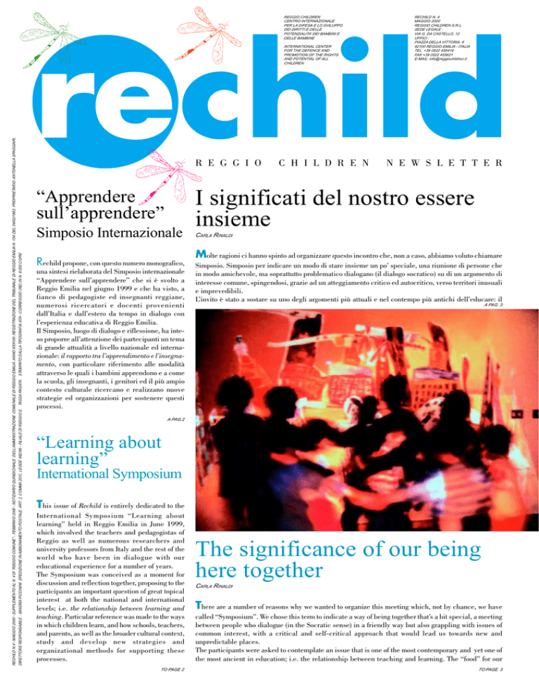 REGGIO CHILDREN CENTRO INTERNAZIONALE PER LA DIFESA E LO SVILUPPO DEI DIRITTI E DELLE POTENZIALITA’ DEI BAMBINI E DELLE BAMBINE rechild INTERNATIONAL CENTER FOR THE DEFENCE AND PROMOTION OF THE RIGHTS AND POTENTIAL OF ALL CHILDREN R E G G I O “Apprendere sull’apprendere” Simposio Internazionale DIRETTORE RESPONSABILE : SANDRA PICCININI. SPEDIZIONE IN ABBONAMENTO POSTALE, ART. 2, COMMA 20/C, LEGGE 662/96 - FILIALE DI REGGIO E. TASSA PAGATA. STAMPATO DALLA TIPOGRAFIA ATA - CORREGGIO (RE) IN N. 8.000 COPIE RECHILD N.4 - MAGGIO 2000 - SUPPLEMENTO AL N. 4 DI “REGGIO COMUNE” - FEBBRAIO 2000 - NOTIZIARIO QUINDICINALE DELL’AMMINISTRAZIONE COMUNALE DI REGGIO EMILIA. ANNO XXXVIII. REGISTRAZIONE DEL TRIBUNALE DI REGGIO EMILIA N. 154 DEL 04/02/1963. PROPRIETARIO: ANTONELLA SPAGGIARI, RECHILD N. 4 MAGGIO 2000 REGGIO CHILDREN S.R.L. SEDE LEGALE : VIA G. DA CASTELLO, 12 UFFICI : PIAZZA DELLA VITTORIA, 6 42100 REGGIO EMILIA - ITALIA TEL. +39 0522 455416 FAX +39 0522 455621 E-MAIL: [email protected] Rechild propone, con questo numero monografico, una sintesi rielaborata del Simposio internazionale “Apprendere sull’apprendere” che si è svolto a Reggio Emilia nel giugno 1999 e che ha visto, a fianco di pedagogiste ed insegnanti reggiane, numerosi ricercatori e docenti provenienti dall’Italia e dall’estero da tempo in dialogo con l’esperienza educativa di Reggio Emilia. Il Simposio, luogo di dialogo e riflessione, ha inteso proporre all’attenzione dei partecipanti un tema di grande attualità a livello nazionale ed internazionale: il rapporto tra l’apprendimento e l’insegnamento, con particolare riferimento alle modalità attraverso le quali i bambini apprendono e a come la scuola, gli insegnanti, i genitori ed il più ampio contesto culturale ricercano e realizzano nuove strategie ed organizzazioni per sostenere questi processi. C H I L D R E N N E W S L E T T E R I significati del nostro essere insieme CARLA RINALDI Molte ragioni ci hanno spinto ad organizzare questo incontro che, non a caso, abbiamo voluto chiamare Simposio. Simposio per indicare un modo di stare insieme un po’ speciale, una riunione di persone che in modo amichevole, ma soprattutto problematico dialogano (il dialogo socratico) su di un argomento di interesse comune, spingendosi, grazie ad un atteggiamento critico ed autocritico, verso territori inusuali e imprevedibili. L’invito è stato a sostare su uno degli argomenti più attuali e nel contempo più antichi dell’educare: il A PAG. 3 A PAG.2 “Learning about learning” International Symposium This issue of Rechild is entirely dedicated to the International Symposium “Learning about learning” held in Reggio Emilia in June 1999, which involved the teachers and pedagogistas of Reggio as well as numerous researchers and university professors from Italy and the rest of the world who have been in dialogue with our educational experience for a number of years. The Symposium was conceived as a moment for discussion and reflection together, proposing to the participants an important question of great topical interest at both the national and international levels; i.e. the relationship between learning and teaching. Particular reference was made to the ways in which children learn, and how schools, teachers, and parents, as well as the broader cultural context, study and develop new strategies and organizational methods for supporting these processes. There are a number of reasons why we wanted to organize this meeting which, not by chance, we have called “Symposium”. We chose this term to indicate a way of being together that’s a bit special, a meeting between people who dialogue (in the Socratic sense) in a friendly way but also grappling with issues of common interest, with a critical and self-critical approach that would lead us towards new and unpredictable places. The participants were asked to contemplate an issue that is one of the most contemporary and yet one of the most ancient in education; i.e. the relationship between teaching and learning. The “food” for our TO PAGE 2 TO PAGE 3 The significance of our being here together CARLA RINALDI I significati del nostro essere insieme DA PAG.1 “Apprendere sull’apprendere” DA PAG.1 Questo tema, da sempre fondamentale per l’educazione, ha suscitato e suscita ancora grande interesse nell’esperienza dei nidi e scuole dell’infanzia di Reggio Emilia che hanno realizzato approfondimenti anche in collaborazione con partners italiani ed esteri. L’obiettivo principale del Simposio è stato dunque condividere i primi risultati di alcune di queste ricerche e venire a conoscenza, attraverso il racconto dei partecipanti provenienti da tutte le parti del mondo, del livello di avanzamento degli studi e delle riflessioni attorno alla tematica del rapporto tra l’apprendere e l’insegnare, cioè attorno all’essenza stessa dell’educare. “Learning about learning” FROM PAGE 1 This question has always been fundamental to education, and has been an ongoing focus of the infanttoddler centers and preschools of Reggio Emilia, which continue to carry out in-depth studies in these areas, also in conjunction with Italian and foreign partners. The primary aim of the Symposium was therefore to share the initial findings of some of this research and, through the presentations of participants from different parts of the world, to enable us to become familiar with the state of advancement of the studies and reflections on this important theme: the relationship between learning and teaching, which is the true essence of education. rapporto tra apprendimento ed insegnamento. Gli elementi per la riflessione sono stati forniti sia dai contributi di colleghi ed amici che vivono ed operano in contesti internazionali, sia dalle prime risultanze emerse nel corso di alcuni percorsi di ricerche realizzate in questi ultimi anni nei nidi e nelle scuole dell’infanzia di Reggio. Abbiamo cercato di costruire 