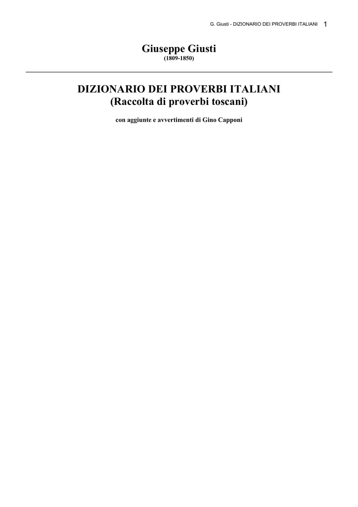 G. Giusti - DIZIONARIO DEI PROVERBI ITALIANI o Giuseppe Giusti (1809-1850) DIZIONARIO DEI PROVERBI ITALIANI (Raccolta di proverbi toscani) con aggiunte e avvertimenti di Gino Capponi 1 G. Giusti - DIZIONARIO DEI PROVERBI ITALIANI o • • • • • • • • • • • • • • • • • • • • • • • • • • • • • • • • • • • • • • • • • • • • • • • • • Avvertimento (1852) Avvertimento (1871) Prefazione dell'Autore Abitudini, Usanze Adulazioni, Lodi, Lusinghe Affetti, Passioni, Gusti, Voglie Agricoltura, Economia rurale Allegria, Darsi bel tempo Ambizione, Signoria, Corti Amicizia Amore Astuzia, Inganno Avarizia Bellezza e suo contrario, Fattezze del corpo Beneficenza, Soccorrersi Benignità, Perdono Bisogno, Necessità Buona e mala fama Buoni e Malvagi Casa Compagnia, buona e cattiva Condizioni e Sorti disuguali Conforti ne' mali Consiglio, Riprensione, Esempio Contentarsi della propria sorte Contrattazioni, Mercatura Coscienza, Gastigo dei falli Costanza, Fermezza Cupidità, Amor di se stesso Debito, Imprevisti, Mallevadorìe Diligenza, Vigilanza Donna, Matrimonio Economia domestica Errore, Fallacia dei disegni, Insufficienza dei propositi Esperienza Fallacia dei giudizi False apparenze Famiglia Fatti e parole Felicità, Infelicità, Bene Fiducia, Diffidenza Fortuna Frode, Rapina Gioco Giorno, Notte Gioventù, Vecchiezza Giustizia, Liti Governo, Leggi, Ragion di Stato Gratitudine, Ingratitudine 2 G. Giusti - DIZIONARIO DEI PROVERBI ITALIANI o • • • • • • • • • • • • • • • • • • • • • • • • • • • • Guadagno, Mercedi Guerra, Milizia Ingiurie, Offese Ira, Collera Libertà, Servitù Maldicenza, Malignità, Invidia Mestieri, Professioni diverse Meteorologia, Stagioni, Tempi dell'anno Miserie della vita, Condizioni della Umanità Morte Mutar Paese Nature diverse Nazioni, Città, Paesi Orgoglio, Vanità, Presunzione Ostinazione, Ricredersi Ozio, Industria, Lavoro Parlare, Tacere Parsimonia, Prodigalità Paura, Coraggio, Ardire Pazienza, Rassegnazione Perseveranza Piacere, Dolore Pochezza d'animo Povertà, Ricchezza Probità, Onoratezza Prudenza, Accortezza, Senno Regole del giudicare Regole del Trattare e del Conversare 3 G. Giusti - DIZIONARIO DEI PROVERBI ITALIANI o 4 AVVERTIMENTO Premesso all'edizione del 1852 Quello che il Giusti volesse quando egli cominciò a mettere insieme questo Libro, vedrà il Lettore qui subito dalla lettera dedicatoria che sta invece di Prefazione. La quale egli scrisse non come si suole a opera finita e già in ordine per la stampa, ma quando il lavoro era poc'altro che abbozzato, e quasi a fermarsene in mente il concetto. Contuttociò bastano quelle parole del Giusti a dichiarare l'intendimento e la ragione ed il modo di questa Raccolta: diremo noi sino a qual punto fosse condotta da lui quand'egli mancò, e quello che siasi aggiunto da noi a darle forma e compimento. Tremila proverbi o poco più si rinvennero da lui medesimo registrati in serie continua o sparsamente tra molte carte; e sue pur sono un piccol numero delle note o citazioni apposte al proverbio cui si riferiscono, e tutte quelle illustrazioni che stanno in fondo al Volume, delle quali non lasciava alcune volte altro che frammenti. Di nostra scelta sono qualcosa più di due altre migliaia e mezzo; e poiché di gran lunga la miglior parte traemmo noi dalla collezione di Francesco Serdonati, ne giova dare un qualche cenno di questo direi quasi universale repertorio della materia proverbiale in lingua nostra. Il Serdonati visse in Firenze negli ultimi anni del cinquecento e ne' primi del seicento. Benché poco di lui sappiamo, i molti libri col nome suo in quella età fecondissima di lavori non più originali (eccettoché nelle scienze matematiche e nelle fisiche), ma pure usciti da buona scuola, ne dimostrano l'autore nostro essere stato uno di coloro i quali usano le lettere come si esercita un mestiere, ma che il mestiere lo sanno bene. Almeno egli sapeva scrivere; e con altre operette due sue versioni, quella dell'Istoria delle Indie Orientali di Giovan Pietro Maffei, e in oggi pur quella dell'Istoria Genovese del Foglietta, ebbero onore di citazioni, quanto alla prima assai frequenti, nel Vocabolario della Crusca. La Raccolta dei Proverbi rimase inedita, e non sarebbe da pubblicare qual è, mole vastissima e indigesta: già nel secolo XVII il manoscritto originale passò in Roma nella Biblioteca formata allora dai Barberini, ma bentosto il cardinale Leopoldo dei Medici, ultimo di quella Casa che avesse genio magnifico e amore di lettere, ne fece trarre una copia (per cento doble, scrive il Cinelli), la quale trovasi nella Laurenziana, ed è la migliore che s'abbia in Firenze; imperocché un'altra copia venuta poi nella Magliabechiana tra' libri del Marmi, è fatta su quella, senza agguagliarla per correttezza. Si divide il manoscritto, secondo le copie, in tre o quattro grossi volumi, ne' quali però sono i modi proverbiali in maggior numero dei proverbi veri, di quelli cioè che racchiudono una sentenza: e non di rado vi si aggiungono alcune note o spiegazioni, ma non però sempre da fidarsene, perché il popolo che fa i proverbi non ne comunica ogni volta il segreto tutto intero ai letterati che li dichiarano, ed usa certe sue vie abbreviate dove è facile intricarsi; spesso avvenendo che un sol proverbio si possa intendere in più modi, e che si applichi a più casi. Qualcosa ne diede un'altra Raccolta manoscritta, ma non di grande importanza, fatta l'anno 1720 da Carlo Tommaso Strozzi, e della quale una copia è presso di noi. Traeva lo Strozzi per molta parte i suoi proverbi dal Vocabolario della Crusca, del quale però quando egli scriveva non era anco in luce la quarta edizione che è delle altre tanto più ricca. La quarta e più assai la quinta edizione del grande Vocabolario contengono spogli di libri a stampa e di manoscritti ai quali niun altri poté accosta
