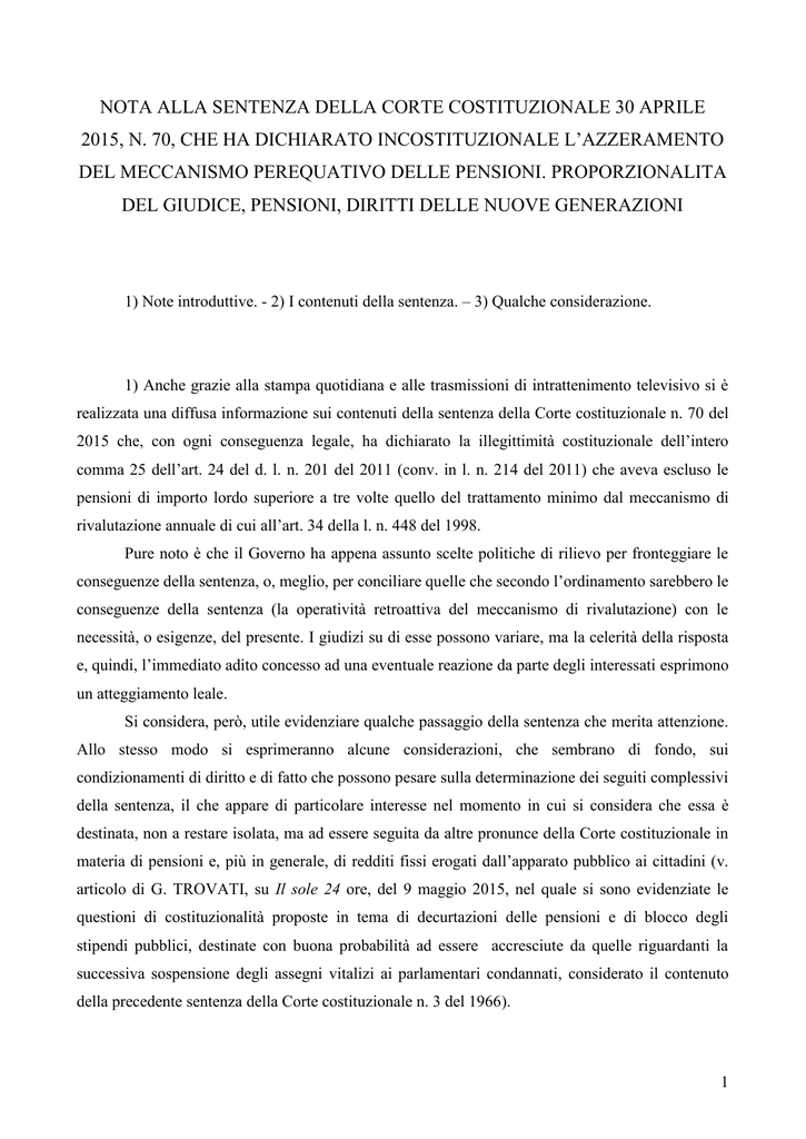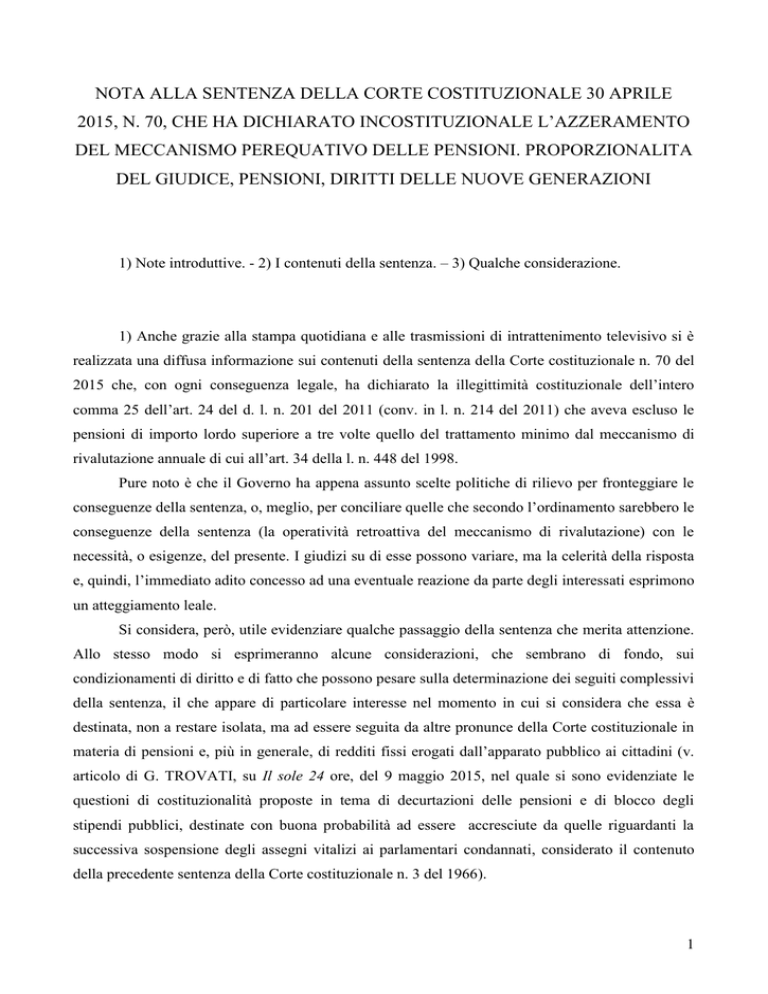 NOTA ALLA SENTENZA DELLA CORTE COSTITUZIONALE 30 APRILE 2015, N. 70, CHE HA DICHIARATO INCOSTITUZIONALE L‟AZZERAMENTO DEL MECCANISMO PEREQUATIVO DELLE PENSIONI. PROPORZIONALITA DEL GIUDICE, PENSIONI, DIRITTI DELLE NUOVE GENERAZIONI 1) Note introduttive. - 2) I contenuti della sentenza. – 3) Qualche considerazione. 1) Anche grazie alla stampa quotidiana e alle trasmissioni di intrattenimento televisivo si è realizzata una diffusa informazione sui contenuti della sentenza della Corte costituzionale n. 70 del 2015 che, con ogni conseguenza legale, ha dichiarato la illegittimità costituzionale dell‟intero comma 25 dell‟art. 24 del d. l. n. 201 del 2011 (conv. in l. n. 214 del 2011) che aveva escluso le pensioni di importo lordo superiore a tre volte quello del trattamento minimo dal meccanismo di rivalutazione annuale di cui all‟art. 34 della l. n. 448 del 1998. Pure noto è che il Governo ha appena assunto scelte politiche di rilievo per fronteggiare le conseguenze della sentenza, o, meglio, per conciliare quelle che secondo l‟ordinamento sarebbero le conseguenze della sentenza (la operatività retroattiva del meccanismo di rivalutazione) con le necessità, o esigenze, del presente. I giudizi su di esse possono variare, ma la celerità della risposta e, quindi, l‟immediato adito concesso ad una eventuale reazione da parte degli interessati esprimono un atteggiamento leale. Si considera, però, utile evidenziare qualche passaggio della sentenza che merita attenzione. Allo stesso modo si esprimeranno alcune considerazioni, che sembrano di fondo, sui condizionamenti di diritto e di fatto che possono pesare sulla determinazione dei seguiti complessivi della sentenza, il che appare di particolare interesse nel momento in cui si considera che essa è destinata, non a restare isolata, ma ad essere seguita da altre pronunce della Corte costituzionale in materia di pensioni e, più in generale, di redditi fissi erogati dall‟apparato pubblico ai cittadini (v. articolo di G. TROVATI, su Il sole 24 ore, del 9 maggio 2015, nel quale si sono evidenziate le questioni di costituzionalità proposte in tema di decurtazioni delle pensioni e di blocco degli stipendi pubblici, destinate con buona probabilità ad essere accresciute da quelle riguardanti la successiva sospensione degli assegni vitalizi ai parlamentari condannati, considerato il contenuto della precedente sentenza della Corte costituzionale n. 3 del 1966). 1 2) Nella sentenza sei elementi appaiono significativi. Il primo, evidente, sta nel dispositivo. Questo dichiara la incostituzionalità, non di significati o di insiemi di parole, ma di un intero comma di una legge. Non recando alcun limite o condizione a tale dichiarazione lascia collegare a questo tutte le conseguenze che l‟ordinamento stabilisce nei confronti di una norma dichiarata incostituzionale e, cioè, la cessazione di efficacia (v. art. 136 Cost.) e la cessazione di applicazione (v. art. 30 l. n. 87 del 1953), il che è la impossibilità di far valere in giudizio la norma stessa, insieme al disconoscimento ad essa di ogni attitudine a qualificare fattispecie ed è equivalente ad una ordinaria statuizione di annullamemento del Giudice amministrativo su un atto amministrativo. Il secondo, altrettanto evidente, sta nei punti 5, 6, 7 8 e 9 della motivazione. E‟ costituito dalla minuziosità con cui sono presentate le diverse disposizioni succedutesi nel tempo per limitare la rivalutazione delle pensioni e le diverse statuizioni della Corte e in questo contesto, della ripresa del passaggio di una precedente sentenza (la n. 316 del 2010), nel quale, da un lato, si finiva per ammettere la tollerabilità di un azzeramento della rivalutazione per le pensioni qualificate elevate perché di importo superiore ad 8 volte l‟importo di trattamento minimo, dall‟altro si rivolgeva un monito al legislatore sulla incostituzionalità di un prolungamento nel tempo di tale azzeramento (ciò a prescindere dalla pensione). Con questo la Corte è sembrata indicare una soglia di tollerabilità del sacrificio del trattamento pensionistico, e, cioè, la rivalutazione delle pensioni di importo più elevato, per un periodo di tempo circoscritto e, insieme, nel ricordare il precedente “monito”, è sembrata dare una spiegazione del proprio ricorso ad un annullamento radicale della disciplina sottoposta al suo giudizio (reiterante una lunga sequenza di altre dello stesso segno). Il terzo sta nel punto 3 ed è la dichiarazione di inammissibilità di una questione di legittimità costituzionale costruita sulla violazione del principio della certezza del diritto. Al riguardo si sottolinea che la Corte non ha escluso in termini generali che una compressione dei trattamenti pensionistici leda la certezza del diritto e che quest‟ultima sia un bene giuridico garantito dalla CEDU; questa conclusione non poteva esserci perché nella CEDU con insistenza la certezza del diritto è proposta come un principio, se non un bene tutelato, e alla stregua di essa una compressione delle aspettative pensionistiche costituisce una divergenza non recuperabile rispetto alle previsioni che ognuno può fare in ordine al proprio reddito. Semplicemente, la Corte ha preso atto che la ordinanza di rimessione aveva lamentato una violazione dell‟art. 117 della Costituzione attraverso la violazione della CEDU (da essa evocata sotto la specie di obbligo internazionale, come fattore di limitazione per la legislazione ordinaria), ma non aveva poi spiegato quale statuizione della CEDU sulla certezza del diritto fosse stata violata e, ulteriormente, i termini in cui ciò fosse 2 avvenuto ed aveva semplicemente richiamato un insieme di statuizioni contenute nella Carta dei diritti fondamentali della UE (in nessun caso qualificabile come attuativa o esplicativa della CEDU) tra i quali, indubbiamente, quello della certezza del diritto, senza nulla spiegare o argomentare. Resta, però, che nel preambolo della CEDU c‟è un