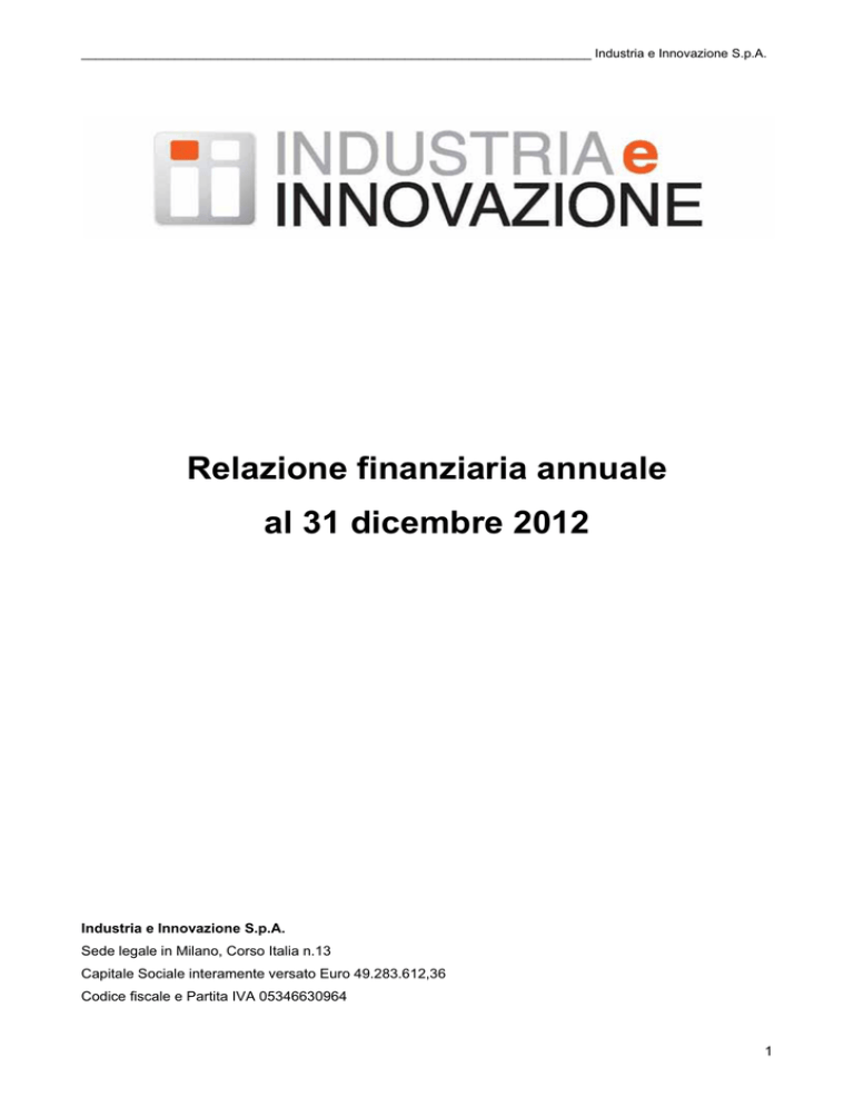 _______________________________________________________________________ Industria e Innovazione S.p.A. Relazione finanziaria annuale al 31 dicembre 2012 Industria e Innovazione S.p.A. Sede legale in Milano, Corso Italia n.13 Capitale Sociale interamente versato Euro 49.283.612,36 Codice fiscale e Partita IVA 05346630964 1 _______________________________________________________________________ Industria e Innovazione S.p.A. 1 INFORMAZIONI GENERALI .................................................................................................................. 4 1.1 Avviso di convocazione........................................................................................................................ 5 1.2 Organi Sociali ........................................................................................................................................ 8 1.3 Società del Gruppo Industria e Innovazione al 31 dicembre 2012 ................................................... 9 1.4 Azionisti ............................................................................................................................................... 10 2 RELAZIONE SULLA GESTIONE DEL GRUPPO INDUSTRIA E INNOVAZIONE .............................. 11 2.1 Premessa.............................................................................................................................................. 12 2.2 Principali operazioni del Gruppo Industria e Innovazione nel corso dell’esercizio 2012 ............ 14 2.2.1Generale ...................................................................................................................................... 14 2.2.2Sviluppo Energetico .................................................................................................................... 17 2.2.3Holding di partecipazioni .............................................................................................................. 18 2.3 Analisi dei risultati economici, patrimoniali e finanziari del Gruppo al 31 dicembre 2012.......... 19 2.4 Analisi dei risultati economici, patrimoniali e finanziari di Industria e Innovazione al 31 dicembre 2012 .................................................................................................................................... 25 2.5 Prospetto di raccordo tra il risultato e il patrimonio netto della capogruppo Industria e Innovazione S.p.A. e i corrispondenti valori del Gruppo ................................................................ 29 2.6 Attività di ricerca e sviluppo .............................................................................................................. 29 2.7 Corporate Governance ....................................................................................................................... 29 2.8 Documento programmatico sulla sicurezza .................................................................................... 30 2.9 Azioni proprie ...................................................................................................................................... 30 2.10 Fatti di rilievo avvenuti dopo il 31 dicembre 2012 ........................................................................... 30 2.11 Evoluzione prevedibile della gestione .............................................................................................. 31 2.11.1Sviluppo dei progetti nel settore delle energie rinnovabili .......................................................... 31 2.11.2Valorizzazione delle attività immobiliari ...................................................................................... 33 2.12 Operazioni con Parti Correlate e Infragruppo .................................................................................. 35 2.13 Principali rischi ed incertezze ............................................................................................................ 36 2.14 Attestazione ai sensi dell’Art. 2.6.2 Comma 12 del Regolamento di Borsa .................................. 40 2.15 Proposta di delibera ........................................................................................................................... 41 3 BILANCIO CONSOLIDATO ................................................................................................................. 42 3.1 Prospetti contabili consolidati .......................................................................................................... 43 3.1.1Situazione patrimoniale finanziaria............................................................................................... 43 3.1.2Conto economico complessivo..................................................................................................... 45 3.1.3Rendiconto finanziario .................................................................................................................. 46 3.1.4Movimentazione del patrimonio netto........................................................................................... 47 2 _______________________________________________________________________ Industria e Innovazione S.p.A. 3.2 Note ai prospetti contabili consolidati .............................................................................................. 48 3.2.1Informazioni di carattere generale e sul presupposto della continuità aziendale ........................ 48 3.2.2Principi contabili e criteri di valutazione ....................................................................................... 50 3.2.3Area di consolidamento ................................................................................................................ 68 3.2.4Note di commento ai risultati consolidati al 31 dicembre 2012 .................................................... 69 3.2.5Operazioni con Parti Correlate e Infragruppo .............................................................................. 96 3.2.6Politica di gestione dei rischi f