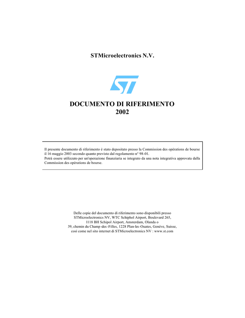 STMicroelectronics N.V. DOCUMENTO DI RIFERIMENTO 2002 Il presente documento di riferimento è stato depositato presso la Commission des opérations de bourse il 16 maggio 2003 secondo quanto previsto dal regolamento n° 98-01. Potrà essere utilizzato per un'operazione finanziaria se integrato da una nota integrativa approvata dalla Commission des opérations de bourse. Delle copie del documento di riferimento sono disponibili presso STMicroelectronics NV, WTC Schiphol Airport, Boulevard 265, 1118 BH Schipol Airport, Amsterdam, Olanda o 39, chemin du Champ -des -Filles, 1228 Plan-les -Ouates, Genève, Suisse, così come nel sito internet di STMicroelectronics NV : www.st.com Documento di Riferimento 2002 STMicroelectronics N.V. 1. RESPONSABILI DEL DOCUMENTO DI RIFERIMENTO E RESPONSABILI DELLA REVISIONE DEI CONTI ............................................................................... 5 1.1 RESPONSABILE DEL DOCUMENTO DI RIFERIMENTO 5 1.2 ATTESTAZIONE DEL RESPONSABILE DEL DOCUMENTO DI RIFERIMENTO 5 1.3 RESPONSABILI DELLA REVISIONE DEI BILANCI 5 1.3.0 Nomi e mandati dei revisori .......................................................................... 5 1.3.1 Attestazione della società di revisione: ........................................................... 5 1.4 Informativa societaria 9 1.5 Tasso di cambio 10 2. INFORMAZIONI RELATIVE ALL’OPERAZIONE ........................................10 3. INFORMAZIONI DI CARATTERE GENERALE RELATIVE ALLA SOCIETA' E AL SUO CAPITALE .............................................................................12 3.1 INFORMAZIONI DI CARATTERE GENERALE RELATIVE ALLA SOCIETA’ 12 3.1.0. Denominazione sociale, sede legale ed indirizzo del Membro Unico del Consiglio di Amministrazione Denominazione sociale......................................12 3.1.1. Forma giuridica ....................................................................................12 3.1.2 Legge applicabile .................................................................................12 3.1.3. Data di costituzione e durata della Società ..........................................16 3.1.4. Oggetto Sociale ....................................................................................16 3.1.5. Registro del Commercio e delle Società ..............................................16 3.1.6. Consultazione dei documenti societari ................................................16 3.1.7. Esercizio sociale...................................................................................16 3.1.8. Ripartizione degli utili .........................................................................16 3.1.9. Assemblee ............................................................................................17 3.1.10. Partecipazioni rilevanti ........................................................................18 3.1.11 Situazione fiscale degli azionisti francesi............................................19 3.2 INFORMAZIONI DI CARATTERE GENERALE RELATIVE AL CAPITALE 21 3.2.0. Modifica del capitale e dei diritti connessi alle azioni.........................21 3.2.1 Acquisto di azioni proprie da parte della Società ................................22 3.2.2. Capitale sociale al 31 marzo 2003 .......................................................22 3.2.3. Capitale autorizzato e non emesso al 31 marzo 2003 ..........................22 3.2.4. Titoli non rappresentativi del capitale..................................................23 3.2.5. Altri titoli che conferiscono il diritto di partecipazio ne al capitale ......23 3.2.6. Tabella riassuntiva dell'evoluzione del capitale...................................24 3.3 RIPARTIZIONE ATTUALE DEL CAPITALE E DEI DIRITTI DI VOTO 25 3.3.0. Azionariato della Società ....................................................................25 3.3.1. Mutamenti nella ripartizione del capitale nell'ultimo triennio .............25 3.3.2. Persone giuridiche che esercitano il controllo sulla Società ................26 3.3.3. Organigramma del Gruppo al 31 marzo 2003 .....................................34 3.4 MERCATO DEI TITOLI DELLA SOCIETA’ 34 3.4.0. Volumi scambiati e andamento del corso del titolo .............................35 3.4.1 Evoluzione del corso delle obbligazioni convertibili...........................37 2 Documento di Riferimento 2002 STMicroelectronics N.V. 3.5 DIVIDENDI E POLITICA DI DISTRIBUZIONE 38 4. INFORMAZIONI DI CARATTERE GENERALE RELATIVE ALL'ATTIVITA' DI STMICROELECTRONICS N.V. ..............................................39 4.1 PRESENTAZIONE DI STMICROELECTRONICS N.V. E DEL GRUPPO 39 4.1.0. Storia ....................................................................................................39 4.1.1. Presentazione del mercato dei semiconduttori.....................................39 4.1.2. Strategie della Società ..........................................................................42 4.1.3 Presentazione dell’attività della Società ..............................................47 4.1.4. Ripartizione per gruppi di prodotti e mercati geografici del fatturato netto realizzato .....................................................................................................62 4.1.5. Siti principali........................................................................................62 4.2. FATTORI DI RISCHIO 67 4.2.0 Rischi connessi all'industria dei semiconduttori ..................................67 4.2.1. Fattori di rischio connessi all’attività della Società .............................72 4.3 PROCEDIMENTI PENDENTI 82 4.4 PERSONALE 83 4.5 POLITICA DEGLI INVESTIMENTI 84 4.5.0 Ricerca e sviluppo ................................................................................84 4.5.1 Principali investimenti realizzati..........................................................86 4.5.2. Finanziamenti.......................................................................................86 4.6 PRINCIPALI FILIALI 