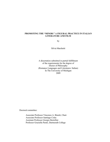 PROMOTING THE “MINOR:” A FIGURAL PRACTICE IN ITALIAN LITERATURE AND FILM by Silvia Marchetti A dissertation submitted in partial fulfillment of the requirements for the degree of Doctor of Philosophy (Romance Languages and Literatures: Italian) In The University of Michigan 2009 Doctoral committee: Associate Professor Vincenzo A. Binetti, Chair Associate Professor Santiago Colas Assistant Professor Giorgio Bertellini Professor Graziella Parati, Dartmouth College © Silvia Marchetti 2009 Per Simona ii Acknowledgements There are several people I was fortunate to meet during my years in graduate school who have contributed to making it a wonderful and life-changing experience. First, I would like to express my utmost gratitude to my dissertation committee members: Professors Vincenzo Binetti, Giorgio Bertellini, Santiago Colas, and Graziella Parati. I thank Vincenzo for his invaluable role as chair of my committee, for the precious advising and mentoring he offered me during these years and for his constant and unfaltering support and encouragement. For the same reasons, I owe much to Giorgio, the other great advisor and mentor I was privileged to have. I really appreciate the time he spent thinking with me and sharing his thoughts and perspectives. I also thank him for his caring guidance, his sense of humor and for teaching me how to be a “compulsive” editor of my work. I am also indebted to Santiago for encouraging me to study Deleuze and for our long and fruitful conversations on the importance of “becoming.” As evidenced by my work, that was a crucial intellectual lead! Last but not least, I am extremely grateful to Graziella who has always been “textually present” in my research on migration and who, as a member of my committee, provided several insightful comments on my work and on how to carry it forward. iii I thank my parents, Marina and Italo Marchetti, and my sister Valentina from the bottom of my heart for their unconditional love and support throughout my graduate school years and my whole life. I would never have gotten this far without them! A sweet thank you to my niece Maddalena, the most beautiful and precious little girl in the world, for the joy she has brought into my life and for considering me her best buddy. I would also like to thank all the Department of Romance Languages and Literatures faculty, staff, and students at the University of Michigan for creating a vibrant and exciting learning and teaching environment. In particular, I am grateful to Professor Alison Cornish for allowing me to re-discover and develop a whole new vision on Dante’s work; to Romana Habekovic, the director of the language program, as well as to the coordinators Sandra Palaich and Adelaide Smith for the way they supported me and helped me develop my own teaching approach and for their kindness and smiles. Many many thanks to my friends Andreea, Janaya, Melody, Michelle, and Gugu for the fun we had throughout these years, for the laughter and sad moments we shared, and the beautiful memories I will cherish forever. A special thank you to Gugu who, aware of my limited cooking skills, has nourished me with excellent food - and unique cheerfulness. A tutti, un enorme GRAZIE dal profondo del mio cuore! iv Table of Contents Dedication ii Acknowledgments iii Chapter I. Introduction 1 Alliances of texts 5 Methodological approach 7 The figural as an asignifying, sense-oriented force 10 Structural organization 16 II. Proliferation, deformation, silence: the language of Lessico famigliare (1963) and Il giardino dei Finzi-Contini (1962) 24 Lessico famigliare: the family sayings “ripetute infinite volte” 26 Ginzburg’s style 40 Il giardino dei Finzi-Contini: Micòl’s deformed and deforming language 49 Micòl’s transgressions: her amorous and linguistic alliances 57 The ambiguity of identity terms 66 III. Beyond representation: a-signifying practices in Federico Fellini’s Amarcord (1973) and Roberto Benigni’s La vita è bella (1997) 73 Federico Fellini’s Amarcord (1973) 73 The deforming potential of the Romagnolo dialect 77 Physical vs. evanescent: Fascists and the Socialist Internazionale 82 The “avvocato” and the chain of signification 86 The Grand Hotel and the myth of cosmopolitanism 96 La vita è bella by Roberto Benigni (1997) 100 “Il silenzio è il grido più forte:” The power of the unexplained 102 v Humor and the role of toscano 107 The fable of La vita è bella 117 IV. The Shoah and foreign immigration: La parola ebreo, Concorrenza sleale, and Lezioni di tenebra 127 Rosetta Loy’s La parola ebreo (1997) 128 The visuality of power 130 Annemarie’s clinical gaze 135 Loy’s familiar distance with the Shoah 141 Rosetta’s blindness and a collective purposeful forgetfulness 142 Testimony and silence. The example of Giorgio Levi and Eva Della Seta 146 Ettore Scola’s Concorrenza sleale (2001) 150 “43-97:” the Shoah encounters foreign immigration 153 The question of visibility 154 “Loro chi?:” the anomic condition of language 158 Other diseased forms of signification 163 The theatricality of the Fascist show 166 Helena Janeczek’s Lezioni di tenebra (1997) 171 Language and the mother 178 A motherless, dispersed mother tongue 183 V. Some theoretical implications of my textual analysis 195 Beyond Identity: Towards “belonging itself” 195 The (be)coming community of texts and its readers 200 Beyond linearity and chronology: Towards an in-between, unbounded time 204 Bibliography 211 Filmography 220 vi Chapter I Introduction il non riconoscibile, che è presente ma invisibile, dentro ogni oggetto o ambiente familiare Julio Monteiro Martins When literary scholars define literature as “minor,” they usually refer to a literary output that exists at the margins of a nation’s major literary production and that is produced by authors who belong to a certain minority. In their seminal work Kafka: Toward a Minor Literature (1989), Gilles Deleuze and 