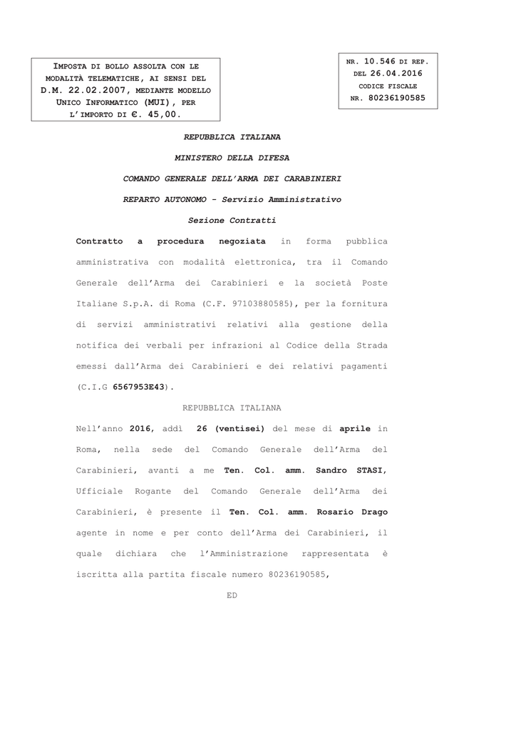 NR. IMPOSTA DI BOLLO ASSOLTA CON LE MODALITÀ TELEMATICHE, AI SENSI DEL D.M. 22.02.2007, MEDIANTE MODELLO UNICO INFORMATICO (MUI), PER L’IMPORTO DI €. 45,00. 10.546 DI REP. 26.04.2016 DEL CODICE FISCALE NR. 80236190585 REPUBBLICA ITALIANA MINISTERO DELLA DIFESA COMANDO GENERALE DELL’ARMA DEI CARABINIERI REPARTO AUTONOMO - Servizio Amministrativo Sezione Contratti Contratto a procedura amministrativa Generale con negoziata modalità dell’Arma dei in forma elettronica, Carabinieri e tra la pubblica il Comando società Poste Italiane S.p.A. di Roma (C.F. 97103880585), per la fornitura di servizi amministrativi relativi alla gestione della notifica dei verbali per infrazioni al Codice della Strada emessi dall’Arma dei Carabinieri e dei relativi pagamenti (C.I.G 6567953E43). REPUBBLICA ITALIANA Nell’anno 2016, addì Roma, nella Carabinieri, Ufficiale 26 (ventisei) del mese di aprile in sede del avanti a Rogante del Comando me Ten. Comando Generale Col. amm. Generale dell’Arma Sandro del STASI, dell’Arma dei Carabinieri, è presente il Ten. Col. amm. Rosario Drago agente in nome e per conto dell’Arma dei Carabinieri, il quale dichiara che l’Amministrazione rappresentata iscritta alla partita fiscale numero 80236190585, ED è Il Dott. Giammaria Mauro nato a Roma il 27 giugno 1964 procuratore di Poste Italiane S.p.A., con sede in Roma, Viale Europa n. 175 (come risulta dalla procura n. 50425 di rep. in data 02.07.2015 a rogito Ambrosone Notaio in Roma), il società rappresentata è del Dott. Pierluigi quale dichiara iscritta che la alla partita fiscale numero 97103880585 e iscritta nel registro della Sezione delle Società Commerciali di Roma al numero 97103880585; PREMESSO CHE a. l’Arma dei Carabinieri (d’ora in poi denominata “Arma”) e Poste Italiane (d’ora in poi denominata “Poste”) hanno firmato in data 5 dicembre 2000 un accordo di programma; b. è stato, quindi, completato uno studio finalizzato alla verifica della fattibilità normativa, operativa, tecnica ed economica della possibilità per Poste di gestire alcuni passi procedurali legati alla notificazione delle sanzioni amministrative per le infrazioni al Codice della Strada contestate dall’Arma; c. in data 11 giugno 2001 le predetta attività di gestione sono state disciplinate tramite un contratto, in forma pubblica amministrativa (n. 8.273 di rep. del 11 giugno 2001), rinnovato di anno in anno fino al 31 dicembre 2005. In data 22 marzo 2006 è stato stipulato fra le Parti un contratto valido ed efficace fino al 31 dicembre 2006 (n. 9.505 18/07/2007 è di rep. stato del 22 marzo firmato un 2006). contratto In data valido ed efficace fino al 31 dicembre 2007 (n. 9.670 di rep. del 18 luglio 2007). In data 24/04/2008 è stato firmato un contratto valido fino al 31 dicembre 2008 (n. 9.770 di rep. del 24 aprile 2008). In data 28.04.2009 è stato firmato un contratto valido fino al 31 dicembre 2009 (n. 9.872 di rep. del 28 aprile 2009). In data 20.10.2010 è stato firmato un contratto valido fino al 31 dicembre 2010 (n. 10.057 di rep. del 20 ottobre 2010). In data 12.07.2011 è stato firmato un contratto valido fino al 31 dicembre 2011 (n. 10.137 di rep. del 12 luglio 2011). In data 13.08.2012 è stato firmato un contratto valido fino al 31.12.2012 (n. 10.241 di rep. del 13 agosto 2012). In data 25.07.2013 è stato firmato un contratto valido fino al 31.12.2013 (n. 10.343 di rep. del 25 luglio 2013). In data 23 luglio 2014 è stato firmato un contratto valido fino al 31.12.2014 (n. 10.410 di rep. del 23 luglio 2014). In data 7 luglio 2015 è stato firmato un contratto valido fino al 31.12.2015 (n. 10.487 di rep. del 07 luglio 2015); d. Poste, in riferimento alle attività sopra specificate, ha comunicato la propria proposta per l’anno 2016, avente ad oggetto la stessa tipologia dei servizi e le stesse condizioni tecniche all’offerta praticate pubblica di nel 2015, in riferimento(SIN conformità atti grandi clienti) pubblicata sul sito www.poste.it e al relativo listino “prezzi” (trascritto nell’allegato “F”, che l’Arma dichiara espressamente di conoscere ed accettare con riferimento contratto e ai che servizi disciplinati costituisce parte dal presente integrante e sostanziale del presente contratto; e. le analisi di congruità svolte dall’Arma, circa gli oneri dei servizi offerti, sono state determinate, per ogni servizio, sulla base delle condizioni economiche pubblicate da Poste, ai sensi dell’art. 3 comma 2 della Delibera AGCOM 728/13/CONS del 19 dicembre 2013; f. sono a carico di Poste gli investimenti necessari alla predisposizione delle infrastrutture organizzative, umane e tecnologiche necessarie per l’erogazione dei servizi; g. l’Arma ha contratto richiesto espressamente in pubblica forma di sottoscrivere amministrativa, a il cura dell’Ufficiale Rogante così come previsto dall’art. 11 comma 13 del D.Lgs 163/2006; h. in riferimento all’attività specificata, la legge 20 novembre 1982, n. 890 in tema di notifica degli atti giudiziari a mezzo posta è stata modificata. In particolare, l’articolo 7 ultimo comma della legge n. 890/1982 - aggiunto dall’articolo 36, comma 2-quater del D.L. 31.12.2007, n. 248, nel testo integrato dalla legge di conversione n. 31/2008 – prevede che “Se il piego non viene consegnato personalmente al destinatario dell’atto, l’agente postale dà notizia al destinatario medesimo dell’avvenuta notificazione dell’atto a mezzo di lettera raccomandata.” Il comma 2-quinquies dell’articolo 36 del D. L. n. 248/2007, nel testo integrato dalla legge di conversione n. 31/2008, stabilisce che la disposizione di cui al comma 2-quater si applica ai procedimenti di notifica effettuati, ai sensi del suddetto articolo 7, a decorrere dalla data di entrata in vigore della legge n. 31/2008; i. In relazione all’intervenuta modifica normativa di cui alla L. 22.05.2010 n. 73, relativa al trattamento fiscale dei servizi postali, si rinvia a quan