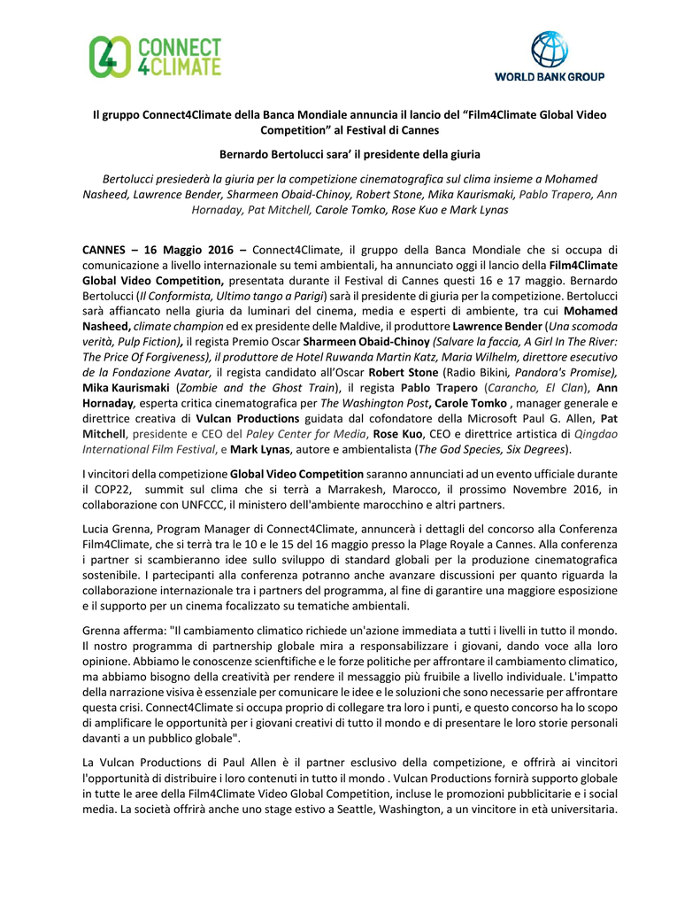 Il gruppo Connect4Climate della Banca Mondiale annuncia il lancio del “Film4Climate Global Video Competition” al Festival di Cannes Bernardo Bertolucci sara’ il presidente della giuria Bertolucci presiederà la giuria per la competizione cinematografica sul clima insieme a Mohamed Nasheed, Lawrence Bender, Sharmeen Obaid-Chinoy, Robert Stone, Mika Kaurismaki, Pablo Trapero, Ann Hornaday, Pat Mitchell, Carole Tomko, Rose Kuo e Mark Lynas CANNES – 16 Maggio 2016 – Connect4Climate, il gruppo della Banca Mondiale che si occupa di comunicazione a livello internazionale su temi ambientali, ha annunciato oggi il lancio della Film4Climate Global Video Competition, presentata durante il Festival di Cannes questi 16 e 17 maggio. Bernardo Bertolucci (Il Conformista, Ultimo tango a Parigi) sarà il presidente di giuria per la competizione. Bertolucci sarà affiancato nella giuria da luminari del cinema, media e esperti di ambiente, tra cui Mohamed Nasheed, climate champion ed ex presidente delle Maldive, il produttore Lawrence Bender (Una scomoda verità, Pulp Fiction), il regista Premio Oscar Sharmeen Obaid-Chinoy (Salvare la faccia, A Girl In The River: The Price Of Forgiveness), il produttore de Hotel Ruwanda Martin Katz, Maria Wilhelm, direttore esecutivo de la Fondazione Avatar, il regista candidato all’Oscar Robert Stone (Radio Bikini, Pandora's Promise), Mika Kaurismaki (Zombie and the Ghost Train), il regista Pablo Trapero (Carancho, El Clan), Ann Hornaday, esperta critica cinematografica per The Washington Post, Carole Tomko , manager generale e direttrice creativa di Vulcan Productions guidata dal cofondatore della Microsoft Paul G. Allen, Pat Mitchell, presidente e CEO del Paley Center for Media, Rose Kuo, CEO e direttrice artistica di Qingdao International Film Festival, e Mark Lynas, autore e ambientalista (The God Species, Six Degrees). I vincitori della competizione Global Video Competition saranno annunciati ad un evento ufficiale durante il COP22, summit sul clima che si terrà a Marrakesh, Marocco, il prossimo Novembre 2016, in collaborazione con UNFCCC, il ministero dell'ambiente marocchino e altri partners. Lucia Grenna, Program Manager di Connect4Climate, annuncerà i dettagli del concorso alla Conferenza Film4Climate, che si terrà tra le 10 e le 15 del 16 maggio presso la Plage Royale a Cannes. Alla conferenza i partner si scambieranno idee sullo sviluppo di standard globali per la produzione cinematografica sostenibile. I partecipanti alla conferenza potranno anche avanzare discussioni per quanto riguarda la collaborazione internazionale tra i partners del programma, al fine di garantire una maggiore esposizione e il supporto per un cinema focalizzato su tematiche ambientali. Grenna afferma: "Il cambiamento climatico richiede un'azione immediata a tutti i livelli in tutto il mondo. Il nostro programma di partnership globale mira a responsabilizzare i giovani, dando voce alla loro opinione. Abbiamo le conoscenze scienftifiche e le forze politiche per affrontare il cambiamento climatico, ma abbiamo bisogno della creatività per rendere il messaggio più fruibile a livello individuale. L'impatto della narrazione visiva è essenziale per comunicare le idee e le soluzioni che sono necessarie per affrontare questa crisi. Connect4Climate si occupa proprio di collegare tra loro i punti, e questo concorso ha lo scopo di amplificare le opportunità per i giovani creativi di tutto il mondo e di presentare le loro storie personali davanti a un pubblico globale". La Vulcan Productions di Paul Allen è il partner esclusivo della competizione, e offrirà ai vincitori l'opportunità di distribuire i loro contenuti in tutto il mondo . Vulcan Productions fornirà supporto globale in tutte le aree della Film4Climate Video Global Competition, incluse le promozioni pubblicitarie e i social media. La società offrirà anche uno stage estivo a Seattle, Washington, a un vincitore in età universitaria. Carole Tomko, manager generale e direttrice creativa di Vulcan Productions, afferma: "sostenere i giovani e gli aspiranti registi è una parte fondamentale della nostra missione, e crediamo che la narrazione sia un potente strumento, non solo per stimolare la consapevolezza, ma anche per catalizzare il cambiamento delle abitudini. C4C è stato un partner incredibile nelle nostre iniziative ambientali e non vediamo l'ora di unire le nostre forze, di collaborare a stretto contatto con i registi che manderanno i propri lavori al concorso". La Global Video Competition lanciata da Film4Climate invita aspiranti giovani registi provenienti da tutto il mondo ad esprimere la loro visione per un futuro sostenibile attraverso la creazione di un cortometraggio o un video incentrato su misure contro il cambiamento climatico. Il concorso invita i registi a riflettere sul 13 ° degli Obiettivi di Sviluppo Sostenibile delle Nazioni Unite— Lotta contro il cambiamento climatico... Adottare misure urgenti per combattere il cambiamento climatico e le sue conseguenze— sottolineando ciò che gli individui e le comunità di tutto il mondo stanno facendo per promuovere l’attivismo, offrire soluzioni e ispirare un cambiamento positivo per combattere il cambiamento climatico e le sue conseguenze. I registi sono invitati a proporre racconti personali che esplorino questioni fondamentali come: Cosa significa il cambiamento climatico per me? Quali misure sto prendendo per mitigare l'avanzata del riscaldamento globale? Qual è il mio messaggio che spinga il mondo ad attivarsi per il clima? Per qualificarsi, i film devono essere di cinque minuti, e il concorso è aperto a registi tra i 14 e i 35 anni. Le iscrizioni saranno aperte fino al 15 settembre. Per il regolamento della competizione e i requisiti di idoneità, si prega di visitare: connect4climate.org "Il cambiamento climatico è una sfida globale che non rispetta le persone o i confini nazionali", ha dichiarato Dan Thomas, direttore delle comunicazioni per 