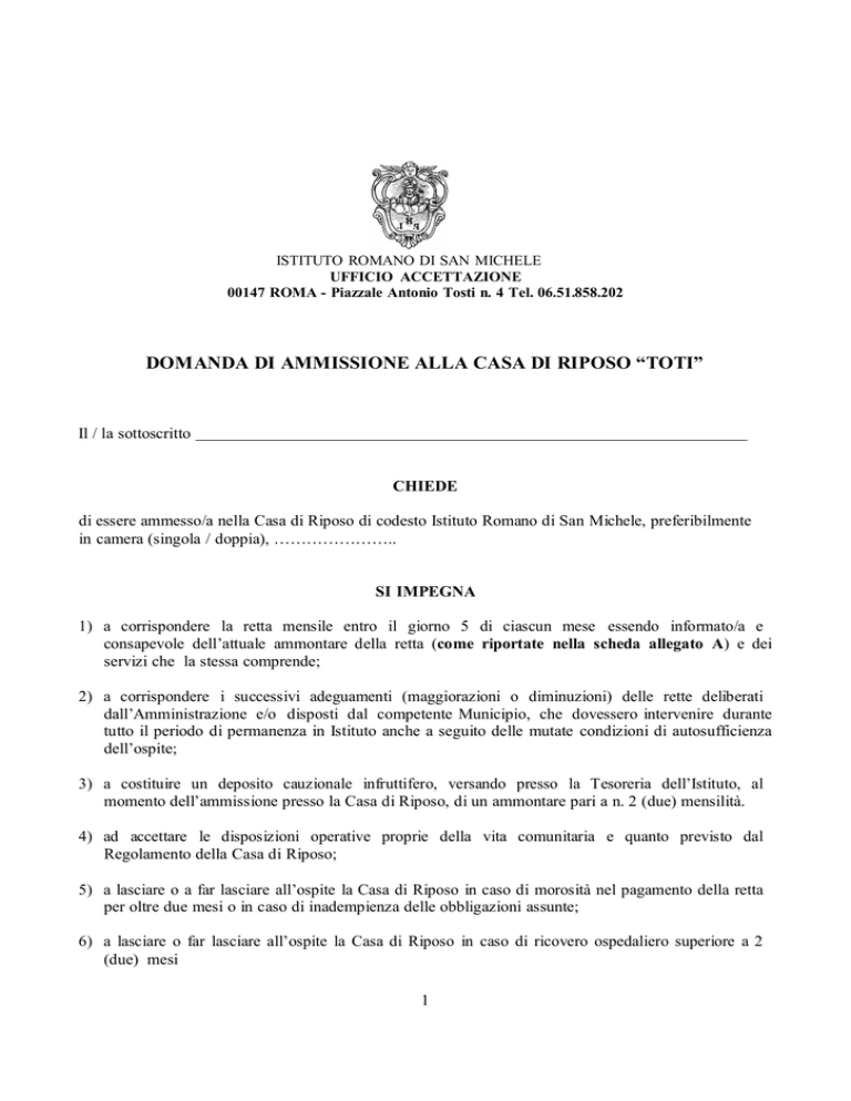 ISTITUTO ROMANO DI SAN MICHELE UFFICIO ACCETTAZIONE 00147 ROMA - Piazzale Antonio Tosti n. 4 Tel. 06.51.858.202 DOMANDA DI AMMISSIONE ALLA CASA DI RIPOSO “TOTI” Il / la sottoscritto CHIEDE di essere ammesso/a nella Casa di Riposo di codesto Istituto Romano di San Michele, preferibilmente in camera (singola / doppia), ………………….. SI IMPEGNA 1) a corrispondere la retta mensile entro il giorno 5 di ciascun mese essendo informato/a e consapevole dell’attuale ammontare della retta (come riportate nella scheda allegato A) e dei servizi che la stessa comprende; 2) a corrispondere i successivi adeguamenti (maggiorazioni o diminuzioni) delle rette deliberati dall’Amministrazione e/o disposti dal competente Municipio, che dovessero intervenire durante tutto il periodo di permanenza in Istituto anche a seguito delle mutate condizioni di autosufficienza dell’ospite; 3) a costituire un deposito cauzionale infruttifero, versando presso la Tesoreria dell’Istituto, al momento dell’ammissione presso la Casa di Riposo, di un ammontare pari a n. 2 (due) mensilità. 4) ad accettare le disposizioni operative proprie della vita comunitaria e quanto previsto dal Regolamento della Casa di Riposo; 5) a lasciare o a far lasciare all’ospite la Casa di Riposo in caso di morosità nel pagamento della retta per oltre due mesi o in caso di inadempienza delle obbligazioni assunte; 6) a lasciare o far lasciare all’ospite la Casa di Riposo in caso di ricovero ospedaliero superiore a 2 (due) mesi 1 7) per quanto attiene il pagamento della retta mensile, ad accreditare la propria pensione, o presso il Tesoriere dell’Istituto Romano di San Michele - presente all’interno del comprensorio istituzionale di Piazzale Antonio Tosti n. 4, - o presso la Banca di fiducia autorizzando la stessa, contestualmente e irrevocabilmente, ad effettuare con cadenza mensile il bonifico in favore dell’Istituto Romano di San Michele per il pagamento della retta dovuta, per il periodo di permanenza presso la Casa di Riposo; Ai fini della presente domanda il sottoscritto DICHIARA a) di essere nat ….. il ……………………… in ………………………………..( ….. )………….................... b) di essere residente in ………………………………Via …………………………………n………………... c) di essere domiciliato in …………………………..Via ……………………n……………………………….. telefono……………………………………….. cod.fisc ………………………………………………………... c) che la sua famiglia risulta composta come dal seguente prospetto: Cognome e Nome Luogo e data di nascita Rapporto con il dichiarante Stato civile d) di essere a conoscenza che l’ammissione è subordinata ad un periodo di prova di mesi 2, trascorsi i quali, se l’ospite non risulterà idoneo ne conseguirà che: il firmatario della dichiarazione di assunzione di responsabilità sarà tenuto a riprendere l’ospite e ricondurlo presso il suo domicilio; per gli ospiti i quali non hanno un referente firmatario della dichiarazione di responsabilità, si provvederà da parte dell’Istituto alle dimissioni dell’ospite; e) di essere a conoscenza che, in caso di ritardato pagamento della retta, l’Istituto applicherà un interesse di mora pari al tasso legale; f) di essere a conoscenza che nella eventualità in cui l’ospite dovesse ritardare l’uscita dall’Istituto sarà dovuta una penale giornaliera pari al doppio della retta. g) di essere a conoscenza che il posto letto presso la Casa di Riposo viene conservato in caso di ricovero ospedaliero per 2 (due) mesi. Trascorso tale periodo si darà luogo alle dimissioni d’ufficio senza altro preavviso. g) di accettare nella sua interezza quanto contenuto nel REGOLAMENTO DELLA CASA DI RIPOSO avendone preso visione presso il sito web dell’Ente: www.irsm.it o presso l’Ufficio Accettazione. 2 Allega alla presente dichiarazione i seguenti documenti in fotocopia: 1. Documento di riconoscimento; 2. Certificato di pensione (mod. INPS “O bis M” e CUD o equipollente documento rilasciato da altro Ente), ed eventuale dichiarazione dei redditi (modello UNICO); 3. Libretto sanitario/tessera sanitaria; 4. Codice fiscale; 5. Questionario sanitario (a cura del medico di base); 6. Certificato attestante l’esenzione da malattie infettive (a cura del medico di base); 7. Eventuale copia del verbale d’invalidità o accompagno; 8. Dichiarazione di assunzione di responsabilità da parte di un familiare o referente e relativa certificazione reddituale; 9. Test cutaneo alla tubercolina (se positivo, anche RX torace) 10. T P H A 11. H B s A G 12. H C V 13. Esami del sangue recenti o pregressi 14. Elettrocardiogramma con visita cardiologia recente. L’aspirante ospite in situazione di parziale autosufficienza inoltre, dovrà produrre all’atto della visita di accettazione la seguente ulteriore documentazione, ( tale documentazione dovrà essere disponibile entro il termine massimo di trenta giorni dall’invito a visita): 1) Valutazione multidimensionale geriatrica, rilasciata dalla ASL o da Enti ospedalieri; 2) Certificato di Videat Psichiatrico; In caso di esito positivo della visita e del colloquio dovranno essere prodotte le seguenti autorizzazioni: 1) 2) Autorizzazione all’accredito della pensione presso la Banca di fiducia e contestuale delega, irrevocabile alla stessa per il prelievo e il pagamento della retta mensile dell’Istituto ovvero Autorizzazione all’accredito della pensione presso la Tesoreria dell’Istituto e delega per il prelievo diretto della retta; Informativa ai sensi dell’art. 7 del D.Lgs. 196/2003 Tutti i dati personali raccolti dall’Istituto Romano di San Michele sono trattati conservati ai sensi e per gli effetti del Decreto Legislativo del 30 giugno 2003 ed esclusivamente per fini gestionali e amministrativi. Tali dati potranno comprendere anche a
