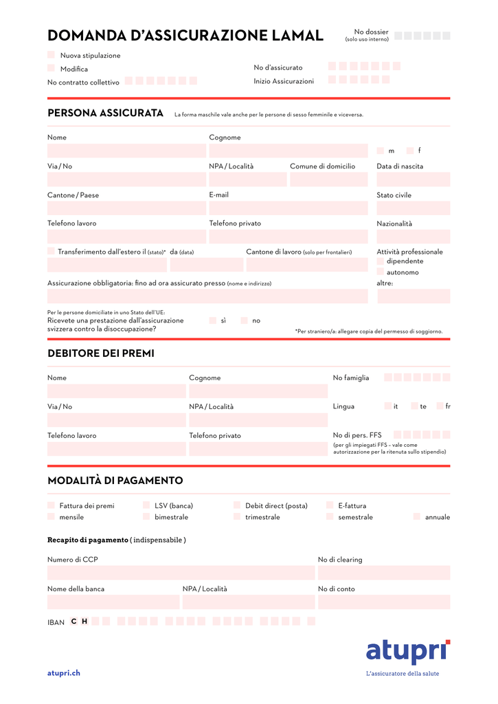 DOMANDA D’ASSICURAZIONE LAMAL No dossier (solo uso interno) Nuova stipulazione No d’assicurato Modifica Inizio Assicurazioni No contratto collettivo PERSONA ASSICURATA La forma maschile vale anche per le persone di sesso femminile e viceversa. Nome Cognome m Comune di domicilio Via / No NPA / Località Cantone / Paese E-mail Stato civile Telefono lavoro Telefono privato Nazionalità Transferimento dall’estero il (stato)* da (data) Cantone di lavoro (solo per frontalieri) Assicurazione obbligatoria: fino ad ora assicurato presso (nome e indirizzo) Per le persone domiciliate in uno Stato dell’UE: sì Ricevete una prestazione dall’assicurazione svizzera contro la disoccupazione? f Data di nascita Attività professionale dipendente autonomo altre: no *Per straniero/a: allegare copia del permesso di soggiorno. DEBITORE DEI PREMI Nome Cognome No famiglia Via / No NPA / Località Lingua Telefono lavoro Telefono privato No di pers. FFS it te fr (per gli impiegati FFS – vale come autorizzazione per la ritenuta sullo stipendio) MODALITÀ DI PAGAMENTO Fattura dei premi LSV (banca) Debit direct (posta) E-fattura mensile bimestrale trimestrale semestrale Recapito di pagamento ( indispensabile ) Numero di CCP Nome della banca IBAN C H atupri.ch No di clearing NPA / Località No di conto annuale ASSURANCE DE BASE – ASSURANCES SELON LA LAMAL No dossier (solo uso interno) MARQUER D’UNE CROIX CE QUI CONVIENT PREMI MENSILI Standard TelFirst HMO Centro Nel caso dei modelli HMO, HMO Gesundheitsplan Basel / MediX Ärztenetz Bern / Ärztenetz Nordwest (BL, BS) /Réseau Delta Genève et Vaud / Wintimed Winterthur / Medix Ärztenetz Zürich / LimmiMed Ärztenetz Limmattal / LuMed Ärztenetz Luzern / SäntiMed Ärztenetz Ostschweiz Per favore indicare il nome del medico: CareMed Nome, cognome indirizzo medico di famiglia CareMed FlexCare Stipulabile dapprima solo nelle città di Zurigo e Berna (compresi i comuni di Bolligen, Bremgarten bei Bern, Kirchlindach, Köniz, Muri bei Bern, Oberbalm, Stettlen, Vechigen, Wohlen bei Bern, Zollikofen, Ittigen, Ostermundigen, Bienne ed Evilard) e dall’1.1.2016 nella città di Lucerna (compresi i comuni di Ebikon, Emmen, Horw e Kriens). Con copertura dell’infortunio sì no (pregasi allegare conferma del datore di lavoro) CHF Franchigia annua ordinaria CHF 300.–CHF Franchigia annua opzionale CHF 500.– CHF 1’000.– CHF 2’000.– CHF 2’500.– CHF 1’500.–CHF INFORMAZIONI AI CLIENTI ATUPRI Se le informazioni alla clientela sono disponibili in formato cartaceo ed elettronico, desidero l’invio per posta per e-mail il mio indirizzo e-mail Dichiarazione di adesione Con la presente dichiaro di avere risposto in modo veritiero zioni necessarie per l’adempimento dei loro compiti ai sensi e completo alla domanda di adesione. Inoltre confermo la dell’art. 57 LAMal, vale a dire tutte le informazioni necessa- ricezione delle Condizioni generali di assicurazione sull‘assi- rie alla valutazione di questioni sulla remunerazione e l’ap- curazione obbligatoria delle cure medico-sanitarie. Ho inol- plicazione delle tariffe nonché alla verifica dei requisiti di tre preso atto del fatto che i fornitori di prestazioni devono obbligo della prestazione dell’Atupri. trasmettere ai medici di fiducia dell’Atupri tutte le informa- Località, data Firma del richiedente risp. del suo rappresentante legale Per favore inviate la proposta compilata a: Contact Center, Atupri Assicurazione della salute, Zieglerstrasse 29, Postfach 8717, 3001 Bern Solo per uso interno (lasciare vuoto) Codice collaboratore Codice intermediario / Nota: la preghiamo di disdire le assicurazioni complementari esistenti solo dopo avere ricevuto il nostro consenso scritto. IMPORTANTI INFORMAZIONI SULLE DISDETTE Gentili clienti Atupri vi aiuta a sbrigare le formalità di disdetta. Su richiesta provvediamo noi per Lei a tutta la procedura, purché i – l a presente scheda informativa sulle disdette, completata e firmata documenti elencati qui di seguito ci pervengano almeno 10 – la / le lettera/e di disdetta, completata/e e firmata/e giorni lavorativi prima della scadenza del termine di disdet- – l a domanda di assicurazione qui allegata, debitamente ta e non siano necessarie alcune chiarificazioni aggiuntive firmata per l‘esame dello stato di salute. In tal caso vi preghiamo di inviarci nella busta allegata i seguenti documenti: VI PREGHIAMO DI OSSERVARE I DIVERSI TERMINI DI DISDETTA: Assicurazioni Termine di disdetta massimo* Assicurazione obbligatoria delle cure medico-sanitarie Ogni anno entro il 31 marzo** e il 30 novembre o entro l’ultimo giorno lavorativo nei mesi di marzo e novembre Assicurazioni complementari di solito ogni anno entro il 30 settembre Attenzione: alcune assicurazioni prevedono dei termini di disdetta più lunghi o contratti pluriennali. * vale la data di arrivo presso il vecchio assicuratore ** solo in caso di franchigia di CHF 300.– Per chiarire l’ulteriore procedere ed evitare malintesi, vi preghiamo di apporre una crocetta su una delle due caselle: invio la disdetta da solo incarico Atupri di sbrigare le formalità di disdetta La disdetta delle assicurazioni complementari è possibile il Vantaggi e svantaggi dello splitting Il cambiamento dell’assicurazione obbligatoria delle cure il passaggio all’assicurazione obbligatoria delle cure medi- medicosanitarie non è assolutamente problematico, a con- cosanitarie avviene il 1° gennaio. Il passaggio alle assicura- dizione che la disdetta avvenga per tempo. Per stipulare zioni complementari non è invece possibile o può avvenire un’assicurazione complementare è invece necessario un’e- solo in un secondo tempo. Il termine di disdetta può essere same della salute che potrebbe richiedere un po’ di tempo. già scaduto, l’esame della salute può richiedere molto tem- Talvolta, l’inizio dell’assicurazione può così ritardare di un po o il passaggio non può avvenire per motivi di salute. ann