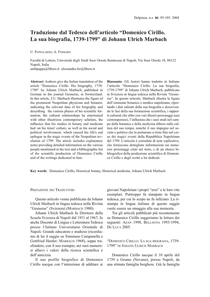 Delpinoa, n.s. 46: 95-105. 2004 Traduzione dal Tedesco dell’articolo “Domenico Cirillo. La sua biografia, 1739-1799” di Johann Ulrich Marbach U. PAPPALARDO, A. FERRARO Facoltà di Lettere, Università degli Studi Suor Orsola Benincasa di Napoli, Via Suor Orsola 10, 80132 Napoli, Italia [email protected] [email protected] Abstract. Authors give the Italian translation of the article “Domenico Cirillo. His biography, 17391799” by Johann Ulrich Marbach, published in German in the journal Gesnerus, in Switzerland. In this article, J.U. Marbach illustrates the figure of the prominent Neapolitan physician and botanist, indicating the relevant data of his biography and describing the various phases of his scientific formation, the cultural relationships he entertained with other illustrious contemporary scholars, the influence that his studies in botany and medicine had on his times' culture, as well as his social and political involvement, which caused his life's sad epilogue in the tragic events of the Neapolitan revolution of 1799. The article includes explanatory notes providing detailed information on the various people mentioned in the text and a bibliographic list of the scientific production of Domenico Cirillo and of the writings dedicated to him. Riassunto. Gli Autori hanno tradotto in Italiano l’articolo “Domenico Cirillo. La sua biografia, 1739-1799” di Johann Ulrich Marbach, pubblicato in Svizzera in lingua tedesca nella Rivista “Gesnerus”. In questo articolo, Marbach illustra la figura dell’eminente botanico e medico napoletano, riportando i dati salienti della sua biografia e descrivendo le fasi della sua formazione scientifica, i rapporti culturali che ebbe con vari illustri personaggi suoi contemporanei, l’influenza che i suoi studi nel campo della botanica e della medicina ebbero sulla cultura del suo tempo, nonchè il suo impegno nel sociale e politico che lo portarono a triste fine nel corso dei tragici eventi della Repubblica Napoletana del 1799. L’articolo è corredato di note esplicative, che forniscono dettagliate informazioni sui numerosi personaggi citati nel testo, e di un elenco bibliografico della produzione scientifica di Domenico Cirillo e degli scritti a lui dedicati. Key words: Domenico Cirillo, Historical botany, Historical medicine, Johann Ulrich Marbach PREFAZIONE DEI TRADUTTORI Questo articolo venne pubblicato da Johann Ulrich Marbach in lingua tedesca nella Rivista “Gesnerus” (Svizzera) (MARBACH 1980). Johann Ulrich Marbach fu Direttore della Scuola Svizzera di Napoli dal 1951 al 1967; fu anche Docente di Lingua e Letteratura Tedesca presso l’Istituto Universitario Orientale di Napoli. Grande educatore e studioso (ricordiamo di lui il saggio su Tommaso Campanella e Gottfried Herder; MARBACH 1968), seppe trasfondere, con il suo esempio, nei suoi numerosi allievi i valori della ricerca scientifica e dell’amicizia. Il suo profilo biografico di Domenico Cirillo nacque con l’intenzione di additare ai giovani Napoletani i propri “eroi” e le loro vite esemplari. Purtroppo fu stampato in lingua tedesca, per cui lo scopo ne fu inficiato. La ristampa in lingua italiana di questo saggio vuole essere un omaggio alla sua memoria. Tra gli articoli pubblicati più recentemente su Domenico Cirillo suggeriamo la lettura dei seguenti: AZAN 1998, BELLAVITA 1993-1994, DE LUCA 2005. “DOMENICO CIRILLO. LA SUA BIOGRAFIA, 17391799” DI JOHANN ULRICH MARBACH Domenico Cirillo nacque il 10 aprile del 1739 a Grumo (Nevano), presso Napoli, da una stimata famiglia borghese. Già la famiglia riuscì a stimolare il suo ingegno non comune. Il padre Innocenzio era nipote di Nicola Cirillo [1], la madre, una Capasso, era la nipote di Nicola Capasso [2]. Dotato di talento precoce, a sette anni raggiunse a Napoli lo zio Sante Cirillo (Salvator Cyrillus), che era un noto naturalista del tempo. Lo zio prese a cuore la sua formazione e in un resoconto ai genitori poté raccontare dei suoi eccezionali progressi. Domenico lasciava intravedere un grande futuro. Bravi insegnanti istruirono Cirillo in Greco e in Latino. A poco a poco fu introdotto nella filosofia e nelle discipline matematiche. Imparò anche a disegnare. Le ore della giornata furono ripartite con cura e impiegate proficuamente. Spinto da infantile curiosità, di tanto in tanto faceva compagnia allo zio, mentre costui si dedicava all’Orto Botanico lasciatogli in eredità dallo zio Nicola Cirillo. Così nacque in lui una propensione verso le scienze naturali. Prese infatti l’abitudine di stare affianco allo zio quando questi era impegnato a curare oppure a raccogliere le piante per disegnarle, classificarle e aggiungerle all’erbario. Partecipando a queste attività, il fanciullo passò gradualmente dalla pura e semplice curiosità alla conoscenza scientifica della materia. Gli allievi, i collaboratori e gli amici di Sante Cirillo, come ad esempio Nicola Pacifico, Angiolo Fasano, Natale Lettieri [3], Nicola Braucci [4] e Vincenzo Petagna [5], erano tutti esperti di botanica. Questi si stupivano di fronte all’ingegno vivace, alla perspicacia, alla serietà del piccolo Domenico, il quale, con i suoi ragionamenti e le sue osservazioni, precorreva di molto la sua età. Di ciò si rallegrava lo zio e, poiché si era accorto che le capacità di apprendimento del nipote erano notevoli, iniziò a trasmettergli le prime nozioni teoriche della scienza e a spiegargli l’intero sistema di Tournerfort [6]. Francesco Serao [7] era stato allievo di Nicola Cirillo e serbava per lui riconoscenza e stima. Frequentava assiduamente la casa del maestro, intrattenendo lunghe conversazioni con Sante Cirillo, per cui seguiva con interesse anche i progressi del giovane. Non gli fu difficile destare nell’adolescente interesse per la medicina. Domenico, con il consenso dello zio, iniziò quindi lo studio anche di questa scienza. In tempi incredibilmente brevi compì l’intero percorso di studi accademici press