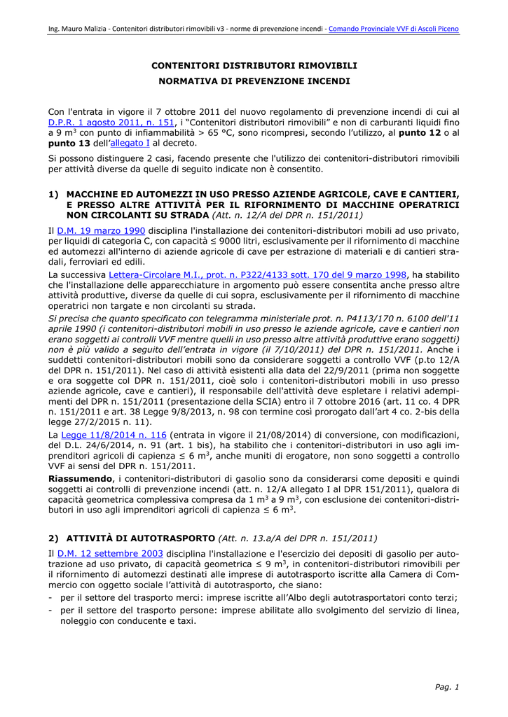 Ing. Mauro Malizia - Contenitori distributori rimovibili v3 - norme di prevenzione incendi - Comando Provinciale VVF di Ascoli Piceno CONTENITORI DISTRIBUTORI RIMOVIBILI NORMATIVA DI PREVENZIONE INCENDI Con l'entrata in vigore il 7 ottobre 2011 del nuovo regolamento di prevenzione incendi di cui al D.P.R. 1 agosto 2011, n. 151, i “Contenitori distributori rimovibili” e non di carburanti liquidi fino a 9 m3 con punto di infiammabilità > 65 °C, sono ricompresi, secondo l’utilizzo, al punto 12 o al punto 13 dell’allegato I al decreto. Si possono distinguere 2 casi, facendo presente che l'utilizzo dei contenitori-distributori rimovibili per attività diverse da quelle di seguito indicate non è consentito. 1) MACCHINE ED AUTOMEZZI IN USO PRESSO AZIENDE AGRICOLE, CAVE E CANTIERI, E PRESSO ALTRE ATTIVITÀ PER IL RIFORNIMENTO DI MACCHINE OPERATRICI NON CIRCOLANTI SU STRADA (Att. n. 12/A del DPR n. 151/2011) Il D.M. 19 marzo 1990 disciplina l'installazione dei contenitori-distributori mobili ad uso privato, per liquidi di categoria C, con capacità ≤ 9000 litri, esclusivamente per il rifornimento di macchine ed automezzi all'interno di aziende agricole di cave per estrazione di materiali e di cantieri stradali, ferroviari ed edili. La successiva Lettera-Circolare M.I., prot. n. P322/4133 sott. 170 del 9 marzo 1998, ha stabilito che l'installazione delle apparecchiature in argomento può essere consentita anche presso altre attività produttive, diverse da quelle di cui sopra, esclusivamente per il rifornimento di macchine operatrici non targate e non circolanti su strada. Si precisa che quanto specificato con telegramma ministeriale prot. n. P4113/170 n. 6100 dell'11 aprile 1990 (i contenitori-distributori mobili in uso presso le aziende agricole, cave e cantieri non erano soggetti ai controlli VVF mentre quelli in uso presso altre attività produttive erano soggetti) non è più valido a seguito dell’entrata in vigore (il 7/10/2011) del DPR n. 151/2011. Anche i suddetti contenitori-distributori mobili sono da considerare soggetti a controllo VVF (p.to 12/A del DPR n. 151/2011). Nel caso di attività esistenti alla data del 22/9/2011 (prima non soggette e ora soggette col DPR n. 151/2011, cioè solo i contenitori-distributori mobili in uso presso aziende agricole, cave e cantieri), il responsabile dell'attività deve espletare i relativi adempimenti del DPR n. 151/2011 (presentazione della SCIA) entro il 7 ottobre 2016 (art. 11 co. 4 DPR n. 151/2011 e art. 38 Legge 9/8/2013, n. 98 con termine così prorogato dall’art 4 co. 2-bis della legge 27/2/2015 n. 11). La Legge 11/8/2014 n. 116 (entrata in vigore il 21/08/2014) di conversione, con modificazioni, del D.L. 24/6/2014, n. 91 (art. 1 bis), ha stabilito che i contenitori-distributori in uso agli imprenditori agricoli di capienza ≤ 6 m3, anche muniti di erogatore, non sono soggetti a controllo VVF ai sensi del DPR n. 151/2011. Riassumendo, i contenitori-distributori di gasolio sono da considerarsi come depositi e quindi soggetti ai controlli di prevenzione incendi (att. n. 12/A allegato I al DPR 151/2011), qualora di capacità geometrica complessiva compresa da 1 m3 a 9 m3, con esclusione dei contenitori-distributori in uso agli imprenditori agricoli di capienza ≤ 6 m3. 2) ATTIVITÀ DI AUTOTRASPORTO (Att. n. 13.a/A del DPR n. 151/2011) Il D.M. 12 settembre 2003 disciplina l'installazione e l'esercizio dei depositi di gasolio per autotrazione ad uso privato, di capacità geometrica ≤ 9 m3, in contenitori-distributori rimovibili per il rifornimento di automezzi destinati alle imprese di autotrasporto iscritte alla Camera di Commercio con oggetto sociale l’attività di autotrasporto, che siano: - per il settore del trasporto merci: imprese iscritte all’Albo degli autotrasportatori conto terzi; - per il settore del trasporto persone: imprese abilitate allo svolgimento del servizio di linea, noleggio con conducente e taxi. Pag. 1 Ing. Mauro Malizia - Contenitori distributori rimovibili v3 - norme di prevenzione incendi - Comando Provinciale VVF di Ascoli Piceno DM 19 marzo 1990 Norme per il rifornimento di carburanti, a mezzo di contenitori – distributori mobili, per macchine in uso presso aziende agricole, cave e cantieri. N. ATTIVITÀ Depositi e/o rivendite di liquidi infiammabili e/o combustibili e/o oli lubrificanti, diatermici, di 12 qualsiasi derivazione, di capacità geometrica complessiva superiore a 1 m3 CATEGORIA A B C liquidi con punto di infiammabilità superiore a 65 °C per capacità geometrica complessiva compresa da 1 m3 a 9 m3 liquidi infiammabili e/o combustibili e/o lubrificanti e/o oli diatermici di qualsiasi derivazione per capacità geometrica complessiva compresa da 1 m3 a 50 m3, ad eccezione di quelli indicati nella col. A) liquidi infiammabili e/o combustibili e/o lubrificanti e/o oli diatermici di qualsiasi derivazione per capacità geometrica complessiva > 50 m3 Il Ministro dell'interno di concerto con il Ministro delle finanze e il ministro dell'industria del commercio e dell'artigianato Visto l'art. 63 del TULPS 18/7/1931, n. 733; Visto l'art. 23 del regio decreto-legge 2/11/1933, n. 1741; Visto il decreto del Ministro dell'interno 31/7/1934 recante le norme di sicurezza per la lavorazione, l'immagazzinamento, l'impiego e la vendita di olii minerali e per il trasporto degli olii stessi; Vista la circolare del Ministero dell'interno n. 10 del 10/2/1969 relativa ai distributori stradali di carburante; Visto il decreto del Ministro dell'interno 30/11/1983 recante termini, definizioni generali e simboli grafici di prevenzione incendi; Visto l'art. 21 del dPR 29/7/1982, n. 577; Sentita la commissione consultiva per le sostanze esplosive ed infiammabili del Ministero dell'interno; Rilevata la necessità di integrare l'art. 82 del dM dell'interno 31/7/1934 e disciplinare in maniera organica la materia relativa al rifornimento di carburanti, a mezzo di contenitori - distributori mobili, per macchine in 