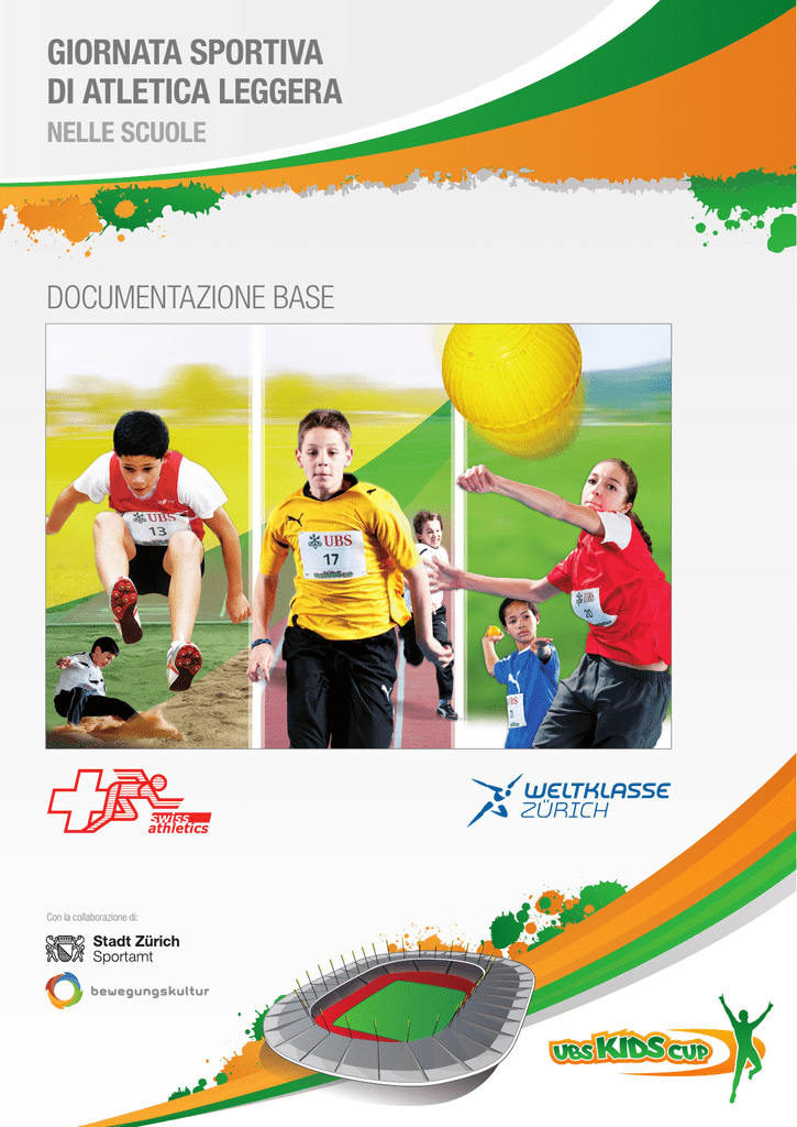 GIORNATA SPORTIVA DI ATLETICA LEGGERA NELLE SCUOLE DOCUMENTAZIONE BASE Con la collaborazione di: Indice dei contenuti 1 1.1 1.2 1.3 1.4 1.5 1.6 1.7 2 2.1 2.2 2.3 2.4 2.5 2.6 2.7 Concetto Correre, saltare, lanciare Presupposti per una giornata sportiva di atletica leggera Moduli per la giornata sportiva di atletica leggera Varianti di svolgimento Documentazione dettagliata Richieste e punti di forza delle varie varianti di svolgimento Idoneità delle varie varianti a seconda dell’anno scolastico UBS Kids Cup Il progetto per le nuove leve di UBS Kids Cup Requisiti per una UBS Kids Cup I vantaggi di organizzare una UBS Kids Cup Il sistema di qualificazione La finale svizzera nello stadio della Weltklasse di Zurigo Il sito internet Gadget e regali 3 3 3 4 4 5 6 6 7 7 7 7 8 8 8 9 www.ubs-kidscup.ch 2|9 1 Concetto 1.1 Correre, saltare, lanciare La giornata sportiva é un avvenimento importante e speciale dell’anno scolastico. Tutti gli allievi e le allieve (AeA) devono poter misurare le proprie capacità e allo stesso tempo vivere attivamente una valida attività sociale. Per molti è anche interessante e motivante comparare i propri risultati con quelli dell’anno precedente o poter competere direttamente con i propri compagni. Sono quindi ideali per questo le discipline base del correre, saltare e lanciare, archetipi di movimenti umani quindi che sono intuitivi per i bambini e possono essere esercitati come giocose competizioni. Infatti quasi tutti i bambini si confrontano spontaneamente con gare di corsa, salti delle pozzanghere o delle buche o cercando di lanciare le palline di neve il più lontano possibile Correre, saltare e lanciare non sono solo i movimenti base delle discipline dell’atletica leggera, ma sono anche i movimenti basilari di innumerevoli altre attività sportive, come il calcio, la palla mano, la pallavolo, il basket, l’unihockey e il tennis, ecc. In questo concetto i tre movimenti base formano il nocciolo della giornata sportiva e sono stati ridotti nelle loro forme più semplici, cioè lo sprint di 60m, il salto in lungo con zona di stacco e il lancio della pallina di 200g. Inoltre c’è la possibilità di arricchire il programma della giornata sportiva con interessanti staffette a squadre o Activity Spaces a seconda degli obbiettivi della scuola, in modo da offrire a tutti i partecipanti un’esperienza su misura. Sia le staffette di squadra che gli Activity Spaces sono attrattive possibilità per riempire i momenti di pausa. Possono completare la giornata sportiva con momenti di divertimento, e offrire una intensa attività di gruppo. 1.2 Presupposti per una giornata sportiva di atletica leggera Questo concetto rispetta le seguenti basi: • • • • • • • • • • La giornata sportiva (senza tornei sportivi) dovrebbe essere svolta in mezza giornata (fino a 250 AeA). Le discipline dovrebbero essere svolte facilmente da tutti gli AeA (dalla prima elementare alla quinta, fino alle medie). La giornata sportiva deve essere in primo luogo un divertimento per gli AeA. I risultati vengono misurati e possono quindi risultare in classifiche dei gruppi ma anche dei singoli (si può anche rinunciare alle classifiche singole). La giornata sportiva può servire (a seconda del bisogno) come semplice base per l’assegnazione delle note. Tutti gli AeA fanno le stesse discipline, così che l’organizzazione é più facile e che possano perseguire un miglioramento annuale. AeA sportivi dovrebbero avere la possibilità di liberare le loro ambizioni – AeA deboli dovrebbero avere la possibilità di essere valorizzati nei gruppi, senza dovere esporre le loro prestazioni sportive scarse. Grazie ai moduli facoltativi le pause dovrebbero essere coperte con attività divertenti e utili dove si possano sviluppare elementi supplementari come la dinamica di gruppo, le competenze sociali e l’autonomia. Tramite i singoli moduli a libera scelta ogni scuola dovrebbe poter programmare la sua giornata sportiva a seconda delle sue preferenze e dei suoi bisogni. La giornata sportiva deve essere fattibile con le infrastrutture della scuola o di un impianto sportivo e con il materiale a disposizione. Tutto il materiale supplementare necessario può essere comandato e verrà messo a disposizione dall’organizzatore della UBS Kids Cup. www.ubs-kidscup.ch 3|9 1.3 Moduli per la giornata sportiva di atletica leggera Il concetto sottostante é diviso in moduli. La giornata sportiva deve essere costruita su misura a seconda degli obiettivi, del luogo e della infrastruttura, delle classi partecipanti così come dagli aiutanti a disposizione. Sommario dei moduli UBS Kids Cup = Modulo base 60m-Sprint Salto in lungo (zona di stacco) Lancio della pallina (200g) • • • 1.4 Modulo delle attività Modulo opzionale • Staffette a squadre • Staffetta corri e salta • Staffetta con ostacoli/rischi • Staffetta puzzle-biathlon • Activity Space • Giocoliere • Cordicelle • Acrobatica a squadre • Footbag • Ecc. • Giochi • Tornei • Giochi a squadre • Approvvigionamento Varianti di svolgimento Nel modulo sottostante si trovano le diverse possibilità per lo svolgimento di una giornata sportiva di atletica leggera. Queste possono venire abbinate con i moduli opzionali (ad es. tornei) che aumentano la durata della mezza giornata ad una intera. La base per tutte le varianti di svolgimento la formano le tre discipline dell’atletica leggera della UBS Kids Cup: Varianti nello svolgimento 1 a) UBS Kids Cup Nella documentazione dettagliata di UBS Kids Cup 1 b) UBS Kids Cup durante una lezione Nella documentazione di “concetto dettagliato” di UBS Kids Cup (nel capitolo 8) 2 UBS Kids Cup con staffette a squadra Nella documentazione dettagliata di UBS Kids Cup con le staffette a squadre 3 UBS Kids Cup con Activity Space Nella documentazione dettagliata di UBS Kids Cup con Activity Space Per svolgere la giornata sportiva di atletica leggera, a seconda delle possibilità di una 