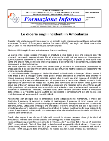 PUBBLICA ASSISTENZA FRATELLANZA POPOLARE “VALLE DEL MUGNONE” CALDINE Piazza dei Mezzadri 7, 50010 Caldine – Fiesole (FI) Formazione Informa Data emissione 23/07/2013 #11 Foglio informativo della AVS Fratellanza Popolare Valle del Mugnone Associazione di Volontariato ONLUS Tel. 055-549166 Periodico Aut. Tribunale di Firenze n° 4624 del 25.09.96 Dist. Gratuita 1/08 Le dicerie sugli incidenti in Ambulanza Questa volta vogliamo condividere con voi un articolo molto interessante pubblicato sulla rivista americana "Journal of Emergency Medical Services (JEMS)", nel luglio del 1989, vale a dire ben 24 anni fa, ma tuttora molto attuale per tanti aspetti. Sfatiamo i Miti degli infortuni in Ambulanza [traduzione libera] La parola mito evoca spesso immagini di creature a due teste e dee che giocano con vite umane in un mondo soprannaturale. Ma ci sono anche molti miti nel soccorso d'emergenza, questi possono assumere la forma di voci o solo idee sbagliate, e anche se non esiste una verità che provi il mito, sembrano ottenere passaggi di generazione in generazione, accettandoli senza porsi le giuste domande. Nel caso specifico dei preconcetti che circondano gli incidenti in ambulanza, permettere la propagazione di questi falsi miti in ultima analisi può influire la nostra capacità di soccorrere vite umane in modo adeguato. La cosa divertente del distruggere i falsi miti è che di solito richiede solo un po' di buon senso, il fatto triste è che la maggior parte della gente presta attenzione ai problemi solo quando vi hanno interesse personale. Ad esempio, sapere che ci sono un gran numero di incidenti di ambulanza ogni anno probabilmente non vi impressiona a meno che abbiate avuto la triste esperienza di osservare un mezzo da 130mila euro rovesciato su un fianco. Tutto quello che serve per entrare in sintonia con il problema, è qualcuno che raccolga dati e che informi gli altri della grandezza del problema, senza sensibilizzarsi solo dopo aver sperimentato il trauma di un incidente in ambulanza. Piuttosto, rendersi conto delle variabili coinvolte, come le condizioni della strada e la visibilità: questo aiuterà ad identificare i comportamenti ad alto rischio che contribuiscono all' instaurarsi di questi incidenti. Assumendo per principio che le ambulanze siano adeguatamente mantenute, il modo per diminuire il numero di incidenti è quello di minimizzare il numero di errori umani che si verificano. Questo obiettivo può essere raggiunto modificando il comportamento del conducente dell'ambulanza, utilizzando strategie che includono il fornire istruzione sia per l' operatore di ambulanza che per il pubblico, sottolineando i fattori di rischio; modificando le leggi esistenti, le norme, i regolamenti, sviluppando procedure operative standard ed aumentando la visibilità e l' udibilità delle ambulanze. Quello che segue è un elenco di falsi miti creduti da alcune persone circa gli incidenti di ambulanza, ed una serie di dati specifici che correggono le idee sbagliate. I dati analizzati rappresentano un periodo di 48 mesi, dal 1 gennaio 1984, fino al 31 dicembre 1987, osservati nello Stato di New York. In tale lasso di tempo gli incidenti ai mezzi di soccorso (ambulanze) sono aumentati del 28,6 per cento, con 1.412 incidenti, causando sei morti e ferendo 1.894 occupanti delle ambulanze. [la massa dei dati è stata omessa per semplicità] Mito # 1: Gli incidenti in ambulanza si verificano in caso di maltempo, con scarsa visibilità Fatto # 1: La maggior parte degli incidenti si verificano ambulanza nelle giornate limpide, con una buona visibilità I dati mostrano che solo una piccola percentuale di incidenti si verifica in caso di maltempo. Ciò può essere attribuibile, in parte, allo sforzo che gli autisti fanno in più per ridurre la loro velocità e adeguare le proprie abitudini di guida durante il cattivo tempo. Mito # 2: La maggior parte degli incidenti alle ambulanze si verifica sulle strade buie o al crepuscolo, quando il conducente ha difficoltà a vedere gli altri veicoli. Fatto # 2: La maggior parte degli incidenti alle ambulanze si verifica alla luce del giorno. Sorprendentemente, il 92 per cento di questi incidenti si è verificato alla luce del giorno o di notte su una strada ben illuminata. Il numero di incidenti rimane basso in condizioni di scarsa visibilità. Mito # 3: La maggior parte degli incidenti ambulanza si verificano quando si cerca di passare un veicolo che rifiuta di cedere strada. Fatto # 3: La maggior parte degli incidenti si verifica quando l' ambulanza fa inversione o quando approccia ad un incrocio. Anche se il conducente di un veicolo con i finestrini chiusi e la radio accesa di solito non può sentire l' ambulanza che si avvicina fino a quando non è direttamente dietro la macchina, la più alta percentuale di incidenti si verifica agli incroci, non in fase di sorpasso di altri veicoli. Inoltre, la percentuale di scontri frontali è in realtà molto piccola, che smentisce il mito che sorpassare a sinistra e l'ingresso nel traffico siano i pericoli maggiori nella guida di un' ambulanza. Mito # 4: La maggior parte degli incidenti alle ambulanze si verificano su strade bagnate o innevate. Fatto # 4: La maggior parte degli incidenti alle ambulanze si verificano su strade asciutte. Anche quando i conducenti di ambulanze usano extra cautela su strade bagnate, un numero significativo di incidenti di ambulanza si verificano. Ma anche la ridotta aderenza stradale è difficile da rilevare su strade asciutte. Come risultato, è imperativo guidare con prudenza per compensare un eventuale errore che si potrebbe avere nel giudicare la tenuta di strada. In generale si raccomanda che i conducenti riducano la velocità normale di un quarto per la pioggia, di una metà per la neve e fino a tre quarti per le superfici ghiacciate [a puro titolo esemplificativo, un approccio su codice rosso affrontato su strada extraurbana asciutta come la Faentina a 90 Kmh, scenderebbe a 66 Kmh c