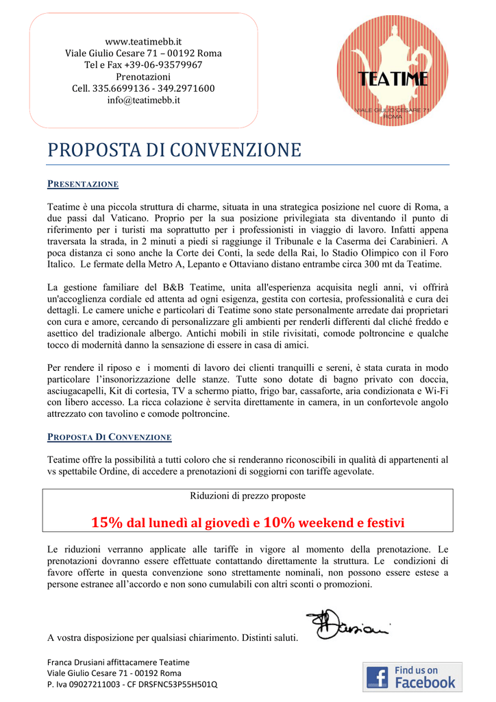www.teatimebb.it VialeGiulioCesare71–00192Roma TeleFax+39‐06‐93579967 Prenotazioni Cell.335.6699136‐349.2971600 [email protected] PROPOSTADICONVENZIONE PRESENTAZIONE Teatime è una piccola struttura di charme, situata in una strategica posizione nel cuore di Roma, a due passi dal Vaticano. Proprio per la sua posizione privilegiata sta diventando il punto di riferimento per i turisti ma soprattutto per i professionisti in viaggio di lavoro. Infatti appena traversata la strada, in 2 minuti a piedi si raggiunge il Tribunale e la Caserma dei Carabinieri. A poca distanza ci sono anche la Corte dei Conti, la sede della Rai, lo Stadio Olimpico con il Foro Italico. Le fermate della Metro A, Lepanto e Ottaviano distano entrambe circa 300 mt da Teatime. La gestione familiare del B&B Teatime, unita all'esperienza acquisita negli anni, vi offrirà un'accoglienza cordiale ed attenta ad ogni esigenza, gestita con cortesia, professionalità e cura dei dettagli. Le camere uniche e particolari di Teatime sono state personalmente arredate dai proprietari con cura e amore, cercando di personalizzare gli ambienti per renderli differenti dal cliché freddo e asettico del tradizionale albergo. Antichi mobili in stile rivisitati, comode poltroncine e qualche tocco di modernità danno la sensazione di essere in casa di amici. Per rendere il riposo e i momenti di lavoro dei clienti tranquilli e sereni, è stata curata in modo particolare l’insonorizzazione delle stanze. Tutte sono dotate di bagno privato con doccia, asciugacapelli, Kit di cortesia, TV a schermo piatto, frigo bar, cassaforte, aria condizionata e Wi-Fi con libero accesso. La ricca colazione è servita direttamente in camera, in un confortevole angolo attrezzato con tavolino e comode poltroncine. PROPOSTA DI CONVENZIONE Teatime offre la possibilità a tutti coloro che si renderanno riconoscibili in qualità di appartenenti al vs spettabile Ordine, di accedere a prenotazioni di soggiorni con tariffe agevolate. Riduzioni di prezzo proposte 15%dallunedìalgiovedìe10%weekendefestivi Le riduzioni verranno applicate alle tariffe in vigore al momento della prenotazione. Le prenotazioni dovranno essere effettuate contattando direttamente la struttura. Le condizioni di favore offerte in questa convenzione sono strettamente nominali, non possono essere estese a persone estranee all’accordo e non sono cumulabili con altri sconti o promozioni. A vostra disposizione per qualsiasi chiarimento. Distinti saluti. Franca Drusiani affittacamere Teatime Viale Giulio Cesare 71 ‐ 00192 Roma P. Iva 09027211003 ‐ CF DRSFNC53P55H501Q