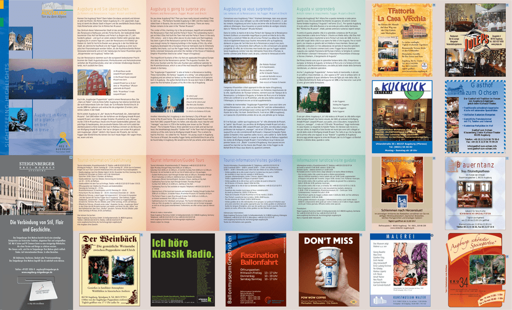 34 AUGSBURG SIGHTSEEING-HIGHLIGHTS Tor zu den Alpen Augsburg wird Sie überraschen Augsburg is going to surprise you Augsbourg va vous surprendre Augusta vi sorprenderà Zu Römern und Renaissance, Fugger, Mozart und Brecht Romans and Renaissance, Fugger, Mozart and Brecht. Les romains et la Renaissance, les Fugger, Mozart et Brecht Antichi romani e rinascimento, Fugger, Mozart e Brecht Kennen Sie Augsburg? Nein? Dann haben Sie etwas versäumt und können es jetzt nachholen. Die Römer haben Augsburg 15 v. Chr. gegründet. Augsburg ist damit die älteste Stadt in Bayern und die zweitälteste Deutschlands. Viele Römerfunde sehen Sie im Römischen Museum. Do you know Augsburg? No? Then you have really missed something! Time to catch up… The Romans founded Augsburg in 15BC and this makes it the oldest town in Bavaria, the second oldest in Germany. There are many Roman remains to be seen in the “Roman Museum.” Das Zentrum dieser liebenswerten Stadt ist das prachtvolle Ensemble des Renaissance-Rathauses und des Perlachturms. Der bedeutende Stadtbaumeister Elias Holl hat Rathaus und Perlach zu Beginn des 17. Jahrhunderts gebaut – und auch an vielen anderen Stellen dafür gesorgt, dass Augsburg bis in unsere Tage ein Juwel der Renaissance-Architektur geblieben ist. Geld für herrliche Bauten war genug da in der Hochblüte der Stadt, als steinreiche Kaufleute wie die Fugger Augsburg zu einer europäischen Finanzmetropole werden ließen, als die Kaufmannsfamilie Welser Venezuela kolonisierte und sich der habsburgische Kaiser Maximilian gerne „Bürgermeister von Augsburg“ heißen ließ. The center of this charming city is the picturesque, magnificent ensemble of the Renaissance Town Hall and the Perlach Tower. The outstanding municipal architect Elias Holl built the Town Hall and the Perlach Tower in the early 17th century – and in many other places he also made sure that Augsburg has been a gem of the Renaissance period to this very day. There always was enough money for imposing buildings in the heyday of this city, when Augsburg developed into a European financial metropolis due to immensely wealthy merchants, such as the Fugger family, when the Welser merchant family colonized Venezuela and when the member of the House of Habsburg Emperor Maximilian liked to be called “mayor of Augsburg”. Connaissez-vous Augsbourg ? Non ? Vraiment dommage, mais vous pouvez maintenant un peu vous rattraper. La cité a été fondée en 15 avant J.-C. par les romains. Augsbourg est ainsi la plus ancienne ville de Bavière et la deuxième en Allemagne. Vous trouverez un grand nombre de vestiges romains dans le “Römische Museum“ (Musée Romain) Conoscete Augsburg? No? Allora fino a questo momento vi siete perso qualche cosa che ora potrete facilmente recuperare. Gli antichi romani hanno fondato Augsburg (“Augusta”) nell'anno 15 a.C.. Per questo Augsburg è la più antica città della Baviera e la seconda più antica della Germania. Nel “Römisches Museum”, infatti, potrete ammirare numerosi reperti romani. Dans le centre, la mairie et de la tour Perlach de l’époque de la Renaissance forment d’ailleurs un ensemble magnifique.Le grand architecte de la ville, Elias Holl, a construit l’Hôtel de ville et la tour Perlach au début du 17ème siècle et également beaucoup d’autres monuments afin qu’Augsbourg demeure un joyau de l’architecture de la Renaissance jusqu’à nos jours. L’argent pour ces monuments était suffisant, la ville connaissant une grande prospérité. En effet, de richissimes marchands tels que les Fugger avaient laissé Augsbourg comme l’une des métropoles financières d’Europe, la famille commercante Welser avait, de plus, colonisé le Venezuala et enfin Aus der Renaissance stammen auch die europaweit bedeutsamen Prachtbrunnen der Stadt. Augustusbrunnen, Merkurbrunnen und Herkulesbrunnen verleihen der Maximilianstraße, einer der schönsten Straßenzüge Deutschlands, noch zusätzlichen Glanz. The magnificent fountains of the city that are applauded throughout Europe also date back to the Renaissance period. The Augustus fountain, the Mercurius fountain and the Hercules fountain give additional splendor to the Maximilianstrasse, which is one of the most beautiful and magnificent streets in Germany. Il centro di questa amabile città è lo splendido complesso del Municipio rinascimentale e della torre Perlach. L’illustre architetto della città Elias Holl costrui’il Municipio e trasformò la torre Perlach all inizio del 1600. Anche in tanti altri luoghi della città la sua opera ha fatto si’che Augusta, fino ai nostri giorni, sia rimasta un gioiello dell architettura rinascimentale. Denaro per splendide costruzioni ce n’era abbastanza nel periodo di massimo splendore della città. J ricchissimi commercianti come i Fugger fecero diventare Augusta una capitale finanziaria dell’Europe d’allora; la famiglia di commercianti Welser colonizzo’il Venezuela e l’imperatore Massimiliano d’Asburgo si faceva chiamare „il borgomastro di Augusta“. Im Mozarthaus wurde Leopold Mozart geboren. In the Mozart House Leopold Mozart was born. Leopold Mozart au vu le jour dans la “Mozarthaus“ (Maison paternelle de Mozart) Nella “Mozarthaus” è nato Leopold Mozart. St. Ulrich und der Herkulesbrunnen. Auch die „Augsburger Puppenkiste“ spielt in einem Renaissance-Bau. Die „Stars an Fäden“ sind als Botschafter Augsburgs fast ebenso berühmt wie der wohl bekannteste Sohn der Stadt, der Schriftsteller Bertolt Brecht. Er wurde 1898 hier geboren und verbrachte die prägenden 22 ersten Jahre seines Lebens in der Stadt. Church of St. Ulrich and the Hercules fountain. St. Ulrich et la fontaine d’Hercule. S. Ulrich e la fontana di Ercole. Nicht zuletzt: Augsburg ist „die“ deutsche Mozartstadt, die „Vaterstadt der Mozarts“. Seit 1643 lebten hier die Vorfahren von Wolfgang Amadé Mozart. Leopold Mozart, sein Vater, einziger Erzieher, Mus