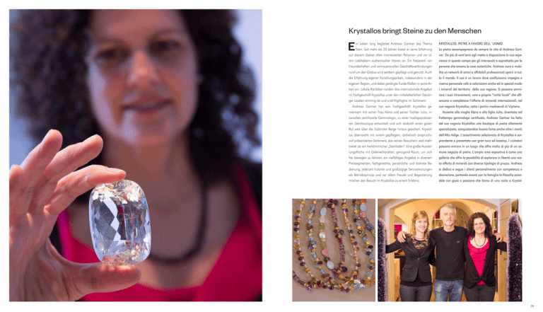 Krystallos bringt Steine zu den Menschen E in Leben lang begleitet Andreas Gartner das Thema KRYSTALLOS: PIETRE A FAVORE DELL´UOMO Stein. Seit mehr als 20 Jahren bietet er seine Erfahrung Le pietre accompagnano da sempre la vita di Andreas Gart- auf diesem Gebiet allen interessierten Personen und vor al- ner. Da più di vent‘anni egli mette a disposizione la sua espe- lem Liebhabern authentischer Waren an. Ein Netzwerk von rienza in questo campo per gli interessati e soprattutto per le Freundschaften und vertrauensvollen Geschäftsverbindungen persone che amano le cose autentiche. Andreas cura e mobi- rund um den Globus wird seitdem gepflegt und genutzt. Auch lita un network di amici e affidabili professionisti sparsi in tut- die Erfahrung eigener Forschungsarbeit, insbesondere in der to il mondo. Il suo è un lavoro dove confluiscono impegno e eigenen Region, und dabei getätigte Funde fließen in seine Ar- ricerca personale volti a valorizzare anche ed in special modo beit ein. Lokale Raritäten runden das internationale Angebot i minerali del territorio della sua regione. Si possono ammi- im Fachgeschäft Krystallos unter den mittelalterlichen Sterzin- rare i suoi ritrovamenti, vere e proprie “rarità locali” che affi- ger Lauben stimmig ab und sind Highlights im Sortiment. ancano e completano l‘offerta di minerali internazionali, nel Andreas Gartner hat sein Fachgeschäft Krystallos ge- suo negozio Krystallos, sotto i portici medioevali di Vipiteno. meinsam mit seiner Frau Klara und seiner Tochter Julia, in- Assieme alla moglie Klara e alla figlia Julia, diventata nel zwischen zertifizierte Gemmologin, zu einer hochspezialisier- frattempo gemmologa certificata, Andreas Gartner ha fatto ten Steinboutique entwickelt und sich dadurch einen guten del suo negozio Krystallos una boutique di pietre altamente Ruf weit über die Südtiroler Berge hinaus gesichert. Krystal- specializzata, conquistandosi buona fama anche oltre i monti los überrascht mit einem gepflegten, ästhetisch anspruchs- dell‘Alto Adige. L‘assortimento selezionato di Krystallos è sor- voll präsentierten Sortiment, das seinen Besuchern weit mehr prendente e presentato con gran cura ed estetica. I visitatori bietet als ein herkömmlicher „Steinladen“: Eine große Ausstel- possono entrare in un luogo che offre molto di più di un co- lungsfläche mit Galeriecharakter, genügend Raum, um sich mune negozio di pietre. L‘ampia area espositiva è come una frei bewegen zu können, ein vielfältiges Angebot in diversen galleria che offre la possibilità di esplorare in libertà una vas- Preissegmenten, fachgerechte, persönliche und diskrete Be- ta offerta di minerali con diverse tipologie di prezzo. Andreas dienung, jederzeit kulante und großzügige Serviceleistungen si dedica e segue i clienti personalmente con competenza e als Betriebsprinzip und vor allem Freude und Begeisterung discrezione, portando avanti con la famiglia la filosofia azien- machen den Besuch im Krystallos zu einem Erlebnis. dale con gioia e passione che fanno di una visita a Krystal- 39 Krystallos Neustadt / Città Nuova 37 I-39049 Sterzing / Vipiteno Tel. 00 39 04 72 / 76 58 19 [email protected] www.krystallos.it 40 Angeboten wird eine große Vielfalt auch seltener und los un‘esperienza da non perdere. La proposta comprende un seltenster Steine, viele davon wunderschön als Schmuck ver- gran numero di pietre rare e rarissime, molte delle quali lavo- arbeitet, andere noch in ihrer natürlichen Form belassen und rate come gioielli, altre conservate nella loro forma naturale manche zu ansprechenden Objekten verarbeitet. Raritä- e altre ancora trasformate in piacevoli sculture. Le rarità e le ten und besondere Kostbarkeiten können aus verlässlichen unicità particolari vengono procurate tramite fonti affidate e Quellen beschafft und aus erfahrener Hand nach Wunsch lavorate su commissione da mani esperte. I visitatori possono angefertigt werden. Außerdem erwartet die Besucherinnen trovare inoltre preziose lavorazioni artigianali e i collezionisti und Besucher ausgewähltes und seltenes Kunsthandwerk für minerali particolari e di rara reperibilità . La filosofia che ani- Liebhaber und Sammler sowie wunderschöne Licht-Arrange- ma Krystallos riecheggia nel motto che la famiglia Gartner si ments. Die Kernaussage der Krystallos-Arbeitsphilosophie fin- era posta all‘inizio dell‘attività e che da allora l‘accompagna det sich im Leitspruch, den sich die Familie Gartner am An- nel lavoro e nella vita privata: “Amiamo la natura, cerchia- fang ihrer Tätigkeit gesetzt hat und der sie seither im privaten mo l‘autentico e apprezziamo le pietre preziose. Affascinati Leben wie bei der Arbeit begleitet: „Wir lieben Natur pur, dall‘esclusività, appassionati dei pezzi unici, sentiamo il fas- suchen das Authentische und schätzen edle Steine. Uns cino per il magico, amiamo scoprire i misteri, avere la mente fasziniert das Exklusive. Uns begeistern Einzelstücke. Wir aperta e scoprire continuamente nuovi orizzonti.” haben Sinn für das Mysteriöse, erforschen gerne Geheimnisse, erfreuen uns an befreiender Weite und entdecken ständig neue Horizonte.“