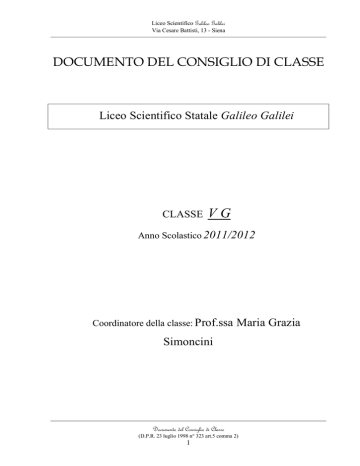 Liceo Scientifico Galileo Galilei Via Cesare Battisti, 13 - Siena DOCUMENTO DEL CONSIGLIO DI CLASSE Liceo Scientifico Statale Galileo Galilei CLASSE VG Anno Scolastico 2011/2012 Coordinatore della classe: Prof.ssa Maria Grazia Simoncini Documento del Consiglio di Classe (D.P.R. 23 luglio 1998 n° 323 art.5 comma 2) 1 Liceo Scientifico Galileo Galilei Via Cesare Battisti, 13 - Siena 1. PRESENTAZIONE SINTETICA: a) b) c) Storia del triennio della classe Composizione del Consiglio di classe e continuità didattica nel triennio Situazione di partenza della classe nell’anno scolastico in corso a) Storia del triennio della classe Nell’a.s.. 2009/2010 la classe III G era composta da 24 alunni, 11 ragazzi e 13 ragazze e fin da questo primo anno si è evidenziato un gruppo di alunni ben motivati e impegnati nello studio; nel passaggio dalla terza alla quarta quattro alunni sono stati respinti, ma se ne è aggiunto un altro proveniente da un’altra sezione, per cui il numero è divenuto di 21 alunni di cui 3 si sono ritirati durante l’anno. Nel corrente anno scolastico la classe inizialmente era composta da 19 alunni, ma nel primo quadrimestre 2 alunni calciatori provenienti da altre scuole si sono ritirati ed un’altra alunna proveniente da Roma è ritornata nella sua ex scuola , per cui del nucleo originario della III G sono rimasti 16 alunni, di cui 8 ragazze e 8 ragazzi In ordine alla continuità didattica la classe ha cambiato gli insegnanti di fisica e di inglese dalla terza alla quarta e insegnante di disegno e storia dell’arte dalla quarta alla quinta La disponibilità dei docenti e degli alunni ha consentito un soddisfacente recupero delle competenze per la maggior parte degli alunni. b) Composizione del Consiglio di Classe e continuità didattica nel triennio DISCIPLINE CONTINUITA’ NEL TRIENNIO MATEMATICA E FISICA SI a matematica e fisica dalla quarta Simoncini Maria Grazia STORIA E FILOSOFIA SI Selis Patrizia ITALIANO – LATINO SI Failli Laura INGLESE SI dalla quarta ED. FISICA SI Saluzzi Rosa IRC SI Poli Giancarlo Satta Stefania DISEGNO E STORIA DELL’ARTE Solo dalla classe V SCIENZE SI DOCENTI Pacini Paola Santoro Carmela c) Situazione di partenza della classe nell’anno scolastico in corso La classe all’inizio dell’anno corrente risultava nel complesso affiatata, interessata e disponibile ad essere guidata nel raggiungimento degli obiettivi programmati, dimostrando discrete attitudini ed altrettante potenzialità che hanno consentito a tutti i docenti di operare in un clima costruttivo che ha permesso loro di svolgere i programmi curricolari con regolarità. Grazie all’impegno ed allo studio continuo, un buon numero di ragazzi è riuscito a sviluppare un discreto metodo di lavoro. Quasi tutti gli alunni hanno consolidato uno studio più autonomo ed in diversi casi anche critico, facendo emergere un quadro complessivamente sul discreto, più che buono per chi si è impegnato con assiduità. 2. OBIETTIVI GENERALI (educativi e formativi) Capacità trasversali: relazionali, comportamentali e cognitive. In relazione al quadro sopra delineato, la classe si è distinta per l’apprezzabile correttezza di rapporti tra alunni e tra alunni ed insegnanti. Ciò ha permesso l’acquisizione di un buon interscambio relazionale con Documento del Consiglio di Classe (D.P.R. 23 luglio 1998 n° 323 art.5 comma 2) 2 Liceo Scientifico Galileo Galilei Via Cesare Battisti, 13 - Siena crescita sul piano comportamentale e con ricco reciproco aiuto sul piano cognitivo. Non sempre tutti gli alunni, però, hanno saputo sfruttare al meglio le proprie capacità intellettive. Sulla base degli interventi effettuati, la classe, nel suo complesso, ha quindi sviluppato: un buon livello di maturazione e di crescita culturale, in maniera motivate consapevole, con un sistema di conoscenze di buon livello; una buona capacità di operare attivamente e in maniera serena all’interno della classe, nel pieno rispetto delle singole individualità; interessi ampi e particolari; un più elevato grado di socializzazione e partecipazione, una buona conoscenza di sé, intesa come riflessione sulle proprie competenze e aspirazioni, in modo da poter effettuare scelte consapevoli. 3. CONOSCENZE, COMPETENZE E CAPACITA’ Possiamo dire che la classe globalmente presenti una base culturale ampia ed organica, in cui le conoscenze conseguite nelle varie discipline risultano discrete ed in alcuni casi più che buone. Relativamente alle competenze nell’ambito dei linguaggi verbali e non, il livello può essere considerato discreto, anche se in alcuni resta soltanto sufficiente. La classe, nel suo insieme, ha comunque mostrato apprezzabili capacità di analisi/sintesi, con relativa coerenza argomentativa ed espositiva; un gruppo, poi, ha saputo esprimere anche capacità di rielaborazione autonoma dei contenuti proposti e di approfondimento critico. Solo in pochi casi permangono alcune incertezze, legate a specifici ambiti disciplinari. Per indicazioni più dettagliate si rimanda, quindi, alle Relazioni dei singoli docenti (All. B). 4. ATTIVITA’ EXTRA, PARA, INTER CURRICOLARI (Viaggi di istruzione, visite guidate, scambi, stages, tirocini, mostre, conferenze, teatro, cinema, attività sportive, ecc. a cui la classe ha partecipato nel corso del triennio). Di seguito si riporta l’elenco delle attività più significative del corrente anno scolastico Visita alla Biennale d’Arte 2011 a Venezia Conferenza Diagramma H-R: Scienza al femminile nell’ambito del Progetto Pianeta Galileo Conferenza di Gherardo Colombo sul suo libro Farla franca Rappresentazione teatrale Uno, nessuno, centomila al Teatro Dei Rinnovati Rappresentazione teatrale Endgame di Samuel Beckett Incontro al Centro Siena-Toronto con la scrittrice Mary Lawson Otto alunni hanno sostenuto la Certificazione PET e tre alunni anche quella del FCE Otto alunni hanno sostenuto esami dell’ECDL Partecipazione a Tornei sportivi di calcio e pallavolo 5. CRITERI E