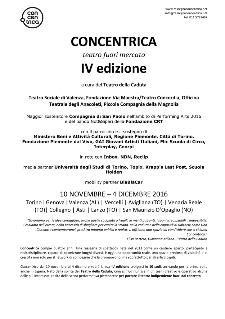www.rassegnaconcentrica.net [email protected] tel. 011 5781467 CONCENTRICA teatro fuori mercato IV edizione a cura del Teatro della Caduta Teatro Sociale di Valenza, Fondazione Via Maestra/Teatro Concordia, Officina Teatrale degli Anacoleti, Piccola Compagnia della Magnolia Maggior sostenitore Compagnia di San Paolo nell’ambito di Performing Arts 2016 e del bando Not&Sipari della Fondazione CRT con il patrocinio e il sostegno di Ministero Beni e Attività Culturali, Regione Piemonte, Città di Torino, Fondazione Piemonte dal Vivo, GAI Giovani Artisti Italiani, Flic Scuola di Circo, Interplay, Coorpi in rete con Inbox, NDN, Reclip media partner Università degli Studi di Torino, Topix, Krapp's Last Post, Scuola Holden mobility partner BlaBlaCar 10 NOVEMBRE – 4 DICEMBRE 2016 Torino| Genova| Valenza (AL) | Vercelli | Avigliana (TO) | Venaria Reale (TO)| Collegno | Asti | Lanzo (TO) | San Maurizio D’Opaglio (NO) “Lavoriamo per le idee coraggiose, anche quelle sbagliate o fragili, le menti pulsanti, i sogni irrealizzabili, l'impossibile. Crediamo nell'errore, nella necessità di sbagliare per capire la strada, nella caduta e nella capacità di rialzarsi; come Don Chisciotte contemporanei, presi tra materia onirica e realtà, vi offriamo uno spazio da condividere che si chiama Concentrica.” Elisa Bottero, Giovanna Milano - Teatro della Caduta Concentrica compie quattro anni. Una rassegna di spettacoli nata nel 2013 come un cantiere aperto, partecipato e multidisciplinare, capace di colonizzare luoghi diversi, è oggi una opportunità reale, uno spazio prezioso di visibilità e di crescita non solo per il network di compagnie che la promuovono, ma soprattutto per gli artisti ospiti. Concentrica dal 10 novembre al 4 dicembre vedrà la sua IV edizione svolgersi in 10 sedi, arrivando per la prima volta anche in Liguria. Nato dalla spinta del Teatro della Caduta, Concentrica riunisce in un team creativo e operativo alcune delle più interessati realtà della scena performativa piemontese per portare il teatro indipendente fuori dal contesto www.rassegnaconcentrica.net [email protected] tel. 011 5781467 strettamente cittadino e consolidare un nuovo modo di fare circuito per lo spettacolo dal vivo, che permetta alle compagnie di avere più date consecutive in una tournée regionale che offra visibilità ad autori e artisti il cui lavoro è poco conosciuto e offrire ad un pubblico allargato un cartellone artistico stimolante e non omologato. In questa edizione collaborano con il Teatro della Caduta quattro solide realtà piemontesi: la Fondazione Via Maestra/Teatro della Concordia (Venaria), il Teatro Sociale di Valenza (AL), l’Officina Teatrale degli Anacoleti (Vercelli) e, nuovo ingresso nel network, la Piccola Compagnia della Magnolia. Si consolida in questa edizione la collaborazione con Fondazione Piemonte dal Vivo/Lavanderia a Vapore (Collegno), con Flic Scuola di Circo di Torino, Interplay Festival e Coorpi. Ognuna delle realtà che costituiscono il tessuto connettivo di Concentrica si distingue per le capacità organizzative, per la caparbietà nel mantenere vivo uno spazio fisico di spettacolo e di dialogo con il territorio, gli enti pubblici e le imprese. Si uniscono al modello distributivo di Concentrica, offrendosi come spazi ospitanti degli spettacoli in programma, rafforzando in tal modo la visibilità degli spettacoli selezionati dal network Concentrica: Cubo Teatro (Torino); Compagnia Teatrale Compagni di Viaggio (Lanzo, TO); Teatro Giraudi (Asti); Teatro degli Scalpellini (San Maurizio d'Opaglio - NO), Teatro Akropolis (Genova), Teatro Altrove (Genova). Concentrica, accogliendo le ultime istanze della creatività contemporanea e attraverso il consolidato meccanismo della direzione artistica condivisa fra le realtà che la organizzano, conferma anche per quest’anno un cartellone improntato al multidisciplinare e inserisce in cartellone non solo prosa e nuova drammaturgia, ma anche danza e circo contemporaneo. Anche in questa edizione gli spettacoli scelti, nella maggioranza dei casi, non hanno avuto una presentazione ufficiale sul territorio piemontese in festival o rassegne maggiori, ma propongono nuove drammaturgie, contaminazioni e linguaggi teatrali innovativi. Concentrica apre la quarta edizione con l’atteso debutto regionale – al Cubo Teatro di Torino il 10, al Teatro Akropolis di Genova l’11 e al Sociale di Valenza il 12 novembre - di Ci scusiamo per il disagio, lo spettacolo della giovane compagnia under35 GLI OMINI – vincitori nel 2015 del premio Rete e Critica come miglior compagnia dell’anno -. Il programma prosegue con L’ultima notte di Antonio della compagnia modenese PICCOLA COMPAGNIA DAMMACCO – il 18 a Vercelli, il 19 ad Avigliana (TO) il 20 novembre a Genova. Nell’ambito del progetto Citè della Scuola di Circo Flic Concentrica propone poi al Teatro Concordia di Venaria il 20 novembre due studi per nuovi spettacoli fra teatro, danza, musica e tecniche circensi: 20 minuetti di FABBRICA C e Ah com’è bello l’uomo di COMPAGNIE ZENHIR, presentato poi in forma completa il 27 novembre al Teatro Giraudi di Asti. Spazio anche alla danza con il doppio spettacolo del 24 novembre alla Lavanderia a Vapore in collaborazione con la Fondazione Piemonte dal Vivo: Frane di ELEONORA CHIOCCHINI e il Premio Prospettiva Danza del 2015 Map di IRENE RUSSOLILLO e Davide Calvaresi e con Tristissimo di C&C (ad Asti il 26 novembre) presentato in short form nel festival torinese Interplay lo scorso maggio. La nuova produzione del TEATRO DEI GORDI, giovane compagnia formata da neodiplomati alla Scuola d’Arte Drammatica Paolo Grassi di Milano sarà presente a Lanzo (TO) il 1, a San Maurizio D’Opaglio (NO) il 2 e al Vittoria di Torino il 3 dicembre. Ideato e diretto dal regista veronese Riccardo Pippa, Sulla morte, senza esagerare, affronta il tema della morte in chiave ironica e divertente attraverso un linguaggio non convenzionale del corpo, ancorato al Teatro 