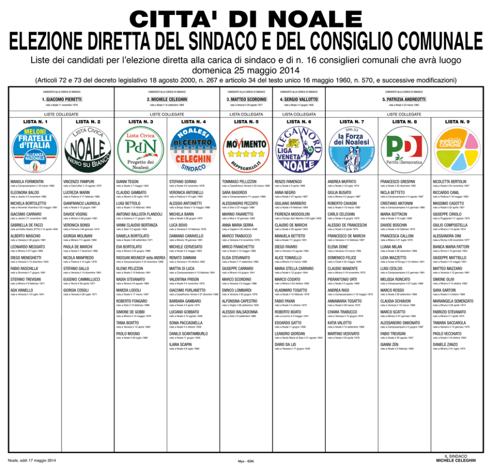 CITTA' DI NOALE ELEZIONE DIRETTA DEL SINDACO E DEL CONSIGLIO COMUNALE Liste dei candidati per l’elezione diretta alla carica di sindaco e di n. 16 consiglieri comunali che avrà luogo domenica 25 maggio 2014 (Articoli 72 e 73 del decreto legislativo 18 agosto 2000, n. 267 e articolo 34 del testo unico 16 maggio 1960, n. 570, e successive modificazioni) CANDIDATO ALLA CARICA DI SINDACO CANDIDATO ALLA CARICA DI SINDACO CANDIDATO ALLA CARICA DI SINDACO CANDIDATO ALLA CARICA DI SINDACO CANDIDATO ALLA CARICA DI SINDACO 1. GIACOMO PIERETTI 2. MICHELE CELEGHIN 3. MATTEO SCORDINO 4. SERGIO VALLOTTO 5. PATRIZIA ANDREOTTI nato a Noale l'1 novembre 1978 nato a Noale il 16 settembre 1969 nato a Venezia il 29 agosto 1977 nato a Noale il 4 giugno 1956 nata a Noale il 23 marzo 1962 LISTE COLLEGATE LISTE COLLEGATE LISTA COLLEGATA LISTA COLLEGATA LISTE COLLEGATE LISTA N. 5 LISTA N. 6 LISTA N. 1 LISTA N. 2 LISTA N. 3 LISTA N. 4 LISTA N. 7 LISTA N. 8 LISTA N. 9 MANOLA FORMENTIN VINCENZO PAMPURI GIANNI TEGON STEFANO SORINO TOMMASO PELLIZZON RENZO FAMENGO ANDREA MUFFATO FRANCESCO GRESPAN NICOLETTA BERTOLIN ELEONORA BALDO LUCREZIA MARIN CLAUDIO GAMBATO VERONICA ANTONELLI SARA BAGORDO ANNA NEGRO GIULIA BUSATO NICLA BETTETO RICCARDO CANIL MICHELA BORTOLETTO GIANFRANCO LAURIOLA LUIGI BETTIOLO ALESSIO ANTONIETTI ALESSANDRO PEZZATO GIULIANO BARBIERO nato a Noale il 9 febbraio 1964 ROBERTO CAVASIN nato a Noale il 15 marzo 1980 CRISTIANO ANTONINI MASSIMO CASOTTO GIACOMO CARRARO DAVIDE VOGRIG ANTONIO BALLISTA FLANDOLI MICHELA BARIN MARINO FAVARETTO FIORENZA MODDOLON nata a Campo San Martino il 25 luglio 1959 CARLO CELEGHIN nato a Noale il 6 giugno 1972 MARIA BOTTACIN GIUSEPPE CIRIOLO GABRIELLA DE FACCI VERONICA BONSI VANNI CLAUDIO BERTANZA LUCA BOVO ANNA MARIA SERRA CLAUDIO DE MARCHI ALESSIO DE FRANCESCHI DAVIDE BOSCHIN GIULIO COMPOSTELLA ALBERTO MASCHIO GIORGIA MOLINARI DANIELA BORTOLATO DAMIANO CARAVELLO MARCO TRABUCCO MANUELA BETTETO FRANCESCO DE MARCHI FRANCESCA CALLONI ALESSANDRA DINI LEONARDO MEGGIATO PAOLA DE MARCHI EVA BORTOLATO MICHELE CERVESATO MIRCO FRANCHETTO DIEGO FAVARO nato a Venezia il 6 agosto 1964 ELENA DONE’ nata a Venezia il 9 marzo 1985 LUANA MILAN BIANCA MARIA FATTORI DIEGO MENEGHETTI NICOLA MANFREDO RADOUAN MOUNECIF detto ANDREA RENATO DAMIANI nato a Camposampiero il 24 dicembre 1989 nato a Venezia il 16 ottobre 1953 ELISA STEVANATO ALICE TOMAELLO DOMENICO FELICE LIDIA MAZZETTO GIUSEPPE MATTIELLO FABIO RASCHILLA’ STEFANO GALLO OLENO PELIZZON MATTIA DI LUCA GIUSEPPE CARRARO MARIA STELLA CARRARO nata a Noale il 12 giugno 1944 CLAUDIO MANENTE nato a Mirano il 16 novembre 1975 LUIGI CEOLDO MATTEO MAZZARO STEFANO TREVISAN EUGENIO CAMMILLUCCI NADIA STEVANATO VALENTINA FRISON MARCO SCORDINO MARCO CODATO PIERANTONIO ORTI MELISSA RONCATO SIMONE OLIVI ADA VIANELLO GIORGIA COSOLI MARZIA LODOLI GIACOMO FURLANETTO ENRICO LOMBARDI VLADIMIRO TOSATTO ANDREA RIGO MARCO ROSSO SARA SARTORI ROBERTO FONGARO BARBARA GAMBARO ALFONSINA CAPESTRO FABIO PAVAN ANNAMARIA TOSATTO CLAUDIA SCHIAVON MARIANGELA SEMENZATO SIMONE DE GOBBI LUCIANO GOBBATO ALESSIO BALSADONNA ROBERTO BOATO CHIARA TRABUCCO MARCO SCATTO nato a Mirano il 27 gennaio 1965 FABRIZIO STEVANATO nato a Mirano il 7 aprile 1974 TANIA BOATTO SONIA PACCAGNELLA EDOARDO GATTO KATIA VALOTTO ALESSANDRO SIMIONATO TAMARA SACCAROLA PAOLO MOGNO DANILO SCANTAMBURLO LEANDRO GIORDAN MARTINO VEDOVATO FABIO TREVISAN PAOLO VECCHIATO ILARIA SCAPIN DARIO DA LIO GIANNI ZEN DANIELE ZANZO nata a Camposampiero il 18 marzo 1982 nata a Jesolo il 3 novembre 1985 nata a Noventa Vicentina il 25 maggio 1981 nato a Jesolo l’11 novembre 1989 nata ad Addis Abeba (ETH) il 15 aprile 1940 nato a Venezia il 30 giugno 1981 nato a Mirano il 27 luglio 1965 nato a Venezia il 15 dicembre 1953 nato a Soverato il 7 giugno 1991 nato a Mirano il 6 febbraio 1971 nata a Venezia il 15 luglio 1941 nato a Catrovillari il 15 agosto 1973 nata a Padova il 17 febbraio 1985 nato a Noale il 13 giugno 1981 nato a Mirano il 28 giugno 1981 nata a Ferrara il 26 gennaio 1972 nata a Mirano l’11 agosto 1993 nata a Noale il 7 dicembre 1969 nato a Padova il 13 luglio 1978 nato a Venezia il 14 dicembre 1961 nato a Roma il 26 aprile 1971 nata a Venezia il 26 luglio 1971 nato a Noale il 7 maggio 1940 nato a Mirano il 25 luglio 1972 nato a Noale il 15 febbraio 1943 nato a Cesena il 17 giugno 1943 nato a Salo’ il 2 agosto 1956 nata a Noale il 28 settembre 1971 nata a Mirano il 24 giugno 1988 nato a Noale il 10 febbraio 1941 nata a Mirano il 6 agosto 1965 nata a Noale il 17 marzo 1967 nato a Dolo il 15 febbraio 1968 nato a Mirano il 13 maggio 1979 nata a Venezia il 13 aprile 1982 nato a Noale il 29 luglio 1963 nato a Noale il 6 novembre 1978 nata a Padova il 12 luglio 1993 nato a Borgo Sesia il 13 maggio 1968 nata a Noale il 28 giugno 1970 nato a Venezia il 12 febbraio 1978 nato a Mirano l’8 gennaio 1991 nato a Noale il 2 maggio 1963 nato a Camposampiero il 12 febbraio 1991 nata a Noale il 5 novembre 1976 nato a Castelfranco Veneto il 27 dicembre 1985 nata a Noale il 3 aprile 1974 nato a Noale il 10 agosto 1948 nato a Castelfranco Veneto il 23 marzo 1985 nata a Camposampiero l’11 giugno 1989 nato a Dolo il 27 maggio 1986 nato a Mira il 10 gennaio 1956 nata a Cagliari il 20 ottobre 1946 nato a Venezia il 9 novembre 1978 nato a Noale il 13 maggio 1966 nata a Noale il 17 settembre 1982 nato a Mirano il 6 giugno 1941 nato a Venezia il 6 maggio 1986 nato a Venezia il 30 giugno 1976 nata a Veglie il 26 settembre 1952 nato a Dolo il 9 settembre 1986 nata a Noale il 4 ottobre 1959 nata a Noale il 27 agosto 1967 nato a Noale il 30 agosto 1952 nata a Noale l’11 giugno 1951 nata a Mirano il 2 marzo 1989 nato a Mirano il 24 ottobre 1993 nato a Noale il 10 febbraio 1976 nato a Noale il 4 ottobre 1973 nato a Livorno il 3 maggio 1941 nato a Noale l’1 giugno 1956 nato a Noale l’1 giugno 1959 nato a Santa Maria di Sala il 21 agosto 1954 nata a Noale il 6 luglio 1982 Noale, addì 17 maggio 2014 nato a Noale il 5 aprile 1966 n