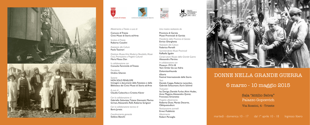 CONSULTA FEMMINILE DI TRIESTE Allestimento a Trieste a cura di Una mostra realizzata da Comune di Trieste Civici Musei di Storia ed Arte Provincia di Gorizia Musei Provinciali di Gorizia Presidente della Provincia di Gorizia Enrico Gherghetta Assessore alla Cultura Federico Portelli Sovrintendente Musei Provinciali Raffaella Sgubin Conservatore Museo della Grande Guerra Alessandra Martina In collaborazione con Museum 1915-18 Vom Ortler bis zur Adria Dolomitenfreunde èStoria Festival Internazionale della Storia Testi Daniela Coppa, Roberto Lenardon, Gabriele Schaumann, Karin Schimd Traduzioni Isa Dorigo, Daniele Furlan, Alvin Hudec, Anna Magaina, Alessandro Quinzi, Francesca Simonetto Progetto allestimento Roberto Duse, Marzia Decorte, Obliquestudio.it Realizzazione pannelli Erreci Pubblicità Allestimento Robert Persoglia Sindaco di Trieste Roberto Cosolini Assessore alla Cultura Paolo Tassinari Direttore Museo Arte Moderna Revoltella, Musei Civici, Promozione e Progetti Culturali Maria Masau Dan In collaborazione con Consulta Femminile di Trieste Presidente Ondina Ghersin Sezione NON SOLO PENELOPE Immagini e documenti dalla Fototeca e dalla Biblioteca dei Civici Musei di Storia ed Arte A cura di Claudia Colecchia e Cristina Klarer Con la collaborazione di Gabriella Gelovizza, Tiziana Giannotti, Marino Ierman, Alessandra Relli, Roberto Scrignari Con la collaborazione tecnica di Boris Juretic Coordinamento generale Stefano Bianchi DONNE NELLA GRANDE GUERRA 6 marzo - 10 maggio 2015 Sala “Attilio Selva” Palazzo Gopcevich Via Rossini, 4 - Trieste martedì - domenica 10 - 17 dal 1° aprile 10 - 18 Ingresso libero Partendo dalla condizione delle donne agli inizi del Novecento, dopo un rapido sguardo sui movimenti di emancipazione femminile che, a partire dalla seconda metà dell’Ottocento, iniziano a farsi sentire soprattutto nei paesi economicamente avanzati, l’esposizione racconta l’imponente ruolo delle donne durante il primo conflitto mondiale. Con la mobilitazione e con il rapido incremento delle perdite un numero sempre maggiore di uomini fu chiamato alle armi e dovette lasciare il proprio posto di lavoro. Furono le donne che, oltre ai propri doveri familiari, sostituirono gli uomini nei posti rimasti vacanti, in occupazioni fino ad allora esclusivamente maschili: operaie nelle fabbriche, guidatrici di tram, postine, vigili del fuoco, operaie forestali. Molte si impegnarono in organizzazioni volontarie di soccorso, si dedicarono alla cura dei feriti e degli ammalati. Altre furono militarizzate e utilizzate tanto in uffici quanto in lavori pesanti come nel caso delle portatrici. In rari casi parteciparono anche direttamente ai combattimenti. In particolare in Austria-Ungheria ragazze e donne furono impiegate al fronte su base volontaria per raccogliere informazioni, per il rifornimento di viveri ai combattenti, per sostituire in uffici civili e militari gli uomini che erano al fronte. Fu in particolare nelle fabbriche e, tra queste, nelle fabbriche di esplosivi e munizioni, che le donne vennero impiegate in modo massiccio. La manipolazione di sostanze chimiche velenose con cui si preparavano gli esplosivi provocò gravi problemi di salute che furono sottovalutati. La mortalità tra le operaie era molto alta per gli incidenti dovuti alla mancanza di norme di sicurezza imposta dall’obbligo di aumentare e velocizzare al massimo la produzione. Lo stato di semischiavitù in cui si trovarono a vivere le maestranze nelle fabbriche, militarizzate e sottoposte alle leggi di guerra, impediva ogni azione a tutela della salute e della sicurezza, o a difesa del salario, bollata subito come sovversiva e disfattista di fronte ai supremi interessi del paese. Ma la guerra costrinse anche alla fuga centinaia di migliaia di civili dalle zone di guerra: si trattava di donne con vecchi e bambini che negli anni del conflitto percorsero l’Europa nella speranza di trovare un posto più sicuro dove fermarsi e dove trovare come sopravvivere. In tanti si rifugiarono nelle città dove le condizioni di vita si facevano di giorno in giorno peggiori con i generi alimentari razionati e la penuria di ogni genere di merci. Il doppio impegno in casa e al lavoro con un salario sempre più basso di quello degli uomini, l’impossibilità di seguire l’educazione dei figli, costrinse le donne a cambiare sostanzialmente il loro stile di vita. Contemporaneamente nascevano anche una nuova consapevolezza e indipendenza derivate dal ruolo attivo che le donne avevano assunto negli anni del conflitto anche se con la fine della guerra, con la riconversione ad uso civile dell’industria e le generali difficoltà economiche molte donne persero il loro posto di lavoro. Inoltre particolarmente pesante era la situazione delle vedove e delle mogli dei tanti soldati che rientrarono invalidi dalla guerra e quindi impossibilitati a trovare un lavoro. Le donne uscirono quindi dall’esperienza della guerra con maggiore fiducia in sé stesse e, allo stesso tempo, con la convinzione che nulla sarebbe stato più come prima. La strada verso l’emancipazione, però, non era ancora tutta percorsa. NON SOLO PENELOPE Immagini e documenti dalla Fototeca e dalla Biblioteca dei Civici Musei di Storia ed Arte Tra le testimonianze rilevanti per effettuare un’analisi della figura femminile, durante la guerra, un posto importante è naturalmente occupato dalla fotografia. Prima dell’avvento e della fortuna di altri media, la fotografia ha svolto un ruolo privilegiato nel focalizzare modelli e divulgare stereotipi, rivelandosi indispensabile strumento per cogliere i progressivi mutamenti della rappresentazione del “femminile”. Nello specifico, per quanto concerne la riproduzione delle donne: il documento fotografico ci restituisce la cristallizzazione di una identità sociale e di un mondo relazionale caratterizzato da una rigorosa quando rigida definizione dei ruoli. Con la guerra tuttavia la società si rimescola e il coinvolgiment