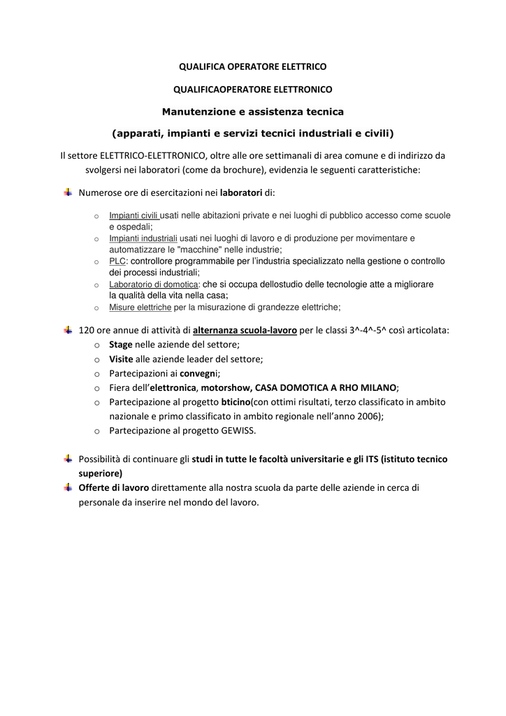 QUALIFICA OPERATORE ELETTRICO QUALIFICAOPERATORE ELETTRONICO Manutenzione e assistenza tecnica (apparati, impianti e servizi tecnici industriali e civili) Il settore ELETTRICO-ELETTRONICO, oltre alle ore settimanali di area comune e di indirizzo da svolgersi nei laboratori (come da brochure), evidenzia le seguenti caratteristiche: Numerose ore di esercitazioni nei laboratori di: o Impianti civili usati nelle abitazioni private e nei luoghi di pubblico accesso come scuole e ospedali; o o o o Impianti industriali usati nei luoghi di lavoro e di produzione per movimentare e automatizzare le "macchine" nelle industrie; PLC: controllore programmabile per l’industria specializzato nella gestione o controllo dei processi industriali; Laboratorio di domotica: che si occupa dellostudio delle tecnologie atte a migliorare la qualità della vita nella casa; Misure elettriche per la misurazione di grandezze elettriche; 120 ore annue di attività di alternanza scuola-lavoro per le classi 3^-4^-5^ così articolata: o Stage nelle aziende del settore; o Visite alle aziende leader del settore; o Partecipazioni ai convegni; o Fiera dell’elettronica, motorshow, CASA DOMOTICA A RHO MILANO; o Partecipazione al progetto bticino(con ottimi risultati, terzo classificato in ambito nazionale e primo classificato in ambito regionale nell’anno 2006); o Partecipazione al progetto GEWISS. Possibilità di continuare gli studi in tutte le facoltà universitarie e gli ITS (istituto tecnico superiore) Offerte di lavoro direttamente alla nostra scuola da parte delle aziende in cerca di personale da inserire nel mondo del lavoro.