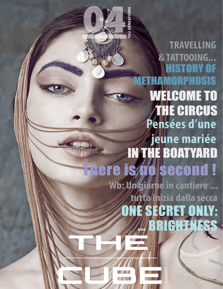 TAU SENSATIONS 04 TRAVELLING & TATTOOING... HISTORY OF METHAMORPHOSIS WELCOME TO THE CIRCUS Pensées d’une jeune mariée IN THE BOATYARD There is no second ! Wb: Un giorno in cantiere ... tutto inizia dalla secca January 2016 ONE SECRET ONLY: ... BRIGHTNESS TAU SENSATIONS .04 La parola Tatuaggio viene da Tau, che significa colpire, battere. Viene usato tra le popolazioni occidentali introducendo sotto pelle un pigmento e tra le popolazioni di etnia africana o comunque di pelle scura ,usando altre ornamenti permanenti come l’incisione sulla pelle. Il tatuaggio, oggi cosi cool, non sempre è stato cosi . In passato è stato attribuito a diverse categorie socio culturali. Nella Genesi ,il primo tatuato fu Caino , e fino a tutto l’800 , proprio per questo, il tatuaggio fu considerato il marchio di Caino, simbolo permanente di “colpa”. Il tattoo ha avuto una fama altalenante: da simbolo volgare e legato alla criminalità, all’essere considerato trendy , non più simbolo di inferiorià. Che fino al secolo scorso il tatuaggio fossi considerato un segno di appartenenza a una clasta o a una classe sociale, o fossi d’origine criminale o nobiliare, poco importa. Ora è un simbolo di distinzione, un modo per raccontare sulla pelle il passato e il futuro. The word tattoo comes from Tau, which means hitting, beat. It is used among Western populations by introducing a pigment under the skin and between the populations of ethnic African or otherwise dark skin, using other ornaments permanent as the skin incision. The tattoo, now so cool, it was not always so. In the past it Has Been ascribed to various social and cultural categories. In Genesis, the first tattoo was Cain, and until the end of the 800, because of it, the tattoo was considered the mark of Cain, permanent symbol of “guilt.” The tattoo has had a fluctuating hunger: from symbol vulgar and related crime, being considered trendy, no longer a symbol of inferiority. It doesn’t matter that until the last century the tattoo were considered a sign of belonging to a caste or a social class, or were of criminal or noble origin. It is now a symbol of distinction, a way to tell on the skin’s past and future. WWW.THECUBEMAGAZINE.COM Wb 24 114 19. One Secret only : ....BRIGHTNESS WORLD VISUAL SPACES 88 There is no second ! 98 Travelling & Tattooing ... 114 Wb: “Un giorno in cantiere ... tutto inizia dalla secca.” 67 98 37 06 88 19 06. History of METHAMORPHOSIS 24. Pensées d’une jeune mariéè 37. Welcome to THE CIRCUS 67. IN THE BOATYARD History of Metamorposis History of Methamorphosis Photographer Riccardo La Valle Creative director and stylist Gianmarco Bersani Make up artist: Vanessa Icareg Hair stylist: Serena Congiu Model Wang_Beyond Models Sweatshirt: Aber Gazzi www.thecubemagazine.com 06 Glass top: Aber Gazzi www.thecubemagazine.com Paper dress: Flavia Cavalcanti www.thecubemagazine.com Bib: Flavia Cavalcanti Headpiece: Vanille Queen Bracelets: Kebros; Claire’s Rings: Kebros; Claire’s www.thecubemagazine.com Dress: Antonio Pizzino Wax headpiece: Vanille Queen Golden Rings: Claire’s www.thecubemagazine.com Top: Aber Gazzi Hat: Zena www.thecubemagazine.com Total look: Flavia Cavalcanti www.thecubemagazine.com Dress: Alcoolique Hat: Zena White crystals mask: Vanille Queen Dark crystals earrings: Davide Zingarelli ONE SECRET ONLY: ...BRIGHTNESS a cura di Stefania Lupi Effetto luce. Riflessi preziosi. Gioielli disegnati sulla pelle. Un solo segreto: la luminosita’. E’ la strategia vincente dei cosmetici che regalano al viso trasparenza, splendore e un finish impeccabile. Light effect. Precious images. Jewelry designed on the skin. One secret only: the brightness. It’s the winning strategy of cosmetics that give transparency, brilliance and an immaculate finish. 19 ia libera all’immaginazione........ Tatuaggi temporanei stile gioiello ispirati a motivi etnici e geometrici: collane, bracciali o anelli creati su misura. Waterproof e non tossici, hanno una durata di 4-6 giorni a seconda del tipo di pelle e si eliminano facilmente. Collezione Vega The Glam Tattoo Company. (nei beauty store Sephora, 19,90 euro). I magination has no limits. Temporary tattoos style jewel inspired by ethnic motifs and geometric necklaces , bracelets or rings tailored . Waterproof and non-toxic, they have a duration of 4-6 days, depending on the type of skin and can be easily removed .Vega Collection The Glam Tattoo Company. Seven delicate gels for seven unique shades, ideal for brightening highlights and bringing dull colours back to life. Seven fine products that work with extremely gentle action, bringing out the well-being of your hair with nourishing, shine-enhancing and strengthening agents. The L’Erbolario Colours, with a gentle yet remarkable colourant, it is not aggressive: in fact, these colours are 100% ammonia and oxidant-free. Henna Red L’Erbolario to gently colour your hair. www.thecubemagazine.com V Sette delicati gel per sette nuances uniche, ideali per illuminare di riflessi i capelli, rivitalizzando i colori più spenti. Sette specialità che agiscono in tutta dolcezza, esaltando il benessere della capigliatura con agenti nutrienti, lucidanti e sostantivanti. Con estratti vegetali, senza ammoniaca e ossidanti. Rosso Hennè L’Erbolario. Per la colorazione dolce dei capelli (9,80 euro) . Terra belle mine effetto naturale Collistar Ti Amo Italia. Thin and velvet touch powder composed by a mat bronzer and a blush with bi-reflexed pearls for an extremely natural effect . Finish : radiant effect in a step only . For a fresh -looking skin . Apply after mixed the two shade Create the most seductive and smouldering eye looks. Unlike other Kajal’s, Colour Riche Le Kajal L’Oréal contains a highly pigmented formula that creates your most impactful smokey eye yet. Deep black colour glides on in an instant with the unique cone shaped tip and smooth feel. ultra creamy formula provides effortless glide for easy and quick a