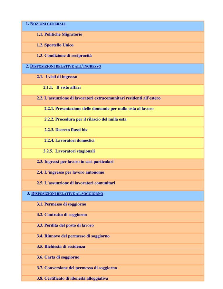 1. NOZIONI GENERALI 1.1. Politiche Migratorie 1.2. Sportello Unico 1.3. Condizione di reciprocità 2. DISPOSIZIONI RELATIVE ALL’INGRESSO 2.1. I visti di ingresso 2.1.1. Il visto affari 2.2. L’assunzione di lavoratori extracomunitari residenti all’estero 2.2.1. Presentazione delle domande per nulla osta al lavoro 2.2.2. Procedura per il rilascio del nulla osta 2.2.3. Decreto flussi bis 2.2.4. Lavoratori domestici 2.2.5. Lavoratori stagionali 2.3. Ingressi per lavoro in casi particolari 2.4. L’ingresso per lavoro autonomo 2.5. L’assunzione di lavoratori comunitari 3. DISPOSIZIONI RELATIVE AL SOGGIORNO 3.1. Permesso di soggiorno 3.2. Contratto di soggiorno 3.3. Perdita del posto di lavoro 3.4. Rinnovo del permesso di soggiorno 3.5. Richiesta di residenza 3.6. Carta di soggiorno 3.7. Conversione del permesso di soggiorno 3.8. Certificato di idoneità alloggiativa NOZIONI GENERALI CHE COS’È IL TESTO UNICO SULL’IMMIGRAZIONE? Il Testo Unico sull’immigrazione (Decreto Legislativo n. 286/98, così come modificato dalla Legge n. 189/02, cosiddetta Bossi-Fini) contiene il quadro normativo di riferimento per disciplina dell’ingresso, del soggiorno e, in generale, della condizione giuridica degli stranieri in Italia. A CHI SI APPLICA IL TESTO UNICO SULL’IMMIGRAZIONE? Le norme contenuto nel Testo Unico sull’immigrazione si applicano ai cittadini degli Stati non appartenenti all’Unione Europea ed agli apolidi. Il Testo Unico sull’immigrazione non trova applicazione nei confronti dei cittadini di quei Paesi membri dello Spazio Economico Europeo che non sono membri dell’UE, ovvero l’Islanda, il Liechtenstein e la Norvegia. Ai cittadini di tali Stati si applicano le norme sulla libera circolazione delle persone in vigore per i cittadini comunitari (vedi D.P.R. n. 54/2002). Norme particolari sono, inoltre, dettate per i cittadini Svizzeri, sulla base dell'Accordo tra la Confederazione Svizzera e la Comunità Europea, sulla libera circolazione delle persone, entrato in vigore il 1° giugno 2002. CHI SONO I CITTADINI NEOCOMUNITARI? QUALE DISCIPLINA SI APPLICA LORO? Sono cittadini comunitari i cittadini provenienti da uno dei 27 Stati membri dell’Unione Europea (Italia, Germania, Francia, Lussemburgo, Olanda, Belgio, Regno Unito, Irlanda, Austria, Spagna, Portogallo, Grecia, Danimarca, Svezia, Finlandia, Polonia, Slovacchia, Repubblica Ceca, Slovenia, Ungheria, Estonia. Lettonia, Lituania, Malta e Cipro, Romania e la Bulgaria). Romania e Bulgaria sono entrate a far parte dell’Unione Europea dal 1° gennaio 2007. Tutti i cittadini comunitari hanno diritto di libera circolazione e soggiorno nel territorio degli Stati membri, salvo le limitazioni derivanti dalle disposizioni in materia penale ed a tutela dell'ordine pubblico e della sicurezza interna. A decorrere dal 1° gennaio 2007 sono quindi cessati gli effetti dei provvedimenti di espulsione adottati nei confronti dei cittadini rumeni e bulgari, salvo appunto quelli motivati per ragioni di ordine e sicurezza pubblica o di sanità pubblica (Circolare congiunta del Ministero della Solidarietà Sociale e del Ministero dell’Interno n. 2 del 28 dicembre 2006). Nei confronti dei cittadini comunitari non si applicano le disposizioni del Testo unico sull’immigrazione, ma trovano applicazione le norme contenute del D.P.R. 18 gennaio 2002 n. 54 e successive modifiche ed integrazioni*. * È in procinto di essere adottato il Decreto legislativo con il quale verrà recepita la direttiva 2004/38/CE del Parlamento europeo e del Consiglio del 29 aprile 2004 relativa al diritto dei cittadini dell’Unione e dei loro familiari di circolare e di soggiornare liberamente nel territorio degli Stati membri, le cui norme sostituiranno quelle attualmente contenute nel D.P.R. n. 54/2002 Per l’assunzione dei cittadini comunitari vedi sotto. POLITICHE MIGRATORIE CHE COSA SI INTENDE PER REGOLAMENTO DI ATTUAZIONE? I regolamenti di attuazione sono fonti normative secondaria, finalizzati a dettare norme applicative ed integrative di leggi e decreti legislativi recanti norme di principio. Il regolamento di attuazione del Testo unico sull’immigrazione è stato emanato con D.P.R. 31 agosto 1999, n. 394, il cui testo è stato successivamente modificato con il D.P.R. del 18 ottobre 2004 n. 334. CHE COSA SI INTENDE PER DOCUMENTO PROGRAMMATICO? Il documento programmatico è l’atto di programmazione delle politiche migratorie, predisposto ogni tre anni (salvo la necessità di un termine più breve) dal Governo con un’ampia concertazione. In tale documento vengono indicate le azioni e gli interventi che lo Stato italiano si propone di svolgere in materia di immigrazione, anche in cooperazione con gli altri Stati dell’Ue o con le organizzazioni internazionali, oppure mediante la stipulazione di accordi con i Paesi da cui provengono i maggiori flussi migratori. Il documento programmatico individua inoltre i criteri generali per la definizione dei flussi di ingresso nel territorio dello Stato. Sulla base delle indicazioni contenute nel documento programmatico, ogni anno il Presidente del Consiglio emana uno o più decreti, attraverso i quali definisce le quote massime di stranieri da ammettere nel territorio dello Stato per lavoro subordinato, anche di carattere stagionale, e per lavoro autonomo (cd. decreti flussi). Documento programmatico relativo alla politica dell’immigrazione e degli stranieri nel territorio dello Stato per il 2004-2006 CHE COS’È IL COMITATO PER IL COORDINAMENTO ED IL MONITORAGGIO? Si tratta del Comitato istituito ai sensi dell’art. 2 bis del Testo Unico sull’immigrazione, incaricato di svolgere la parte istruttoria che deve condurre all’emanazione del decreto annuale di programmazione dei flussi e del documento di programmazione triennale. È presieduto dal Presidente o Vice-Presidente del Consiglio ed è composto dai Ministri interessati al tema di ciascuna riunione e da un Presidente di Regione o Provincia Autonoma (
