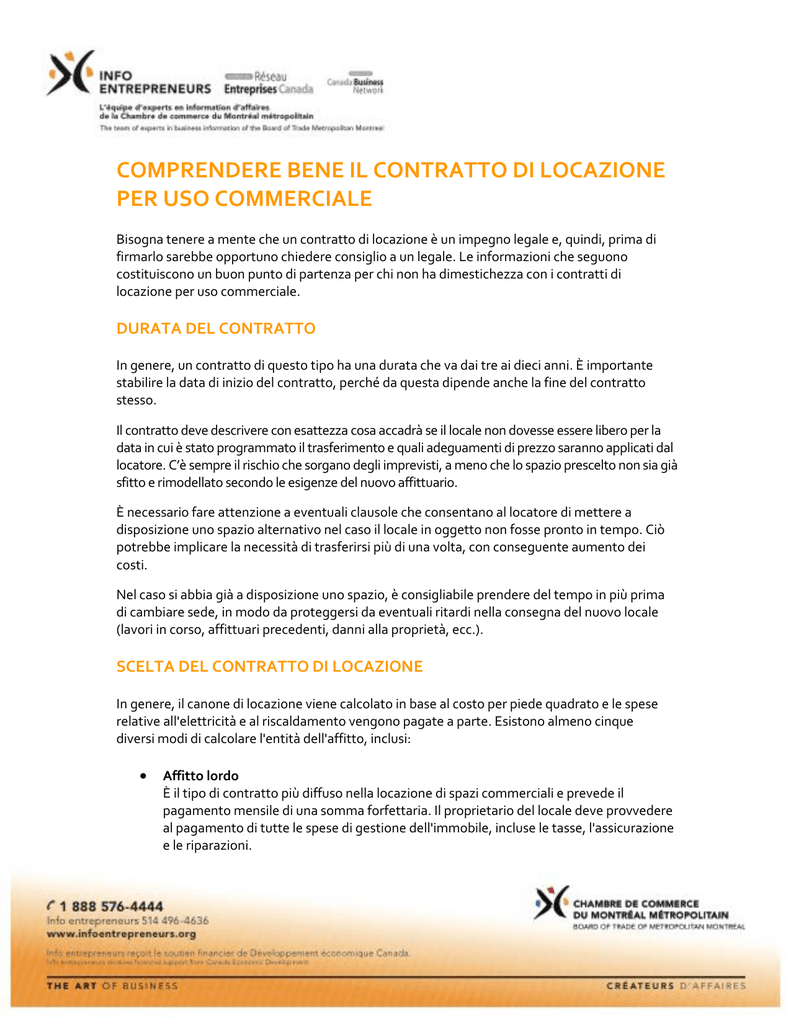 COMPRENDERE BENE IL CONTRATTO DI LOCAZIONE PER USO COMMERCIALE Bisogna tenere a mente che un contratto di locazione è un impegno legale e, quindi, prima di firmarlo sarebbe opportuno chiedere consiglio a un legale. Le informazioni che seguono costituiscono un buon punto di partenza per chi non ha dimestichezza con i contratti di locazione per uso commerciale. DURATA DEL CONTRATTO In genere, un contratto di questo tipo ha una durata che va dai tre ai dieci anni. È importante stabilire la data di inizio del contratto, perché da questa dipende anche la fine del contratto stesso. Il contratto deve descrivere con esattezza cosa accadrà se il locale non dovesse essere libero per la data in cui è stato programmato il trasferimento e quali adeguamenti di prezzo saranno applicati dal locatore. C’è sempre il rischio che sorgano degli imprevisti, a meno che lo spazio prescelto non sia già sfitto e rimodellato secondo le esigenze del nuovo affittuario. È necessario fare attenzione a eventuali clausole che consentano al locatore di mettere a disposizione uno spazio alternativo nel caso il locale in oggetto non fosse pronto in tempo. Ciò potrebbe implicare la necessità di trasferirsi più di una volta, con conseguente aumento dei costi. Nel caso si abbia già a disposizione uno spazio, è consigliabile prendere del tempo in più prima di cambiare sede, in modo da proteggersi da eventuali ritardi nella consegna del nuovo locale (lavori in corso, affittuari precedenti, danni alla proprietà, ecc.). SCELTA DEL CONTRATTO DI LOCAZIONE In genere, il canone di locazione viene calcolato in base al costo per piede quadrato e le spese relative all'elettricità e al riscaldamento vengono pagate a parte. Esistono almeno cinque diversi modi di calcolare l'entità dell'affitto, inclusi: • Affitto lordo È il tipo di contratto più diffuso nella locazione di spazi commerciali e prevede il pagamento mensile di una somma forfettaria. Il proprietario del locale deve provvedere al pagamento di tutte le spese di gestione dell'immobile, incluse le tasse, l'assicurazione e le riparazioni. • Affitto netto Questo tipo di contratto stabilisce che il locatario paghi alcune delle imposte sul patrimonio immobiliare (o tutte), oltre al canone base. I costi di gestione dell’immobile sono a carico del proprietario. • Affitto netto-netto Con questo tipo di contratto, il locatario è responsabile del pagamento del canone base e delle imposte, oltre che dell’assicurazione relativa allo spazio che occupa. • Affitto netto-netto-netto o “Triplo netto” Nel triplo netto, tutti i costi di gestione dell’immobile, comprese le spese di riparazione e manutenzione, sono a carico del locatario. Questo tipo di contratto viene solitamente usato per le proprietà industriali. • Affitto percentuale Con questo tipo di contratto, il locatario paga un canone fisso più una percentuale del reddito lordo. L'affitto percentuale è un tipo di contratto particolare, che si applica agli affittuari di locali per il commercio al dettaglio in edifici multi-tenant (ad esempio i centri commerciali). AUMENTO DEL CANONE In passato, all'aumento dei costi di gestione dell’immobile corrispondeva un aumento del canone di locazione nel momento in cui il contratto veniva rinnovato o se si sottoscriveva un contratto con un nuovo locatario. Oggi la maggior parte dei locatori si proteggono dai cambiamenti imprevisti del mercato immobiliare includendo nel contratto una clausola di adeguamento del canone, che consente al locatore di aumentare il canone nel caso in cui i costi di gestione e manutenzione dell'immobile salgano. In genere, la clausola di adeguamento è il risultato di un accordo tra locatore e locatario. Ecco alcuni esempi di clausola di adeguamento: • • • aumenti regolari del canone nel periodo di validità del contratto aumenti proporzionali all’incremento di imposte, costi di riscaldamento, manutenzione e altri costi diretti aumento automatico del canone in rapporto all’Indice dei prezzi al consumo (CPI) o ad altri indici inflazionistici. Nota: Il CPI, in genere, sovrastima gli impatti inflazionistici, quindi l’aumento del canone deve corrispondere a una porzione della crescita annua del CPI, soprattutto se il canone prevede già degli aumenti relativi a imposte e costi di esercizio diretti. SUBAFFITTO DEL LOCALE Nel caso si decida di espandere la propria attività o di trasferirsi prima della scadenza del contratto, è possibile accordarsi con il proprietario del locale per un eventuale subaffitto. Bisogna accertarsi che la persona interessata a prendere il locale in subaffitto risponda ai criteri stabiliti dal locatore. Nel caso in cui il subaffittuario decida di andare via prima della scadenza del contratto, il pagamento del canone per i mesi restanti sarà di competenza del locatario. RINNOVO DEL CONTRATTO DI LOCAZIONE Alla scadenza del contratto, il locatore non ha alcun obbligo legale di continuare a concedere in locazione la sua proprietà al locatario, a meno che non esista un accordo di rinnovo del contratto e vi sia una clausola che garantisca il prolungamento del contratto stesso. In genere, per far valere il proprio diritto al rinnovo del contratto è necessario mandare una comunicazione scritta, altrimenti la scadenza è automatica (per i contratti a lungo termine, un anno di preavviso è la norma, mentre per i contratti a breve termine sono sufficienti tre o quattro mesi). Alcuni contratti si rinnovano automaticamente finché non si decide di annullarli. Questa può essere una buona scelta, soprattutto se un’impresa ha più sedi e non si vuole rischiare di lasciar scadere il contratto di locazione. COSA SUCCEDE SE IL LOCATORE FALLISCE? È possibile proteggere se stessi e la propria impresa inserendo nel contratto una clausola di inalterabilità, che assicura la prosecuzione del contratto di locazione in caso di pignoramento del locale. ASSICURAZIONE In genere, i locatori stipulano per il proprio immo