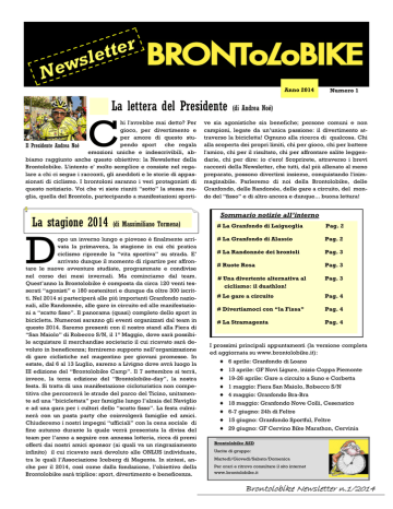s w e N r e t let Anno 2014 La lettera del Presidente C hi l'avrebbe mai detto? Per gioco, per divertimento e per amore di questo stupendo sport che regala Il Presidente Andrea Noé emozioni uniche e indescrivibili, abbiamo raggiunto anche questo obiettivo: la Newsletter della Brontolobike. L'intento e' molto semplice e consiste nel regalare a chi ci segue i racconti, gli aneddoti e le storie di appassionati di ciclismo. I brontoloni saranno i veri protagonisti di questo notiziario. Voi che vi siete riuniti “sotto” la stessa maglia, quella del Brontolo, partecipando a manifestazioni sporti- La stagione 2014 D Numero 1 (di Andrea Noé) ve sia agonistiche sia benefiche; persone comuni e non campioni, legate da un’unica passione: il divertimento attraverso la bicicletta! Ognuno alla ricerca di qualcosa. Chi alla scoperta dei propri limiti, chi per gioco, chi per battere l'amico, chi per il risultato, chi per affrontare salite leggendarie, chi per dire: io c'ero! Scoprirete, attraverso i brevi racconti della Newsletter, che tutti, dal più allenato al meno preparato, possono divertirsi insieme, conquistando l'inimmaginabile. Parleremo di noi della Brontolobike, delle Granfondo, delle Randonée, delle gare a circuito, del mondo del “fisso” e di altro ancora e dunque... buona lettura! Sommario notizie all’interno (di Massimiliano Tormena) opo un inverno lungo e piovoso è finalmente arrivata la primavera, la stagione in cui chi pratica ciclismo riprende la “vita sportiva” su strada. E’ arrivato dunque il momento di ripartire per affrontare le nuove avventure studiate, programmate e condivise nel corso dei mesi invernali. Ma cominciamo dal team. Quest’anno la Brontolobike è composta da circa 120 venti tesserati “agonisti” e 180 sostenitori e dunque da oltre 300 iscritti. Nel 2014 si parteciperà alle più importanti Granfondo nazionali, alle Randonnée, alle gare in circuito ed alle manifestazioni a “scatto fisso”. Il panorama (quasi) completo dello sport in bicicletta. Numerosi saranno gli eventi organizzati dal team in questo 2014. Saremo presenti con il nostro stand alla Fiera di “San Maiolo” di Robecco S/N, il 1° Maggio, dove sarà possibile acquistare il merchandise societario il cui ricavato sarà devoluto in beneficenza; forniremo supporto nell’organizzazione di gare ciclistiche nel magentino per giovani promesse. In estate, dal 6 al 13 Luglio, saremo a Livigno dove avrà luogo la III edizione del “Brontolobike Camp”. Il 7 settembre si terrà, invece, la terza edizione del “Brontolobike-day”, la nostra festa. Si tratta di una manifestazione cicloturistica non competitiva che percorrerà le strade del parco del Ticino, unitamente ad una “biciclettata” per famiglie lungo l’alzaia del Naviglio e ad una gara per i cultori dello “scatto fisso”. La festa culminerà con un pasta party che coinvolgerà famiglie ed amici. Chiuderemo i nostri impegni “ufficiali” con la cena sociale di fine autunno durante la quale verrà presentata la divisa del team per l’anno a seguire con annessa lotteria, ricca di premi offerti dai nostri amici sponsor (ai quali va un ringraziamento infinito) il cui ricavato sarà devoluto alle ONLUS individuate, tra le quali l’Associazione Iceberg di Magenta. In sintesi, anche per il 2014, così come dalla fondazione, l’obiettivo della Brontolobike sarà triplice: sport, divertimento e beneficenza. # La Granfondo di Laigueglia Pag. 2 # La Granfondo di Alassio Pag. 2 # La Randonnée dei brontoli Pag. 3 # Ruote Rosa Pag. 3 # Una divertente alternativa al ciclismo: il duathlon! Pag. 3 # Le gare a circuito Pag. 4 # Divertiamoci con “la Fissa” Pag. 4 # La Stramagenta Pag. 4 I prossimi principali appuntamenti (la versione completa ed aggiornata su www.brontolobike.it): ♦ ♦ ♦ ♦ ♦ ♦ ♦ ♦ ♦ 6 aprile: Granfondo di Loano 13 aprile: GF Novi Ligure, inizio Coppa Piemonte 19-26 aprile: Gare a circuito a Suno e Corbetta 1 maggio: Fiera San Maiolo, Robecco S/N 4 maggio: Granfondo Bra-Bra 18 maggio: Granfondo Nove Colli, Cesenatico 6-7 giugno: 24h di Feltre 15 giugno: Granfondo Sportful, Feltre 29 giugno: GF Cervino Bike Marathon, Cervinia Brontolobike ASD Uscite di gruppo: Martedì/Giovedì/Sabato/Domenica Per orari e ritrovo consultare il sito internet www.brontolobike.it Brontolobike Newsletter n.1/2014 Pagina 2 Granfondo e Randonnée: le nostre avventure... La Granfondo di Laigueglia, 26/2/2014 V (di Massimiliano Tormena) orrei aprire il resoconto della prima granfondo mento e di apprezzamento per me ed i ragazzi del team. Eh stagionale ribaltando il solito canovaccio. Prima i si, perdonate l'esagerazione, ma quest'anno che, come saringraziamenti doverosi: un grazie davvero gran- pete, il nostro presidente ci sarà raramente e sento davvede e sentito ad Albino Pagani che ci ha immortala- ro di essere il riferimento per queste meravigliose ragazze to tutti con splendide foto ed incitato ad ogni passaggio; e fantastici ragazzi che mi seguiranno per mezza Italia con il a Gigio Regusini, che con il suo "alè Massi", in cima al Para- numero attaccato sulla schiena e sono certo, certissimo, che venna, mi ha davvero messo le ali, e grazie a daremo ad Andrea e Simona, i no"Cav" Claudio Iannacci, davvero encomiabile e prezioso stri Presidentissimi, tanti motivi per a servizio del team per il ritiro dei pacchi gara. Grazie a essere orgogliosi del team. Agonitutti i ragazzi che hanno corso oggi, che, come me, sono sticamente parlando la corsa è stata partiti all’alba da Magenta e che hanno onorato la maglia tirata da subito. Giornata primaveriseguendo alla lettera le indicazioni della vigilia sul comle, fantastica, ideale per gareggiare portamento da seguire prima, durante e dopo la corsa. e soprattutto un’organizzazione al Infine, il ringraziamento più sentito va al grandissimo top. E’ stato bello tornare in gri14 brontoli iscritti alla GF Laigueglia. Direttore Sportivo di giornata, Andrea Casti, che, sagli