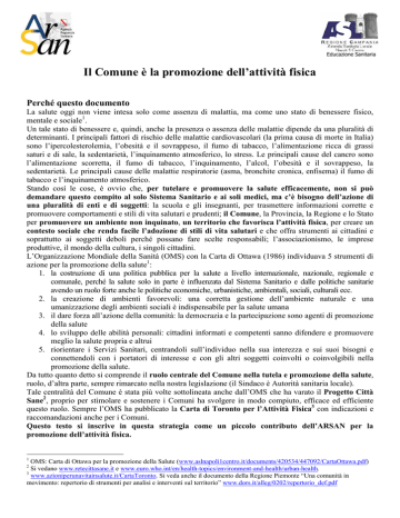 Educazione Sanitaria Il Comune è la promozione dell’attività fisica Perché questo documento La salute oggi non viene intesa solo come assenza di malattia, ma come uno stato di benessere fisico, mentale e sociale1. Un tale stato di benessere e, quindi, anche la presenza o assenza delle malattie dipende da una pluralità di determinanti. I principali fattori di rischio delle malattie cardiovascolari (la prima causa di morte in Italia) sono l’ipercolesterolemia, l’obesità e il sovrappeso, il fumo di tabacco, l’alimentazione ricca di grassi saturi e di sale, la sedentarietà, l’inquinamento atmosferico, lo stress. Le principali cause del cancro sono l’alimentazione scorretta, il fumo di tabacco, l’inquinamento, l’alcol, l’obesità e il sovrappeso, la sedentarietà. Le principali cause delle malattie respiratorie (asma, bronchite cronica, enfisema) il fumo di tabacco e l’inquinamento atmosferico. Stando così le cose, è ovvio che, per tutelare e promuovere la salute efficacemente, non si può demandare questo compito al solo Sistema Sanitario e ai soli medici, ma c’è bisogno dell’azione di una pluralità di enti e di soggetti: la scuola e gli insegnanti, per trasmettere informazioni corrette e promuovere comportamenti e stili di vita salutari e prudenti; il Comune, la Provincia, la Regione e lo Stato per promuovere un ambiente non inquinato, un territorio che favorisca l’attività fisica, per creare un contesto sociale che renda facile l’adozione di stili di vita salutari e che offra strumenti ai cittadini e soprattutto ai soggetti deboli perché possano fare scelte responsabili; l’associazionismo, le imprese produttive, il mondo della cultura, i singoli cittadini. L’Organizzazione Mondiale della Sanità (OMS) con la Carta di Ottawa (1986) individuava 5 strumenti di azione per la promozione della salute1: 1. la costruzione di una politica pubblica per la salute a livello internazionale, nazionale, regionale e comunale, perché la salute solo in parte è influenzata dal Sistema Sanitario e dalle politiche sanitarie avendo un ruolo forte anche le politiche economiche, urbanistiche, ambientali, sociali, culturali ecc. 2. la creazione di ambienti favorevoli: una corretta gestione dell’ambiente naturale e una umanizzazione degli ambienti sociali è indispensabile per la salute umana 3. il dare forza all’azione della comunità: la democrazia e la partecipazione sono agenti di promozione della salute 4. lo sviluppo delle abilità personali: cittadini informati e competenti sanno difendere e promuovere meglio la salute propria e altrui 5. riorientare i Servizi Sanitari, centrandoli sull’individuo nella sua interezza e sui suoi bisogni e connettendoli con i portatori di interesse e con gli altri soggetti coinvolti o coinvolgibili nella promozione della salute. Da tutto quanto detto si comprende il ruolo centrale del Comune nella tutela e promozione della salute, ruolo, d’altra parte, sempre rimarcato nella nostra legislazione (il Sindaco è Autorità sanitaria locale). Tale centralità del Comune è stata più volte sottolineata anche dall’OMS che ha varato il Progetto Città Sane2, proprio per stimolare e sostenere i Comuni ha svolgere in modo compiuto, efficace ed efficiente questo ruolo. Sempre l’OMS ha pubblicato la Carta di Toronto per l’Attività Fisica3 con indicazioni e raccomandazioni anche per i Comuni. Questo testo si inscrive in questa strategia come un piccolo contributo dell’ARSAN per la promozione dell’attività fisica. 1 OMS: Carta di Ottawa per la promozione della Salute (www.aslnapoli1centro.it/documents/420534/447092/CartaOttawa.pdf) Si vedano www.retecittasane.it e www.euro.who.int/en/health-topics/environment-and-health/urban-health. 3 www.azioniperunavitainsalute.it/CartaToronto. Si veda anche il documento della Regione Piemonte “Una comunità in movimento: repertorio di strumenti per analisi e interventi sul territorio” www.dors.it/alleg/0202/repertorio_def.pdf 2 L'attività fisica è di grande importanza per la salute, il benessere, lo sviluppo fisico, psichico e sociale. Una quotidiana e adeguata attività fisica è di grande importanza per la promozione del benessere, il mantenimento della salute e la prevenzione di numerose patologie. Il nostro organismo è programmato geneticamente per fare lunghe camminate, per correre, per arrampicarsi, per lottare e per molte altre attività motorie, perché per milioni di anni sono stati gli strumenti indispensabili per procacciarsi il cibo, fuggire dai predatori, difendersi. Si è così selezionato un patrimonio genetico funzionale ad una frequente e anche intensa attività motoria. Per questo motivo un’insufficiente attività fisica è tra le cause di numerosissime patologie: obesità, arteriosclerosi, diabete, infarto, ictus, cancro del colon e del seno, colecistopatie, osteoporosi, lombaggine ecc. Un’adeguata attività fisica, invece, rafforza i muscoli, i tendini e le ossa, aumenta la capacità respiratoria, tiene pulite le arterie, migliora l’umore, aiuta a dormire meglio ecc. Inoltre l'attività motoria svolge un'importantissima funzione nello sviluppo cognitivo, affettivo e sociale di bambini e ragazzi ed è, molto spesso, un’attività che favorisce l’aggregazione e la socializzazione. In Europa la scarsa attività fisica è causa del 5-10% dei decessi (a seconda dei vari Paesi) determinando circa 600 mila morti all’anno e la perdita di 5,3 milioni di anni di vita in buona salute. L’insufficiente attività fisica costa, ogni anno, a ciascun Paese europeo circa 150-300 dollari americani a persona4. La gran maggioranza degli adulti, dei ragazzi e dei bambini campani fa pochissima attività fisica La situazione campana è drammatica. Il 70% dei cittadini campani tra 18 e 70 anni pratica meno di 150 minuti alla settimana di attività fisica moderata (cioè camminare a passo svelto, andare in bicicletta in piano, fare i lavori domestici, ginnastica a corpo libe