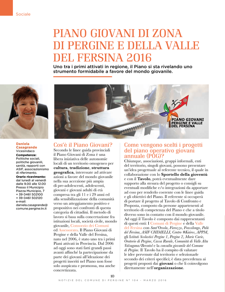 Sociale PIANO GIOVANI DI ZONA DI PERGINE E DELLA VALLE DEL FERSINA 2016 Uno tra i primi attivati in regione, il Piano si sta rivelando uno strumento formidabile a favore del mondo giovanile. Daniela Casagrande Vicesindaco Competenze: Politiche sociali, politiche giovanili, sanità, rapporti con ASIF, associazionismo di riferimento. Orario ricevimento: dal lunedì al venerdì dalle 9.00 alle 12.00 Presso il Municipio Piazza Municipio, 7 + 39 0461 502100 + 39 0461 502120 e-mail: daniela.casagrande@ comune.pergine.tn.it Cos’è il Piano Giovani? Secondo le linee guida provinciali il Piano Giovani di Zona è una libera iniziativa delle autonomie locali di un territorio omogeneo per cultura, tradizione, struttura geografica, interessate ad attivare azioni a favore del mondo giovanile nella sua accezione più ampia di pre-adolescenti, adolescenti, giovani e giovani adulti di età compresa tra gli 11 e i 29 anni ed alla sensibilizzazione della comunità verso un atteggiamento positivo e propositivo nei confronti di questa categoria di cittadini. Il metodo di lavoro si basa sulla concertazione fra istituzioni locali, società civile, mondo giovanile, Consorzio dei Comuni ed Assessorato. Il Piano Giovani di Pergine e della Valle del Fersina, nato nel 2006, è stato uno tra i primi Piani attivati in Provincia. Dal 2006 ad oggi sono stati fatti grandi passi avanti affinché la partecipazione da parte dei giovani all’ideazione dei progetti inseriti nel Piano non fosse solo auspicata e promossa, ma anche concretizzata. Come vengono scelti i progetti del piano operativo giovani annuale (POG)? Chiunque, associazioni, gruppi informali, enti del territorio, singoli giovani, possono presentare un’idea progettuale al referente tecnico, il quale in collaborazione con lo Sportello della gioventù e con il Tavolo, potrà eventualmente dare supporto alla stesura del progetto o consigli su eventuali modifiche e/o integrazioni da apportare ad esso per renderlo coerente con le linee guida e gli obiettivi del Piano. Il referente si occuperà di portare il progetto al Tavolo di Confronto e Proposta, composto da persone appartenenti al territorio di competenza del Piano e che a titolo diverso sono in contatto con il mondo giovanile. Ad oggi il Tavolo è composto dai rappresentanti di questi enti: I Comuni di Pergine e della Valle del Fersina con Sant’Orsola, Fierozzo, Frassilongo, Palù del Fersina, ASIF CHIMELLI, Centro #Kairos, APPM, gli Istituti Scolastici Pergine 1, Pergine 2, Marie Curie, Oratorio di Pergine, Cassa Rurale, Comunità di Valle Alta Valsugana/Bersntol e la consulta giovanile del Comune di Pergine. Il Tavolo ha il compito di valutare le idee pervenute dal territorio e selezionarle secondo dei criteri specifici; è data precedenza ai progetti proposti dai giovani o che li coinvolgono direttamente nell’organizzazione. 10 N OTIZI E D EL CO M U N E D I PERG I N E N ° 1 0 4 - M A R ZO 201 6 Sociale Il piano operativo giovani 2016 Proseguendo con gli intenti degli ultimi anni, anche per il 2016 il Tavolo ha deciso di dare rilievo al tema dell’autonomia dei giovani, con particolare attenzione a quella lavorativa, dando precedenza ai progetti che offrono una concreta occasione di entrare a contatto con il contesto lavorativo sia a livello teorico che grazie a esperienze pratiche, anche grazie a percorsi di volontariato. Si vedano a tale proposito i progetti “Organizziamoci”, “Tocca a te!”, “Le radici e le ali”. I progetti “Free Space” e “Almeno una stella” vogliono invece stimolare i giovani a mettersi in gioco nel proprio territorio per fare qualcosa per gli altri e migliorare il benessere collettivo. Conoscere il territorio Il Tavolo ha ritenuto inoltre importante dare spazio a quei progetti che promuovono, attraverso laboratori teorici e/o pratici, la conoscenza del territorio, base fondamentale per una partecipazione più attiva nel proprio contesto. Ecco dunque che “Geografi al lavoro” e “Ferrovia della Valsugana in miniatura” vanno proprio in questa direzione. Sostegno ai compiti Sono presenti anche quest’anno i progetti di sostegno ai compiti poiché nonostante la loro ripetitività rispondono ad un bisogno più che mai sentito dalle famiglie di essere supportate in questo incarico. CENTRO #KAIROS, aggregazione e spazio di collaborazione Si sottolinea inoltre come la maggior parte dei progetti del POG abbia forti connessioni con il centro giovanile #KAIROS, sia per l’utilizzo degli spazi che per collaborazioni più strette con gli educatori presenti nella struttura. Grazie anche ai progetti del Piano che ogni anno vengono realizzati, il centro sta infatti diventando cuore pulsante delle attività rivolte ai giovani, i quali cominciano a riconoscerlo come luogo di aggregazione e produzione culturale, nonché punto di riferimento per la realizzazione di nuovi progetti e spazio di collaborazione tra le varie associazioni territoriali. Sportello della gioventù - Tidounadritta Per quanto riguarda la promozione dei progetti e delle iniziative il riferimento principale sul territorio è lo Sportello della Gioventù – Tidoun@dritta, il quale è dotato di un sito web sempre aggiornato, di una newsletter periodica inviata a più di 800 contatti e un profilo facebook. In coerenza con quanto detto in precedenza, lo Sportello è situato presso il nuovo centro giovanile #KAIROS. Inoltre quest’anno, per essere più incisivi e diffondere al meglio l’opportunità del Piano Giovani, è intenzione dell’amministrazione organizzare nel mese di marzo delle serate informative nelle frazioni del Comune di Pergine, in modo tale da incontrare direttamente i giovani, per informarli e raccogliere le loro opinioni e idee. A questi incontri, oltre al referente istituzionale e tecnico, saranno presenti anche altri esponenti del tavolo e dell’amministrazione comunale. Sono già stati presi accordi con i fiduciari frazionali. 11 N OTIZI E D EL CO M U N E D I PERG I N E N ° 1 0