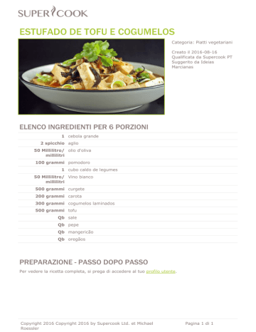 ESTUFADO DE TOFU E COGUMELOS Categoria: Piatti vegetariani Creato il 2016-08-16 Qualificata da Supercook PT Suggerito da Ideias Marcianas ELENCO INGREDIENTI PER 6 PORZIONI 1 cebola grande 2 spicchio aglio 50 Millilitro/ olio d'oliva millilitri 100 grammi pomodoro 1 cubo caldo de legumes 50 Millilitro/ Vino bianco millilitri 500 grammi curgete 200 grammi carota 300 grammi cogumelos laminados 500 grammi tofu Qb sale Qb pepe Qb mangericão Qb oregãos PREPARAZIONE - PASSO DOPO PASSO Per vedere la ricetta completa, si prega di accedere al tuo profilo utente. Copyright 2016 Copyright 2016 by Supercook Ltd. et Michael Roessler Powered by TCPDF (www.tcpdf.org) Pagina 1 di 1