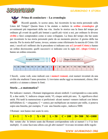 SCUBlMONDO 4 STORlA Prima di cominciare – La cronologia Ricordi quando, lo scorso anno, hai ricostruito la tua storia personale sulla Linea del Tempo? Questa linea ti ha aiutato a mettere in ordine cronologico gli avvenimenti più importanti della tua vita. Anche lo storico usa la linea del tempo per ordinare gli eventi da quelli più lontani a quelli più vicini a noi, per ordinare le diverse civiltà e farci comprendere come si sono sviluppate. La linea del tempo che hai usato per ricostruire la tua storia personale parte da un momento preciso: il giorno della tua nascita. Per la storia dell’uomo, invece, usiamo come riferimento la nascita di Cristo. Gli anni, i secoli ed i millenni che la precedono si indicano con a.C.(avanti Cristo) e hanno un ordine decrescente; quelli successivi si indicano con la sigla d.C. (dopo Cristo) e hanno un ordine crescente. Avanti Cristo (a.C.) X IX VIII VII VI V IV Dopo Cristo (d.C.) III II I I II III IV V VI VII VIII IX X I Secoli, come vedi, sono indicati con i numeri romani, cioè numeri inventati da una civiltà che studierai l’anno prossimo. Li troviamo anche oggi su monumenti, chiese, libri antichi e ci aiutano a datare le fonti. Storia …o matematica? Per indicare i numeri, i Romani impiegarono alcuni simboli: I corrispondeva a una unità; II, a due unità; V, indicava cinque unità; VI, cinque unità più uno; X, significava dieci unità. Più tardi la numerazione si perfezionò: alcuni numeri vennero indicati con lettere dell'alfabeto (L = cinquanta; C = cento); per moltiplicare un numero per mille, si poneva sopra una lineetta, per esempio, V con una lineetta sopra , indicava 5000. I Romani non hanno mai usato lo zero. I=1 V=5 X = 10 L = 50 C = 100 D= 500 M =1000 Hai notato che le lettere usate dai Romani corrispondono solo ai numeri 1 e 5 (e loro multipli) . E come facevano allora con gli altri numeri? Avevano inventato delle regole: WWW.SCUBlMONDO.ORG Fino al numero 3 veniva scritta tre volte la lettera corrispondente all'unità, ad esempio: III = 3 oppure CCC = 300 Per i tre numeri successivi a quelli contrassegnati dalla lettera si aggiungeva , a destra, l’unità VI = 5 + 1 = 6 VII = 5 + 2 = 7 VIII = 5 + 3 = 8 XI = 10 +1 = 11 LI = 50 + 1 = 51 I "caratteri di decina" (I, X, C, e M) potevano essere ripetuti fino a tre volte. (III = 3, XXX = 30, CCC =300, MMM =3000) Per il numero quattro e tutti gli altri che cominciavano con 4, si deve sottrarre uno dal più vicino "carattere di quintina" V, L, D ( IV = 4 , XL = 40 , CD= 400) per i numeri 9, 19, 29 ecc. si sottraeva l’unità dal numero più grande successivo, come con il numero 4 (IX = 9, XC = 90, CM= 900 ) Prova a scrivere i numeri come gli antichi Romani Immagina di essere un antico Romano e prova a scrivere i numeri nella tabella. Numero Numeri arabi Numeri romani La tua età L’età della tua mamma Il numero dei bambini della tua classe L’anno in cui sei nato L’anno in cui sei andato per la prima volta a scuola L’anno corrente WWW.SCUBlMONDO.ORG I “nomi” dei numeri Romani I PRIMO XI UNDICESIMO II SECONDO XII DODICESIMO III TERZO XIII TREDICESIMO IV QUARTO XIV QUATTORDICESIMO V QUINTO XV QUINDICESIMO VI SESTO XVI SEDICESIMO VII SETTIMO XVII DICIASSETTESIMO VIII OTTAVO XVIII DICIOTTESIMO IX NONO XIX DICIANNOVESIMO X DECIMO XX VENTESIMO Hai notato che, a parte i primi 10 numeri, la trasformazione in numero romano è semplice: basta togliere l'ultima lettera e aggiungere – esimo ! Per esempio: dodic-i = dodic-esimo STORIA E CRONOLOGIA Abbiamo imparato che lo Storico ordina i fatti sulla linea del tempo. Alcuni fatti sono accaduti in date precise, per altri invece dobbiamo indicare un periodo che può essere breve o lunghissimo. Per farsi capire meglio, lo storico usa diverse misure del tempo: l’anno – che dura 365 giorni il secolo – che dura 100 anni il millennio – che dura 1000 anni l’era – che dura milioni di anni Abbiamo anche imparato che per le date della storia prendiamo come punto di riferimento la nascita di Cristo (anno 0), che i fatti avvenuti prima della sua nascita vengono definiti avanti Cristo (a.C.) e si contano all’indietro e che i fatti dopo la sua nascita vengono definiti dopo Cristo (d.C.) e si contano in avanti a partire dall’anno zero. Ma la linea del Tempo ci riserva delle sorprese …. WWW.SCUBlMONDO.ORG Quale dei due? Sotto la dicitura “Numerazione romana” trovi due colonne con i numeri, solo uno dei due è il numero giusto. Segnalo con un colore, come nell’esempio. Numerazione Araba Numerazione Romana 1 X I 2 II V 3 C III 4 IV VI 5 C V 6 IV VI 7 IIV VII 8 VIII IIIV 9 IX XI 10 X D 12 DII XII 15 VX XV 19 IXX XIX 50 L C 100 C L 500 C D 1000 XD M 2011 MMXI MMIX WWW.SCUBlMONDO.ORG