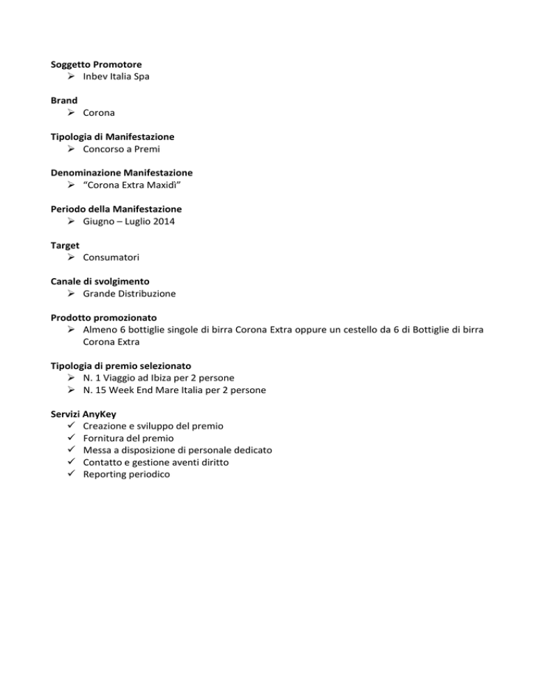 Soggetto Promotore Inbev Italia Spa Brand Corona Tipologia di Manifestazione Concorso a Premi Denominazione Manifestazione “Corona Extra Maxidì” Periodo della Manifestazione Giugno – Luglio 2014 Target Consumatori Canale di svolgimento Grande Distribuzione Prodotto promozionato Almeno 6 bottiglie singole di birra Corona Extra oppure un cestello da 6 di Bottiglie di birra Corona Extra Tipologia di premio selezionato N. 1 Viaggio ad Ibiza per 2 persone N. 15 Week End Mare Italia per 2 persone Servizi AnyKey Creazione e sviluppo del premio Fornitura del premio Messa a disposizione di personale dedicato Contatto e gestione aventi diritto Reporting periodico