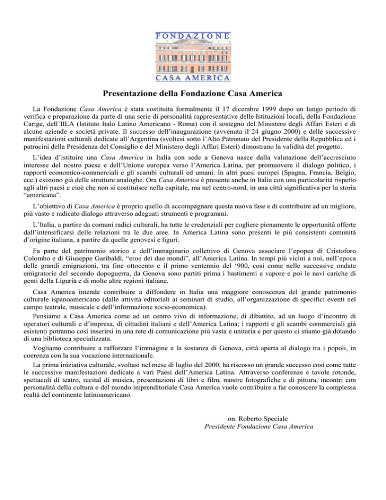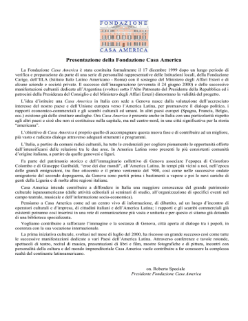 Presentazione della Fondazione Casa America La Fondazione Casa America è stata costituita formalmente il 17 dicembre 1999 dopo un lungo periodo di verifica e preparazione da parte di una serie di personalità rappresentative delle Istituzioni locali, della Fondazione Carige, dell’IILA (Istituto Italo Latino Americano - Roma) con il sostegno del Ministero degli Affari Esteri e di alcune aziende e società private. Il successo dell’inaugurazione (avvenuta il 24 giugno 2000) e delle successive manifestazioni culturali dedicate all’Argentina (svoltesi sotto l’Alto Patronato del Presidente della Repubblica ed i patrocini della Presidenza del Consiglio e del Ministero degli Affari Esteri) dimostrano la validità del progetto. L’idea d’istituire una Casa America in Italia con sede a Genova nasce dalla valutazione dell’accresciuto interesse del nostro paese e dell’Unione europea verso l’America Latina, per promuovere il dialogo politico, i rapporti economico-commerciali e gli scambi culturali ed umani. In altri paesi europei (Spagna, Francia, Belgio, ecc.) esistono già delle strutture analoghe. Ora Casa America è presente anche in Italia con una particolarità rispetto agli altri paesi e cioè che non si costituisce nella capitale, ma nel centro-nord, in una città significativa per la storia “americana”. L’obiettivo di Casa America è proprio quello di accompagnare questa nuova fase e di contribuire ad un migliore, più vasto e radicato dialogo attraverso adeguati strumenti e programmi. L’Italia, a partire da comuni radici culturali, ha tutte le credenziali per cogliere pienamente le opportunità offerte dall’intensificarsi delle relazioni tra le due aree. In America Latina sono presenti le più consistenti comunità d’origine italiana, a partire da quelle genovesi e liguri. Fa parte del patrimonio storico e dell’immaginario collettivo di Genova associare l’epopea di Cristoforo Colombo e di Giuseppe Garibaldi, “eroe dei due mondi”, all’America Latina. In tempi più vicini a noi, nell’epoca delle grandi emigrazioni, tra fine ottocento e il primo ventennio del ‘900, così come nelle successive ondate emigratorie del secondo dopoguerra, da Genova sono partiti prima i bastimenti a vapore e poi le navi cariche di genti della Liguria e di molte altre regioni italiane. Casa America intende contribuire a diffondere in Italia una maggiore conoscenza del grande patrimonio culturale ispanoamericano (dalle attività editoriali ai seminari di studio, all’organizzazione di specifici eventi nel campo teatrale, musicale e dell’informazione socio-economica). Pensiamo a Casa America come ad un centro vivo di informazione, di dibattito, ad un luogo d’incontro di operatori culturali e d’impresa, di cittadini italiani e dell’America Latina; i rapporti e gli scambi commerciali già esistenti potranno così inserirsi in una rete di comunicazione più vasta e unitaria e per questo ci stiamo già dotando di una biblioteca specializzata. Vogliamo contribuire a rafforzare l’immagine e la sostanza di Genova, città aperta al dialogo tra i popoli, in coerenza con la sua vocazione internazionale. La prima iniziativa culturale, svoltasi nel mese di luglio del 2000, ha riscosso un grande successo così come tutte le successive manifestazioni dedicate a vari Paesi dell’America Latina. Attraverso conferenze e tavole rotonde, spettacoli di teatro, recital di musica, presentazioni di libri e film, mostre fotografiche e di pittura, incontri con personalità della cultura e del mondo imprenditoriale Casa America vuole contribuire a far conoscere la complessa realtà del continente latinoamericano. on. Roberto Speciale Presidente Fondazione Casa America Fondazione Casa America Membri del Consiglio d’Amministrazione On. Roberto Speciale; amb. Giorgio Malfatti di Monte Tretto, Segretario Generale IILA Istituto Italo-Latino Americano; Federico Massone, LPL Italia; Luigi Merlo, Presidente Autorità Portuale di Genova; Angelo Berlangieri, Regione Liguria; amb. Bernardino Osio; Piera Ponta, Assindustria Provincia di Genova; Provincia di Genova; Andrea Torre per il Comune di Genova; prof. Victor Uckmar, Presidente Società Italia-Argentina. Cariche statutarie Presidente: Roberto Speciale, Vicepresidente: Victor Uckmar Membri del Comitato Scientifico Per l’Università di Genova: Giacomo Deferrari, rettore; Gabriella Airaldi, Storia Medioevale, Facoltà di Lettere e Filosofia; Alberto Capacci, Geografia Politica ed Economica, Facoltà di Scienze Politiche; Giuliano Carlini, Sociologia dei Rapporti interculturali, Facoltà di Scienze Politiche; Clara Caselli, Economia e Gestione delle Imprese Internazionali, Facoltà di Economia, Decana de la Facultad de Ciencias Económicas y Comerciales, Universidad Católica Sedes Sapientiae, Lima; Paolo Comanducci, preside Facoltà di Giurisprudenza; Pier Luigi Crovetto, Letteratura e Cultura Spagnola, Facoltà di Lingue e Letterature Straniere; Amina Di Munno, Letteratura Portoghese, Facoltà di Lingue e Letterature straniere; Anna Maria Lazzarino Del Grosso, Storia delle Dottrine Politiche, Facoltà di Scienze Politiche; Adele Maiello, Storia Contemporanea, Facoltà di Scienze Politiche; Augusta Molinari, Storia Contemporanea, Facoltà di Scienze della Formazione; Franco Praussello, Economia Internazionale, Facoltà di Scienze Politiche; Giancarlo Rolla, Diritto Costituzionale, Facoltà di Giurisprudenza; Giovanna Rosso del Brenna, Archeologia Industriale, Facoltà di Lettere e Filosofia; Franco Sborgi, Storia dell’Arte Contemporanea, Facoltà di Lettere e Filosofia; Francesco Surdich, Storia delle Esplorazioni e delle Scoperte Geografiche, Facoltà di Lettere e Filosofia Chiara Vangelista, Storia dell’America Latina, Facoltà di Lingue e Letterature Straniere. Marco Cipolloni, Lingue e Letterature Ispanoamericane - Università di Modena e Reggio Emilia; Federico Di Roberto, Consigliere diplomatico Regione Liguria; Marco Ferrari, giorn