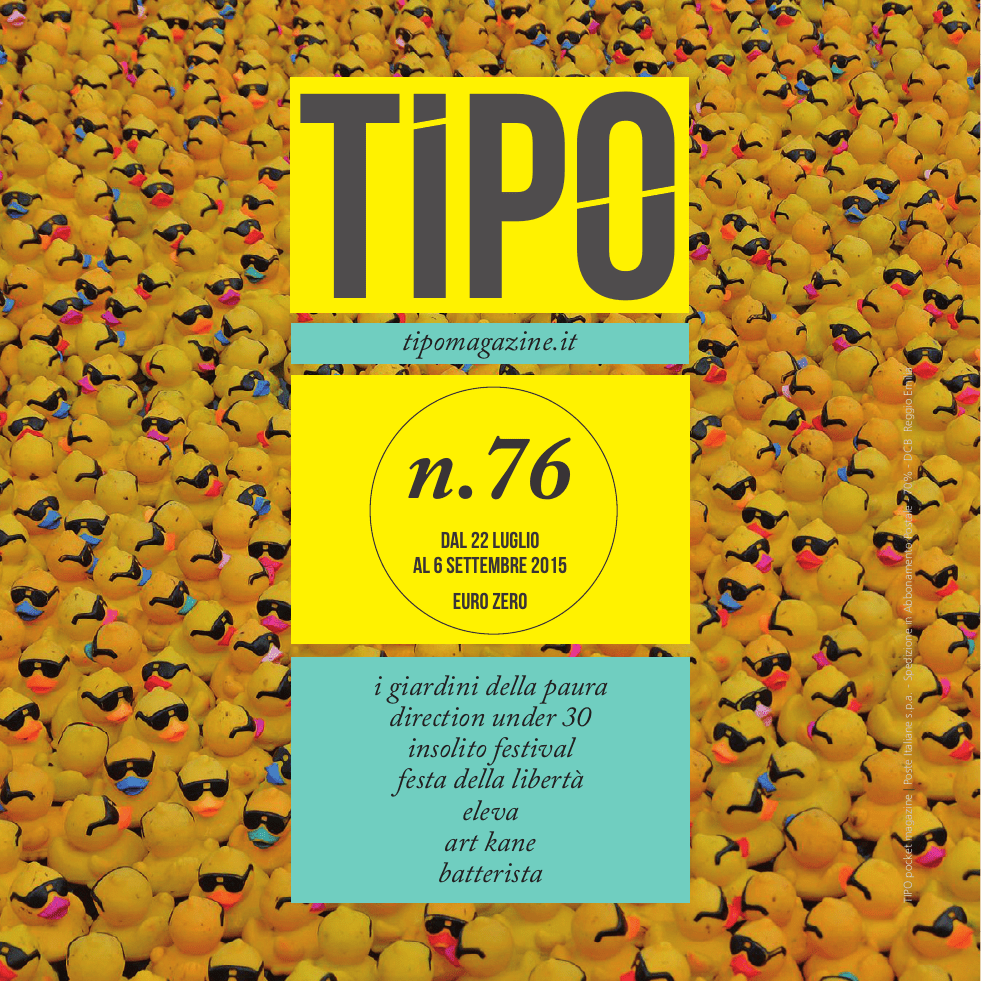 tipomagazine.it n.76 dal 22 luglio al 6 settembre 2015 euro zero i giardini della paura direction under 30 insolito festival festa della libertà eleva art kane batterista TIPO pocket magazine | Poste Italiane s.p.a. - Spedizione in Abbonamento Postale - 70% - DCB Reggio Emilia TIPO anteprima spettacoli OCHI&FIAMME 21.8 2MANYDJ U F 8 . 20 NG OF FOUR 23.8 TÊTES D S A E 23.8 GTHE PRODIGY 26.8 PAOLO HENBOIS 25.8 PHA BLONDY 1.9 FUOCHI DAN DEL L Z 28.8 A9 RAUL CREMONA 5.9 DJ PREMIEANTI 2. OLO CEVOLI 9.9 VAN DE SF R 8.9 PA 12.9 CARMEN CONSOLI ROOS #haicapito di Max Cavassa Luglio, agosto. Città lasciate in tutta fretta, lì, così. C’è una cosa che adoro moltissimo, ce ne sono anche altre, ma quella l’adoro moltissimo: il garrire delle rondini al mattino, nella città vuota. Mio nonno non è mica mai andato in vacanza. Mio babbo non credo, non ricordo. Io sì, ci sono stato, mi ricordo. Ma il garrire delle rondini al mattino, nella città vuota, non so perché, non so perché. TIPO Stampa: Digiterl Tipolitografia dei F.lli Terzi, via Don P.Borghi - San Martino in Rio (RE) TIPO pocket magazine mensile culturale, numero 76 autorizzazione del Tribunale di Reggio Emilia, n. 1172 del 3/11/2006 Redazione e pubblicità: tel. 328 5364109 email [email protected] Direttore editoriale: Max Cavassa Direttore responsabile: Luca Vecchi Hanno collaborato: Alberto Zanetti, Federica Galli, Luca Di Mira, Valeria Iotti, Monica Riccò Panciroli Foto in copertina (dettaglio): Dennis Jarvis www.flickr.com/photos/ archer10/2920639338/ Lʼeditore è a disposizione per eventuali diritti d’autore degli aventi diritto con i quali non è stato possibile comunicare e per eventuali non volute omissioni nella citazione delle foto riprodotte. Lʼeditore non è responsabile per lʼuso di marchi, foto e slogan da parte degli inserzionisti e per eventuali cambiamenti ed errori nelle date e negli orari degli appuntamenti segnalati. Si raccomanda di verificare sempre telefonicamente l’effettivo svolgimento degli eventi. Nessuna parte della pubblicazione può essere riprodotta o rielaborata in qualsiasi forma senza il consenso dell’editore. Pocket Magazine normalmente segnala le date nel raggio di circa 100 km, per l’elenco completo consultare i siti ufficiali degli artisti. cose belle concerti e djset DAL 22 AL 26 luglio sergio cammariere + fabrizio bosso mercoledì 22 luglio Modena, Giardini Ducali Ben Harper & the Innocent Criminals mercoledì 22 luglio Assago (MI), Summer Arena teatro Verucchio (RN), Verrucchio Festival mercoledì 22 luglio Gualtieri (RE), Teatro Sociale 25 anni insieme. Le più belle colonne sonore del Cinema Italiano Momix. W Momix Forever giovedì 23 luglio “Mundus” Reggio E., Piazza Prampolini fast animal and slow kids mercoledì 22 luglio Nneka mercoledì 22 luglio Sestri Levante (GE), Mojotic Festival Abbiamo la nuova Lauryn Hill? Impegno sociale, suoni afro-soul, reggae e freschezza pop. Questi gli ingredienti del successo della cantautrice nigeriana. Nneka Torneo di Bigliardino del Vizi Carpi (MO), Cantina di Carpi e Sorbara mercoledì 22 luglio Arzân! Merano (BZ), World Music Festival Parma, Piazza Duomo Fosdondo (RE), I Vizi del Pellicano Certi locali hanno la geniale idea di avere un bigliardino. Quelli dei Vizi hanno fatto anche di più, organizzando un torneo. È vero che è estate e fa caldo ma in palio ci sono freschissime birre. mostre giovedì 23 luglio mercoledì 22 luglio con Francesca Salvemini, flauto, e Silvana Libard, pianoforte Lucca, Piazza Napoleone Modena, Off Unica data estiva per la nuova voce del soul americano che presenta l’album d’esordio. Tra i suoi riferimenti tanto la Motown e Muddy Waters quanto Lou Reed e i Black Keys. (m.c.) cinema Avion Travel mercoledì 22 luglio mercoledì 22 luglio sagre the kooks mercoledì 22 luglio mark knopfler curtis harding eventi giovedì 23 luglio Segrate (MI), Magnolia notwist giovedì 23 luglio Verucchio (RN), Verucchio Festival verdena giovedì 23 luglio Brescia, Musicalzoo Sono pochi gli appassionati di rock che non hanno visto uno dei concerti di presentazione, spesso sold out, di Endkadenz Vol. 1. È il momento di sbrigarsi, però, a fine agosto esce il Vol. 2. giovedì 23 luglio l’orso + magellano + dente + marta dui tubi + lo stato sociale + ghemon robbie williams Marina di Ravenna (RA), Hana-Bi Reggio E., Ghirba Lucca, Piazza Napoleone giovedì 23 luglio SECRET DINNER + PRIDE cold specks Cortometraggi e “Finger” Drinks mercoledì 22 luglio mercoledì 22 luglio Reggio E., Arena Ex Stalloni foxhound Bologna, Chalet Giardini Margherita giovedì 23 luglio giovedì 23 luglio Bologna, Bolognetti Rocks giovedì 23 luglio franco battiato Parma, Piazza Duomo DRYWET + CAPIBARA giovedì 23 luglio Collecchio (PR), Fattoria di Vigheffio Vintage Violence giovedì 23 luglio Correggio (RE), Festa Democratica SoloMacello Fest 2015 – Episodio II giovedì 23 luglio Milano, Arci Lo-Fi anna calvi venerdì 24 luglio Rimini, Corte degli Agostiniani ruggero de i timidi venerdì 24 luglio Sesto San Giovanni (MI), Carroponte La vita in rosa “Rassegna GRADE onlus” giovedì 23 luglio Reggio E., Chiostri di San Pietro Un viaggio attraverso la vita e le canzoni di Edith Piaf, raccontato e cantato da Sabrina Paglia con gli arrangiamenti musicali di Ovidio Bigi. La serata è parte della rassegna di solidarietà per raccogliere fondi a favore del Gruppo Amici dell’Ematologia. foxhound + c’mon tigre venerdì 24 luglio siam venuti a cantar baggio Marina di Ravenna (RA), Hana-Bi Di giorno è una spiaggia normale, di sera diventa l’Hana-Bi. Dal vivo l’afrobeat contaminato da freejazz e world music del collettivo C’Mon Tigre e l’indie rock obliquo dei torinesi Foxhound. Milano, Giardini Triennale venerdì 24 luglio 23, 24, 25 luglio Banda Rullifrulli Il Gallo siamo noi venerdì 24 luglio Ca de’ Caroli (RE), Arci Ciminiere Una serata dedicata alla memoria di Don Andrea Gallo, in sostegno della sua Comunità di San Benedetto