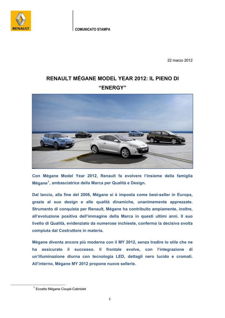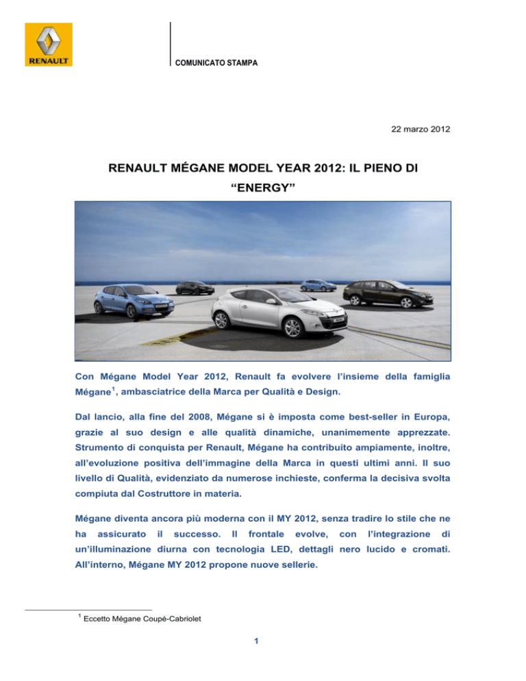 COMUNICATO STAMPA 22 marzo 2012 RENAULT MÉGANE MODEL YEAR 2012: IL PIENO DI “ENERGY” Con Mégane Model Year 2012, Renault fa evolvere l’insieme della famiglia Mégane 1 , ambasciatrice della Marca per Qualità e Design. Dal lancio, alla fine del 2008, Mégane si è imposta come best-seller in Europa, grazie al suo design e alle qualità dinamiche, unanimemente apprezzate. Strumento di conquista per Renault, Mégane ha contribuito ampiamente, inoltre, all’evoluzione positiva dell’immagine della Marca in questi ultimi anni. Il suo livello di Qualità, evidenziato da numerose inchieste, conferma la decisiva svolta compiuta dal Costruttore in materia. Mégane diventa ancora più moderna con il MY 2012, senza tradire lo stile che ne ha assicurato il successo. Il frontale evolve, con l’integrazione di un’illuminazione diurna con tecnologia LED, dettagli nero lucido e cromati. All’interno, Mégane MY 2012 propone nuove sellerie. 1 Eccetto Mégane Coupé-Cabriolet 1 Mégane MY 2012 diventa la berlina più sobria della categoria, grazie a tre nuove motorizzazioni Energy, dal contenuto altamente tecnologico, che si basano, in gran parte, sull’esperienza di Renault in F1: Innanzitutto, l’inedito propulsore Energy TCe 115, 1.2 l benzina, 4 cilindri a iniezione diretta sovralimentata, che si colloca tra i più potenti del mercato, con 115 cv disponibili a 4.500 g/min. Particolarmente dinamico, si distingue, inoltre, per la sobrietà, con un consumo di 5.3 l/100 km in ciclo NEDC (119 g di CO2/km) 1 . Per la gamma Diesel, Energy dCi 130 subentra al 1.9 dCi 130. Inaugurato su XMod e Scénic nel 2011, questo propulsore 1.6 l Diesel, di nuova generazione, associa piacere di guida e sobrietà, con un consumo di appena 4,0 l / 100 km ed emissioni di 104 g di CO2/km. Infine, Energy dCi 110, un 1.5 dCi rivisitato nello stesso spirito, stabilisce un nuovo record su Mégane, con emissioni di CO2 di 90 g/km ed un consumo di 3,5 l/100 km in ciclo NEDC. Per potenziare comfort e sicurezza, Mégane Model Year 2012 adotta gli equipaggiamenti di assistenza e confort di guida inaugurati dalle Nuove XMod e Scénic, quali il Visio System® o l’assistenza alle partenze in salita, ed inaugura una nuova gamma, particolarmente completa, di radio R-Plug&Radio+, proposte di serie fin dal primo livello di equipaggiamento. Il polo Renault Sport presenta, a sua volta, versioni GT Line e R.S. dal design più incisivo. Mégane R.S. guadagna 15 cv e 20 Nm e dispone oggi di 265 cavalli e 360 Nm. Mégane MY 2012 sarà commercializzata da marzo 2012 in Europa (in Italia da aprile) e negli altri paesi nel corso del 2012 (in particolare: Turchia, Israele, Marocco, Algeria, Tunisia, Sud Africa, Giappone, Russia e Argentina). 1 Consumi ed emissioni conformi al Regolamento (CE) 692/2008, ultimo emendamento. 2 2 SOMMARIO 01 NOVITÀ SOTTO IL COFANO 02 DESIGN ED EQUIPAGGIAMENTI 03 RENAULT MÉGANE, AMBASCIATRICE DEL “RENAULT QUALITY MADE” 04 UN POLO RENAULT SPORT ANCORA PIÙ DISTINTIVO --------------------------------------------------------------ALLEGATI: TECNOLOGIE, SCHEDE TECNICHE 3 01 5 NOVITÀ SOTTO IL COFANO L’evoluzione più significativa di Mégane Model Year 2012 si trova sotto il cofano, con l’arrivo di tre nuove motorizzazioni Energy, equipaggiate con Stop & Start e recupero dell’energia in frenata e decelerazione. Grazie ad un inedito contenuto tecnologico, in parte derivato dall’esperienza di Renault in F1, questi motori si rivelano particolarmente economici, nonostante un piacere di guida identico a quello di motorizzazioni di cilindrata superiore. Mégane Model Year 2012 è il primo modello a proporre i tre nuovi propulsori Energy, tra cui il modernissimo benzina, Energy TCe 115, che si affianca agli Energy dCi 110 (1.5 l) ed Energy dCi 130 (1.6 l). ENERGY TCe 115: PUGNO DI FERRO IN GUANTO DI VELLUTO Il ritorno delle motorizzazioni benzina Il propulsore 1.2 l di nuova generazione, che beneficia di numerose innovazioni, segna il ritorno di motorizzazioni benzina dinamiche e competitive in termini di costi di esercizio. Destinato a clienti che apprezzano il piacere di guida e la flessibilità dei benzina, Energy TCe 115 si rivela, al tempo stesso, una soluzione economicamente interessante per clienti con chilometraggio annuale medio (in funzione della fiscalità). Grinta Primo propulsore benzina Renault ad iniezione diretta sovralimentata, Renault Energy TCe 115 associa performance e basso consumo di carburante. Destinato a sostituire prossimamente il 1.6 16v, questo motore in alluminio da 1.198 cm3 vanta migliori performance (+ 5 cv, + 40 Nm), con una potenza di 115 cv ed una coppia massima di 190 Nm, paragonabile a quella di un 2 litri, disponibile per il 90% a 1.500 g/min e integralmente tra 2.000 e 4.000 g/min, grazie alla quale il motore si distingue per flessibilità e riprese ai bassi regimi, degne di un Diesel. 4 Emissioni di CO2 in calo del 25% Motorizzazione 1.2 l più performante del mercato, Renault Energy TCe 115 brilla anche per sobrietà, con consumi medi in calo del 25% Equipaggiata Mégane rispetto con Model al 1.6 questo Year 16v. propulsore, 2012 consuma soltanto 5,3 l/100 km nel ciclo NEDC, pari ad un guadagno di circa 1,5 l/100 km, con emissioni di CO2 limitate a 119 g/km 1 . Grazie al contenimento dei consumi, i costi di esercizio sono ridotti in modo significativo. La presenza di una catena di distribuzione che non richiede manutenzione contribuisce, a sua volta, alla riduzione dei costi di esercizio. Ovattato Grazie ad una messa a punto acustica particolarmente curata, il propulsore Energy TCe 115 dà prova di sonorità ovattata e di una grande morbidezza di funzionamento che contribuiscono al comfort dei passeggeri. Un inedito contenuto tecnologico: Iniezione diretta associata ad mediante turbo-collettore distribuzione una benzina turbo: sovralimentazione variabile, integrato con e doppio variatore di fase dell’albero a camme, consente di raggiungere la coppia massima fi