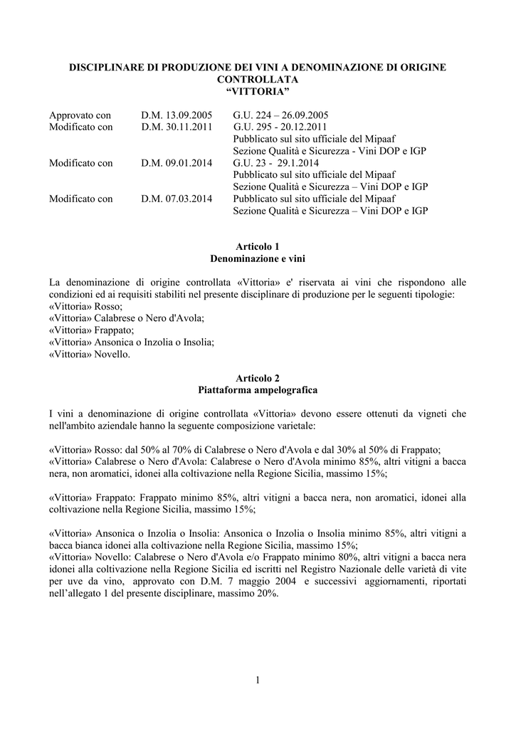 DISCIPLINARE DI PRODUZIONE DEI VINI A DENOMINAZIONE DI ORIGINE CONTROLLATA “VITTORIA” Approvato con Modificato con D.M. 13.09.2005 D.M. 30.11.2011 Modificato con D.M. 09.01.2014 Modificato con D.M. 07.03.2014 G.U. 224 – 26.09.2005 G.U. 295 - 20.12.2011 Pubblicato sul sito ufficiale del Mipaaf Sezione Qualità e Sicurezza - Vini DOP e IGP G.U. 23 - 29.1.2014 Pubblicato sul sito ufficiale del Mipaaf Sezione Qualità e Sicurezza – Vini DOP e IGP Pubblicato sul sito ufficiale del Mipaaf Sezione Qualità e Sicurezza – Vini DOP e IGP Articolo 1 Denominazione e vini La denominazione di origine controllata «Vittoria» e' riservata ai vini che rispondono alle condizioni ed ai requisiti stabiliti nel presente disciplinare di produzione per le seguenti tipologie: «Vittoria» Rosso; «Vittoria» Calabrese o Nero d'Avola; «Vittoria» Frappato; «Vittoria» Ansonica o Inzolia o Insolia; «Vittoria» Novello. Articolo 2 Piattaforma ampelografica I vini a denominazione di origine controllata «Vittoria» devono essere ottenuti da vigneti che nell'ambito aziendale hanno la seguente composizione varietale: «Vittoria» Rosso: dal 50% al 70% di Calabrese o Nero d'Avola e dal 30% al 50% di Frappato; «Vittoria» Calabrese o Nero d'Avola: Calabrese o Nero d'Avola minimo 85%, altri vitigni a bacca nera, non aromatici, idonei alla coltivazione nella Regione Sicilia, massimo 15%; «Vittoria» Frappato: Frappato minimo 85%, altri vitigni a bacca nera, non aromatici, idonei alla coltivazione nella Regione Sicilia, massimo 15%; «Vittoria» Ansonica o Inzolia o Insolia: Ansonica o Inzolia o Insolia minimo 85%, altri vitigni a bacca bianca idonei alla coltivazione nella Regione Sicilia, massimo 15%; «Vittoria» Novello: Calabrese o Nero d'Avola e/o Frappato minimo 80%, altri vitigni a bacca nera idonei alla coltivazione nella Regione Sicilia ed iscritti nel Registro Nazionale delle varietà di vite per uve da vino, approvato con D.M. 7 maggio 2004 e successivi aggiornamenti, riportati nell’allegato 1 del presente disciplinare, massimo 20%. 1 Articolo 3 Zona di produzione La zona di produzione del vino a denominazione di origine controllata «Vittoria» che include territori ricadenti in tre province limitrofe: Ragusa, Caltanissetta e Catania risulta delimitata come appresso: a) provincia di Ragusa: in tale provincia la zona di produzione comprende tutto il territorio dei comuni di Vittoria, Comiso, Acate, Chiaramonte Gulfi, Santa Croce Camerina e parte del territorio comunale di Ragusa. Tale porzione del territorio del comune di Ragusa e' delimitata tra i limiti territoriali di S. Croce Camerina e Vittoria, e tra il mare e la strada provinciale Castello di Donnafugata e seguendo la medesima fino al passaggio a livello della strada ferrata Comiso-Ragusa e lungo la stessa (la quale delimita la C.da Passolato) fino ad arrivare al passaggio a livello successivo che attraversa la strada rurale sino al congiungimento con la strada provinciale S. Croce Camerina-Comiso (al Km. 9,600 circa), proseguendo fino ad innestarsi con la stradella interpoderale per case Tommasi ed arrivare al limite territoriale con il comune di Vittoria; b) provincia di Caltanissetta: in tale provincia la zona di produzione comprende parte del territorio dei seguenti comuni: Niscemi, Gela, Riesi, Butera e Mazzarino ed e' delimitata come appresso: Comune di Niscemi. Parte del territorio comunale cosi' delimitata: iniziando a sud-est, dalla strada provinciale Caltagirone-Niscemi, a partire dal bivio con la strada consortile Valle Pileri-Ponte Gallo (al Km. 13 da Caltagirone), seguendo il vallone Terrana (limite tra le province di Catania e Caltanissetta) sino a Monte Paolo e risalendo a Sud-Ovest, fino ad arrivare a Case Iacona e raccordarsi con la strada consortile Mortelluzzo-Giardino del Fico, sino all'innesto con la strada provinciale CaltagironeNiscemi (esattamente al Km. 15 da Niscemi) e seguendo la medesima fino a ricongiungersi con il predetto bivio, con la strada consortile Valle Pileri-Ponte Gallo. Comune di Gela. Parte del territorio comprendente le contrade «Rinazzi», «Feudo Nobile», «Spina Santa», «Passo di Piazza», «Priolo Sottano», «Farello», «Monacella», «Piano Stella», «Valle Ambra», «Mignechi» e «Priolo Soprano»; cosi' delimitate: iniziando da nord dalla regia trazzera Gela-Niscemi all'altezza del confine intercomunale GelaNiscemi, percorrendo verso est tale confine sino a raggiungere il confine interprovinciale Caltanissetta-Catania; da qui percorrendolo verso sud, fino al confine interprovinciale Caltanissetta-Ragusa e lungo esso sino al Mare Mediterraneo; indi verso ovest per un breve tratto di costa, sino alla strada interpoderale Mignechi e lungo essa in direzione nord, sino alla strada vicinale Piana del Signore-Catarrosone e deviando verso ovest, lungo la stessa sino all'incrocio con la strada vicinale Spina Santa-Rizzuto percorrendola per un breve tratto sino all'incrocio con la s.s. n. 115 Centrale Sicula, da qui in direzione nord, lungo la strada vicinale Piana del Signore - Spina Santa sino all'innesto con la regia trazzera Gela-Niscemi e lungo la strada poderale PoggioChiancata sino all'incrocio con la strada vicinaleGela-Sabuci e percorrendola verso sud-ovest, sin all'incrocio con la strada vicinale Ponte Grande-Niscemi e da essa in direzione Nord sino a raggiungere il fiume Maroglio; seguendo il corso del fiume verso sud-ovest sino alla confluenza con il Fiume Gela; da qui risalendo il corso del Fiume Gela in direzione nord, fino alla presa della diga Grotticelli, quindi verso est, lungo la poderale che si diparte dalla diga sino all'innesto con la strada vicinale Grotticelli-Sabuci e lungo essa, a sud-est, fin al crocevia con la regia trazzera GelaNiscemi, la quale si percorre verso nord fino a confine intercomunale Gela-Niscemi. Comune di Riesi. Parte del territorio comunale comprendente la contrada Castellazzo, cosi' delimitata: a sud la trazzera Riesi-Mazzarino-Pietraperzia, a 