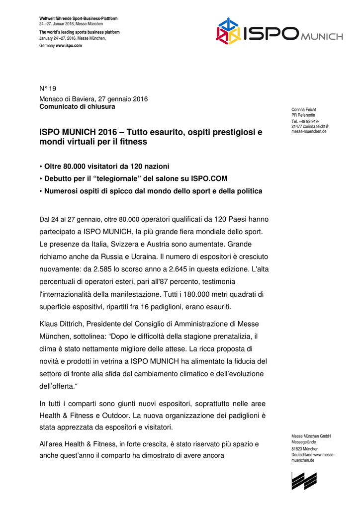 Weltweit führende Sport-Business-Plattform 24.–27. Januar 2016, Messe München The world’s leading sports business platform January 24 –27, 2016, Messe München, Germany www.ispo.com N° 19 Monaco di Baviera, 27 gennaio 2016 Comunicato di chiusura ISPO MUNICH 2016 – Tutto esaurito, ospiti prestigiosi e mondi virtuali per il fitness Corinna Feicht PR Referentin Tel. +49 89 94921477 corinna.feicht@ messe-muenchen.de • Oltre 80.000 visitatori da 120 nazioni • Debutto per il “telegiornale” del salone su ISPO.COM • Numerosi ospiti di spicco dal mondo dello sport e della politica Dal 24 al 27 gennaio, oltre 80.000 operatori qualificati da 120 Paesi hanno partecipato a ISPO MUNICH, la più grande fiera mondiale dello sport. Le presenze da Italia, Svizzera e Austria sono aumentate. Grande richiamo anche da Russia e Ucraina. Il numero di espositori è cresciuto nuovamente: da 2.585 lo scorso anno a 2.645 in questa edizione. L'alta percentuali di operatori esteri, pari all'87 percento, testimonia l'internazionalità della manifestazione. Tutti i 180.000 metri quadrati di superficie espositivi, ripartiti fra 16 padiglioni, erano esauriti. Klaus Dittrich, Presidente del Consiglio di Amministrazione di Messe München, sottolinea: “Dopo le difficoltà della stagione prenatalizia, il clima è stato nettamente migliore delle attese. La ricca proposta di novità e prodotti in vetrina a ISPO MUNICH ha alimentato la fiducia del settore di fronte alla sfida del cambiamento climatico e dell’evoluzione dell’offerta.“ In tutti i comparti sono giunti nuovi espositori, soprattutto nelle aree Health & Fitness e Outdoor. La nuova organizzazione dei padiglioni è stata apprezzata da espositori e visitatori. All’area Health & Fitness, in forte crescita, è stato riservato più spazio e anche quest’anno il comparto ha dimostrato di avere ancora Messe München GmbH Messegelände 81823 München Deutschland www.messemuenchen.de Pag.e 2 ampi margini di crescita nell’industria dello sport. Il fitness diventa sempre più digitale e in futuro sarà possibile allenarsi anche nel mondo virtuale, come ha dimostrato efficacemente il vincitore assoluto degli ISPO BRANDNEW AWARDS: “Icaros” è la prima apparecchiatura fitness in realtà virtuale che consente all’utilizzatore di volare attraverso mondi virtuali e giocare con l’ausilio di un casco e un controller. In questo modo si allenano praticamente tutti i muscoli del corpo. Per la prima volta tutti gli addetti ai lavori hanno potuto seguire sul nuovo sito ISPO.COM gli avvenimenti giornalieri della manifestazione. In futuro attraverso questo canale verranno trasmesse notizie di settore per tutto l’anno. Il sito è gestito da una vera e propria redazione e fornisce notizie e servizi dal mondo dell'industria dell'articolo sportivo. ISPO MUNICH non attira solo espositori e visitatori da tutto il mondo, ma anche atleti e politici famosi. Fra gli ospiti più prestigiosi, oltre all’allenatore del Bayern Pep Guardiola sono giunti in fiera anche la scalatrice e vincitrice della Coppa ISPO Gerlinde Kaltenbrunner e l’excampione olimpico di sollevamento pesi Matthias Steiner. Fra gli altri personaggi di spicco ricordiamo Philipp Lahm, capitano del FC Bayern München, e la pattinatrice veloce Claudia Pechstein. Ma ci sono stati anche Danny MacAskill, il più famoso atleta del Bike-Trial al mondo, e il due volte campione olimpico e cinque volte campione mondiale di sci Ted Ligety. La Federation of the European Sporting Goods Industry (FESI) vuole promuovere la collaborazione fra l’industria degli articoli sportivi e la Commissione Europea. L’associazione rappresenta 1.800 aziende che detengono una quota dell’85 percento del mercato europeo. Nell’ambito di ISPO MUNICH ha organizzato un incontro fra i CEO di importanti aziende dello sport come Salomon, Nike, Adidas e Puma, e rappresentanti della Commissione Europea, fra i quali Pag. 3 il Vicepresidente e Commissario per il Mercato Unico Digitale, Andrus Ansip. Gli imprenditori hanno esposto ai politici le loro esigenze relativamente al mercato digitale. Il Ministro Tedesco per la Collaborazione e lo Sviluppo Economico Dott. Gerd Müller ha parlato di un progetto finalizzato alla produzione di tessuti sostenibili che dovrebbe migliorare le condizioni di produzione dell’abbigliamento. Sono giunti ospiti anche da molto lontano, come il Ministro dello Sport brasiliano George Hilton, che ha fatto il punto della situazione nel suo Paese alla vigilia dei Giochi Olimpici che si svolgeranno a Rio de Janeiro. La prossima edizione di ISPO MUNICH si svolgerà da domenica 5 a mercoledì 8 febbraio 2017. Per maggiori informazioni su ISPO MUNICH 2016 visitate il sito www.ispo.com o la pagina Facebook www.facebook.com/ispomunich Per scaricare immagini del salone, cliccate qui, mentre i filmati sono disponibili su ISPO TV. Dichiarazioni di espositori italiani a ISPO MUNICH 2016: Reiner Gerstner, Group Brand & Marketing Director, Salewa, Italia: Il raggio d’azione di ISPO è cambiato molto negli ultimi anni. Viviamo in un mondo connesso su scala globale, dove tutta l'attenzione si concentra su Monaco di Baviera per quattro giornate di fiera. Negli altri 360 giorni possiamo interagire con i nostri pubblici di riferimento attraverso i canali digitali di ISPO. In fiera incontriamo i nostri referenti più importanti nel settore e altri protagonisti come Greenpeace. È un appuntamento importante per Pag. 4 soddisfare le esigenze dei nostri clienti. Solo capendo le sfide per il futuro possiamo agire tutti insieme e migliorare continuamente il mondo. Giacomo Bertocco, Responsabile Marketing, Gruppo Tecnica, Italia: Siamo molto soddisfatti dell’andamento del salone e abbiamo indubbiamente raggiunto i nostri obiettivi. Per noi è un must partecipare a ISPO MUNICH, perché in molti anni di presenza abbiamo un lungo curriculum di successi. È semplicemente l’evento più importante per lo sport business... a l